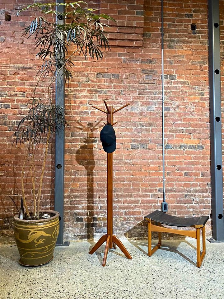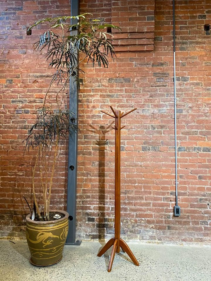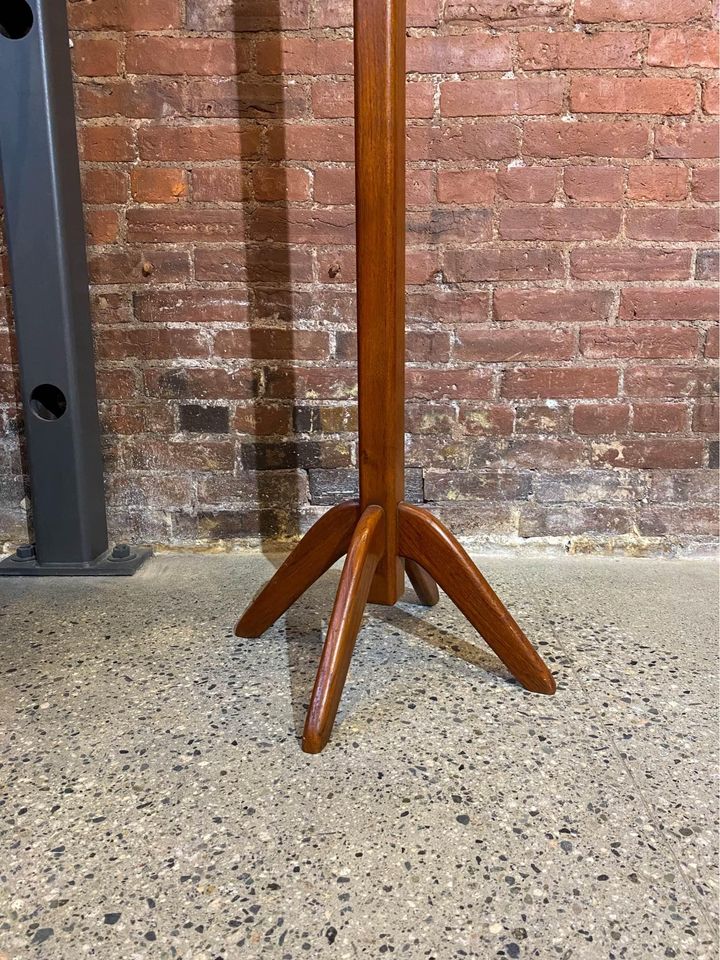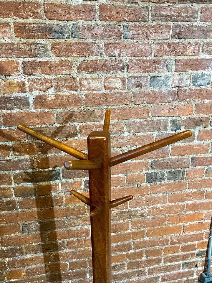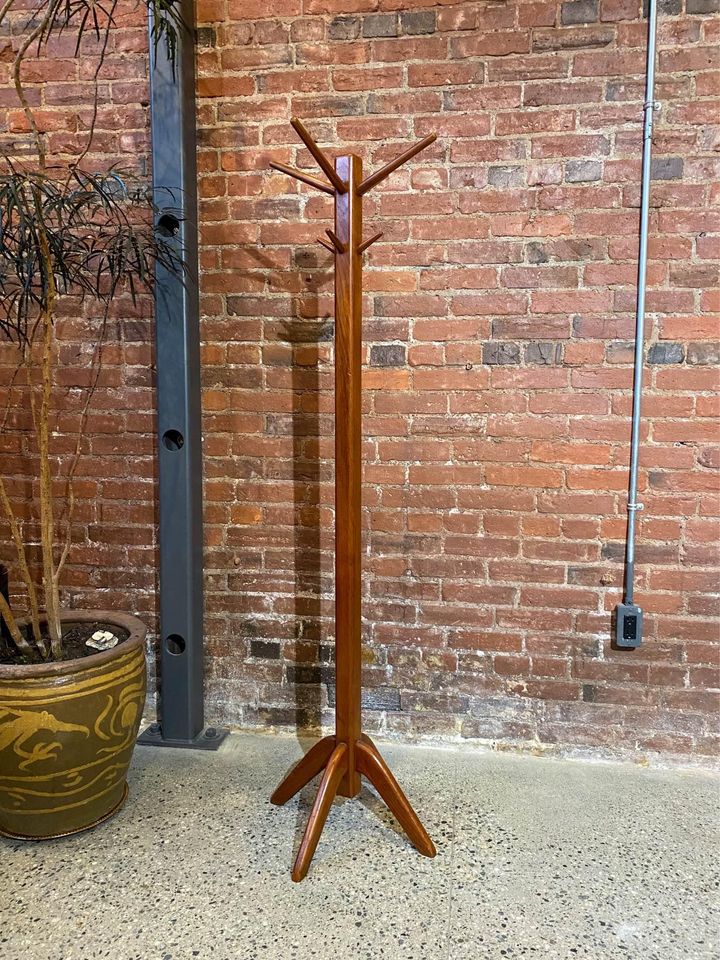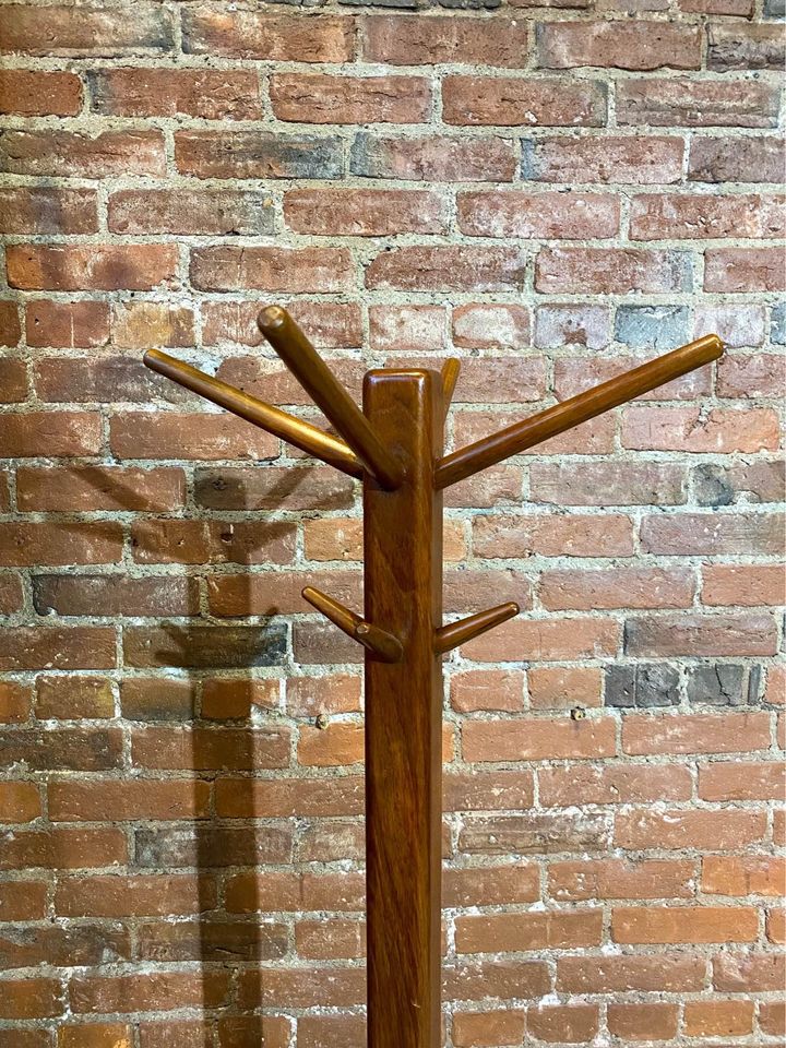 Hard to find mid century solid teak coat rack made right here in Canada circa 1960s. This piece has an interesting angular design, original finish, and is in good condition.
