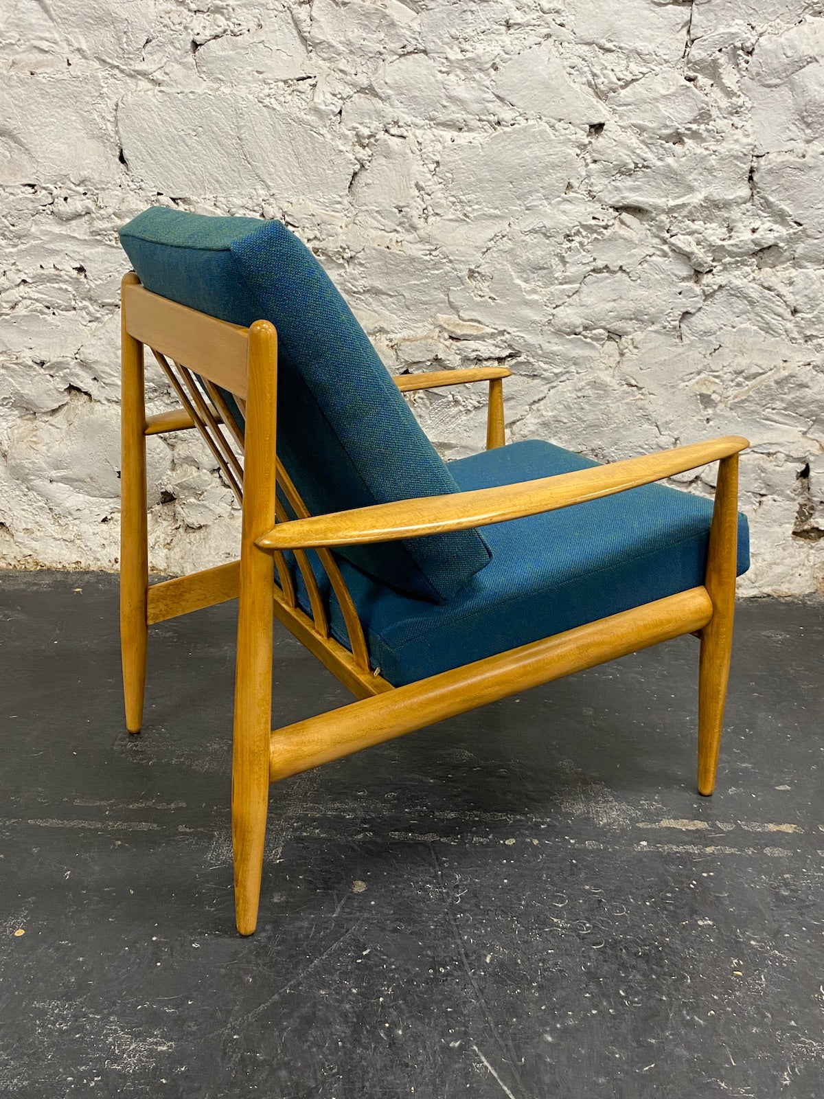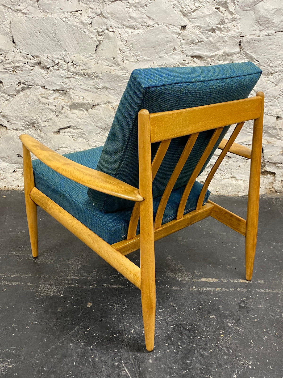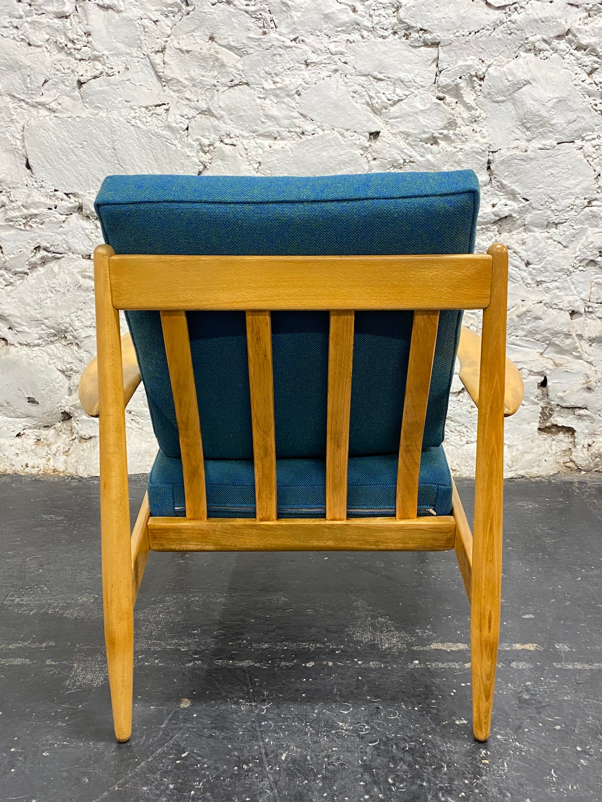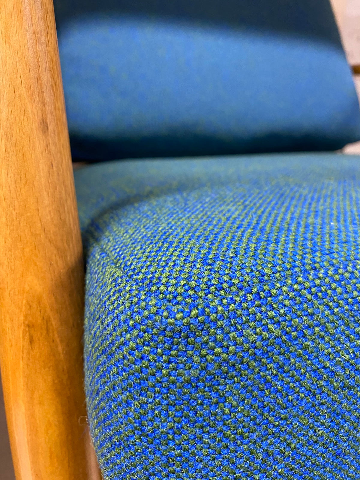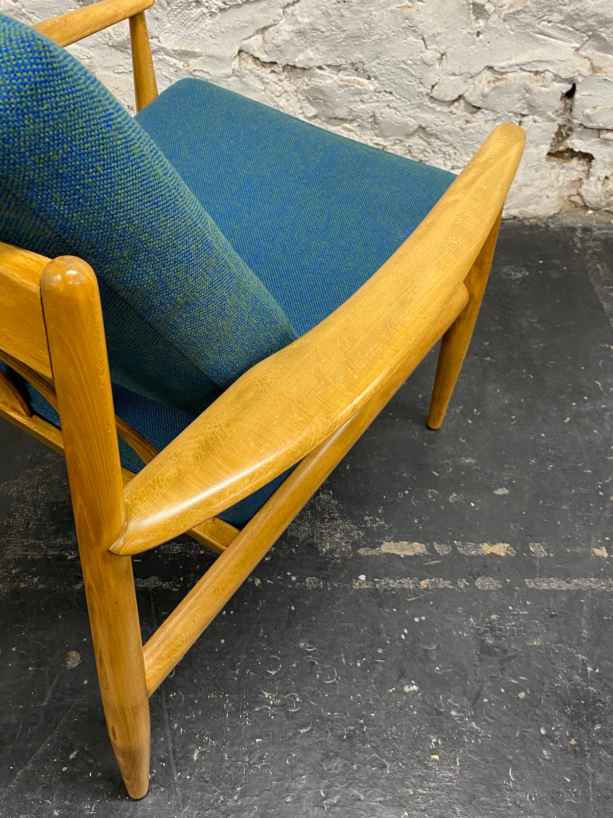 Grete Jalks designs for France & Daverkosen were widely successful in sales back in the day, and are still famous today. The elegant armrests of the 118 series are a pleasure to touch and feel. It also has a surprisingly small footprint, while providing a generous and comfortable seat. This particular model is comprised of solid beech, and is freshly restored. The cushions are covered in new Danish wool blend “Hallingdal” fabric by Kvadrat Textiles.
