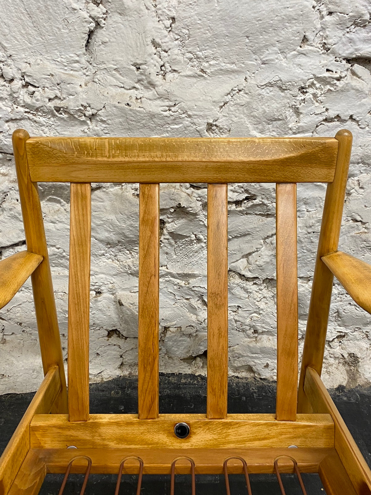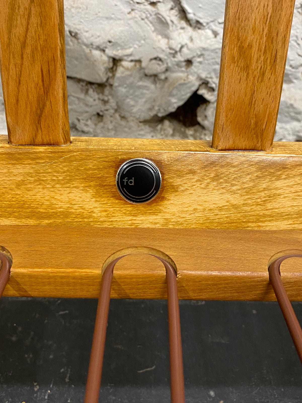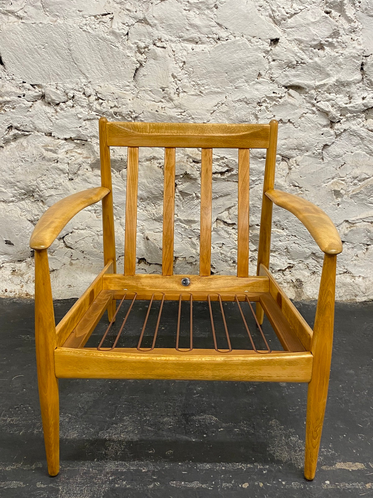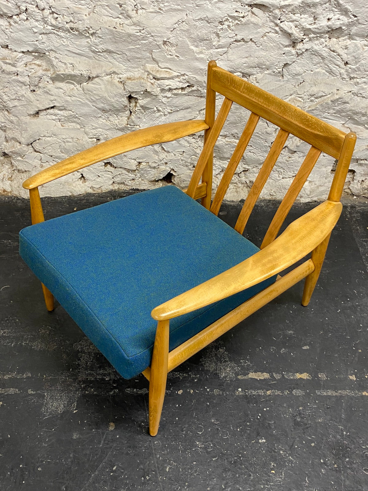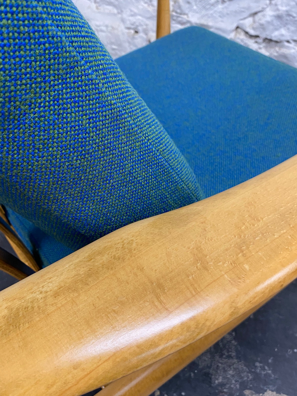 Grete Jalks designs for France & Daverkosen were widely successful in sales back in the day, and are still famous today. The elegant armrests of the 118 series are a pleasure to touch and feel. It also has a surprisingly small footprint, while providing a generous and comfortable seat. This particular model is comprised of solid beech, and is freshly restored. The cushions are covered in new Danish wool blend “Hallingdal” fabric by Kvadrat Textiles.