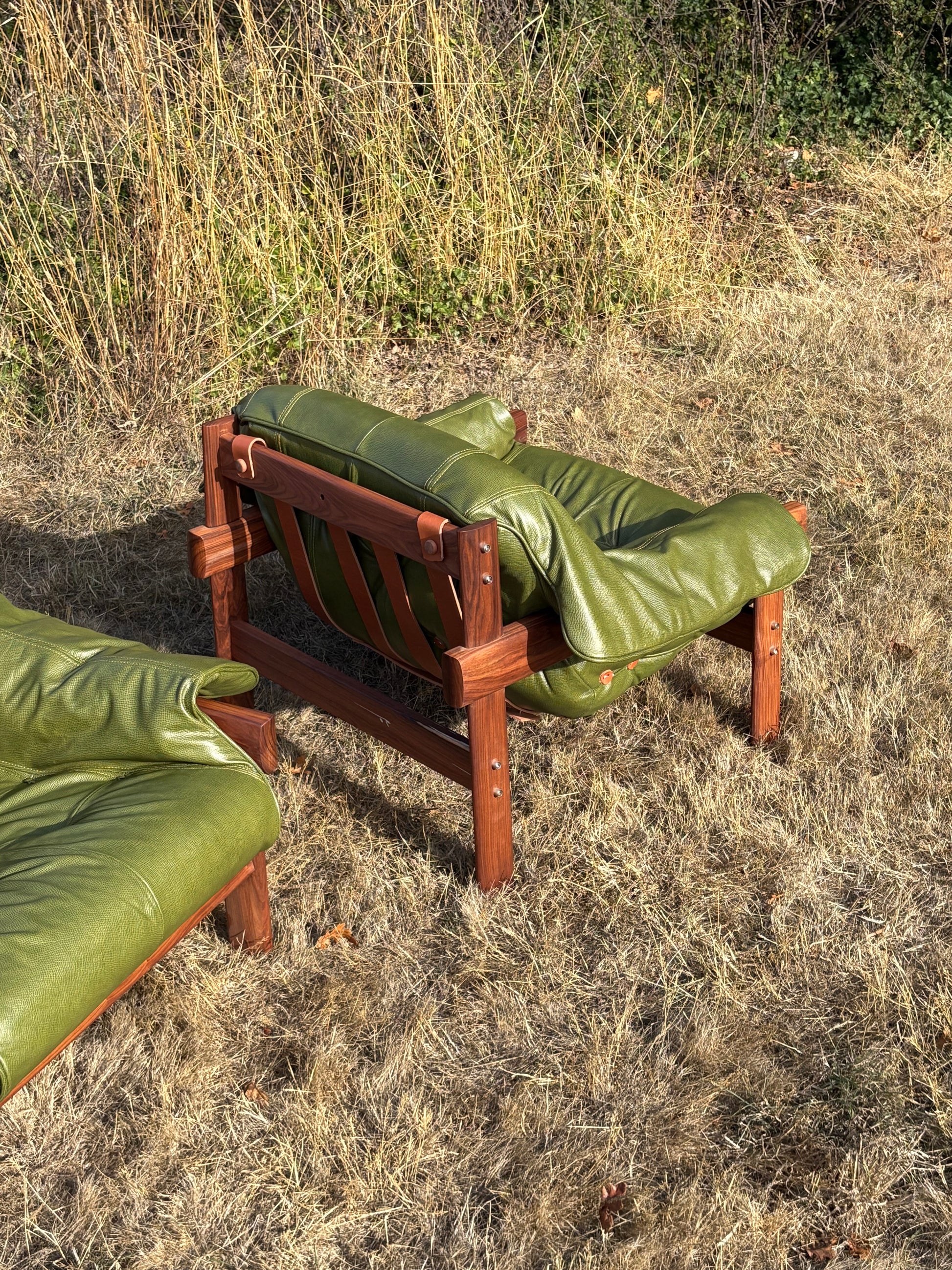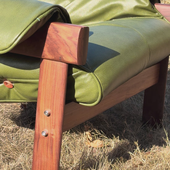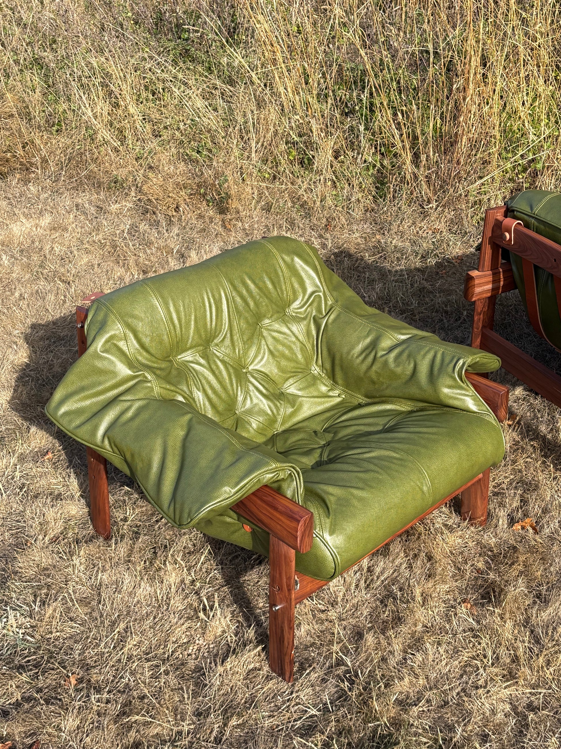 Sink right into Brazilian modernism at its best. This playful pair of 1960s MP41 lounge chairs by Percival Lafer has been completely brought back to life with embossed Italian leather in a lush olive green, brand-new foam, and sturdy new belt leather straps. Their sensual Jatoba wood frames cradle the pillowy cushions just so, making them every bit as inviting as they are striking. Every detail has been carefully considered, ensuring these chairs don’t just turn heads today—they’ll keep stealing hearts for generations to come.