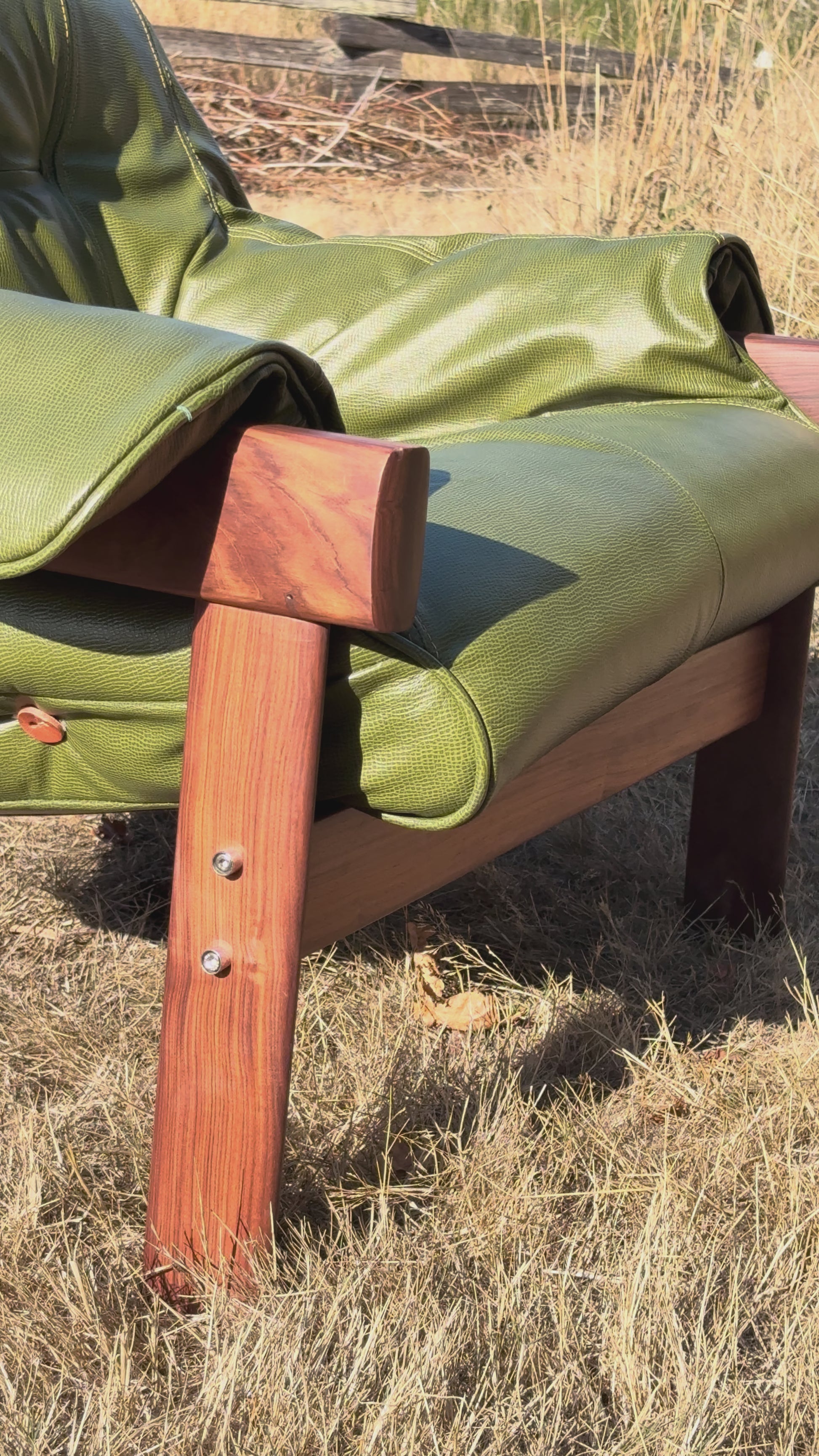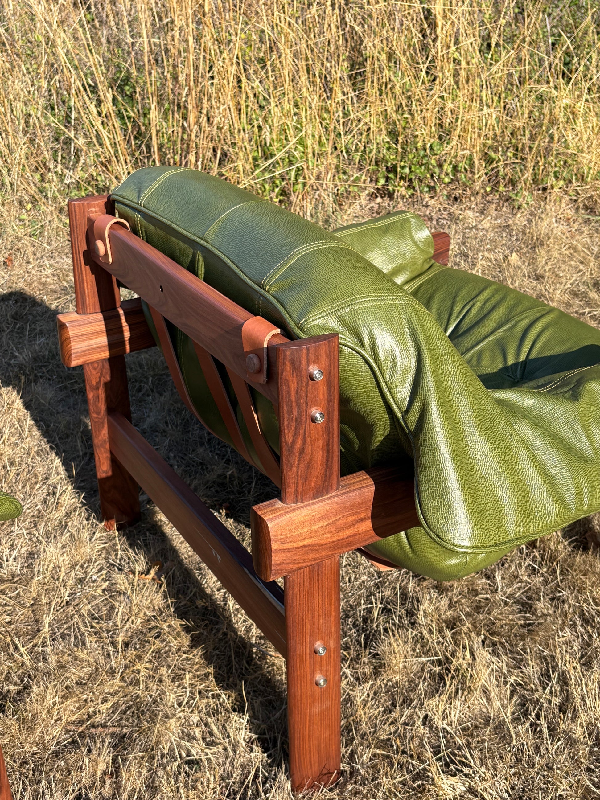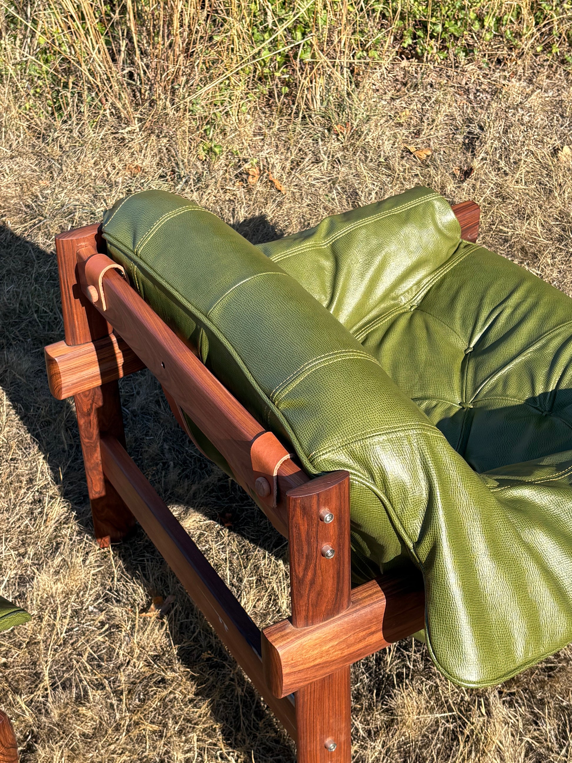 Sink right into Brazilian modernism at its best. This playful pair of 1960s MP41 lounge chairs by Percival Lafer has been completely brought back to life with embossed Italian leather in a lush olive green, brand-new foam, and sturdy new belt leather straps. Their sensual Jatoba wood frames cradle the pillowy cushions just so, making them every bit as inviting as they are striking. Every detail has been carefully considered, ensuring these chairs don’t just turn heads today—they’ll keep stealing hearts for generations to come.