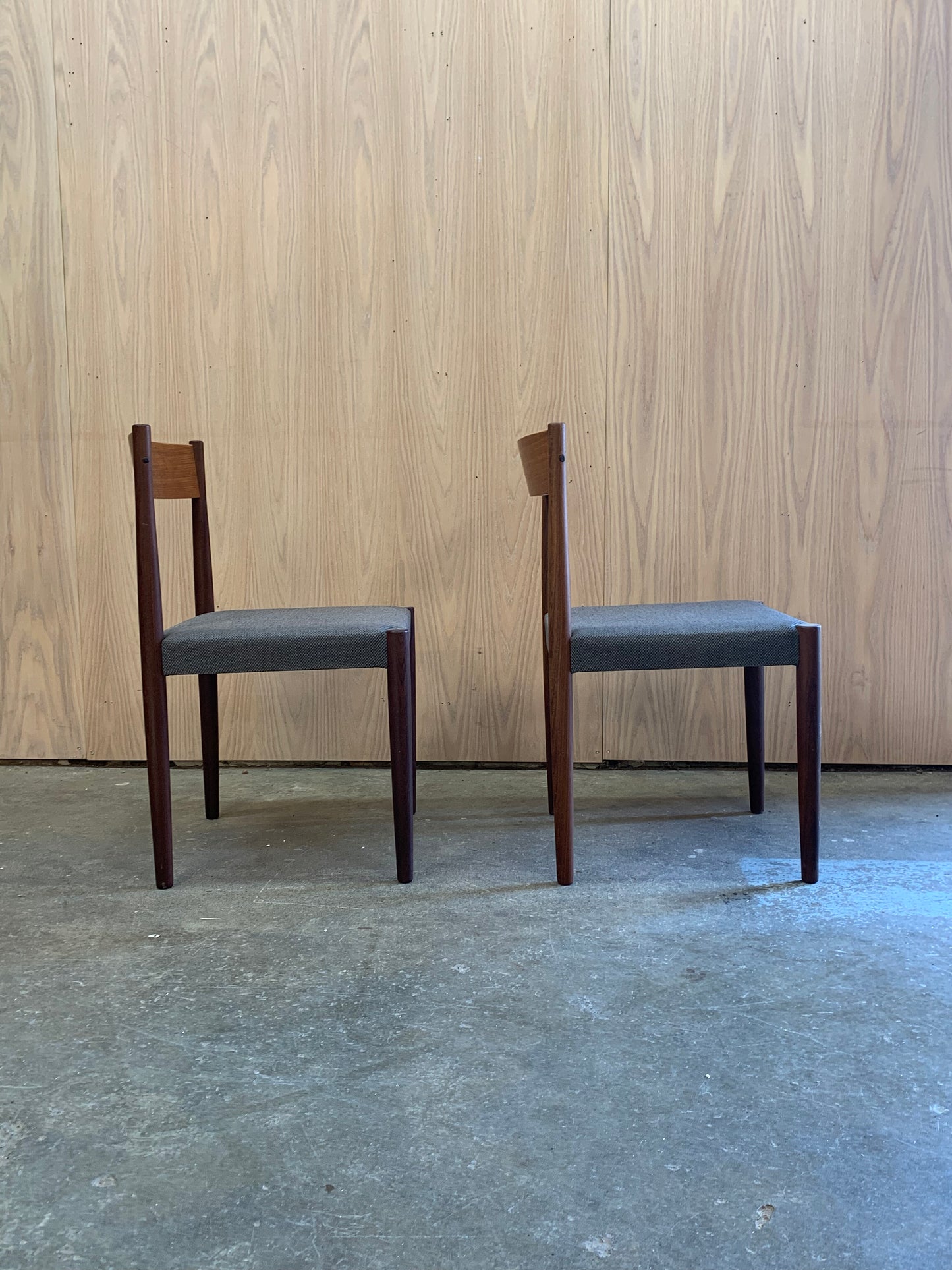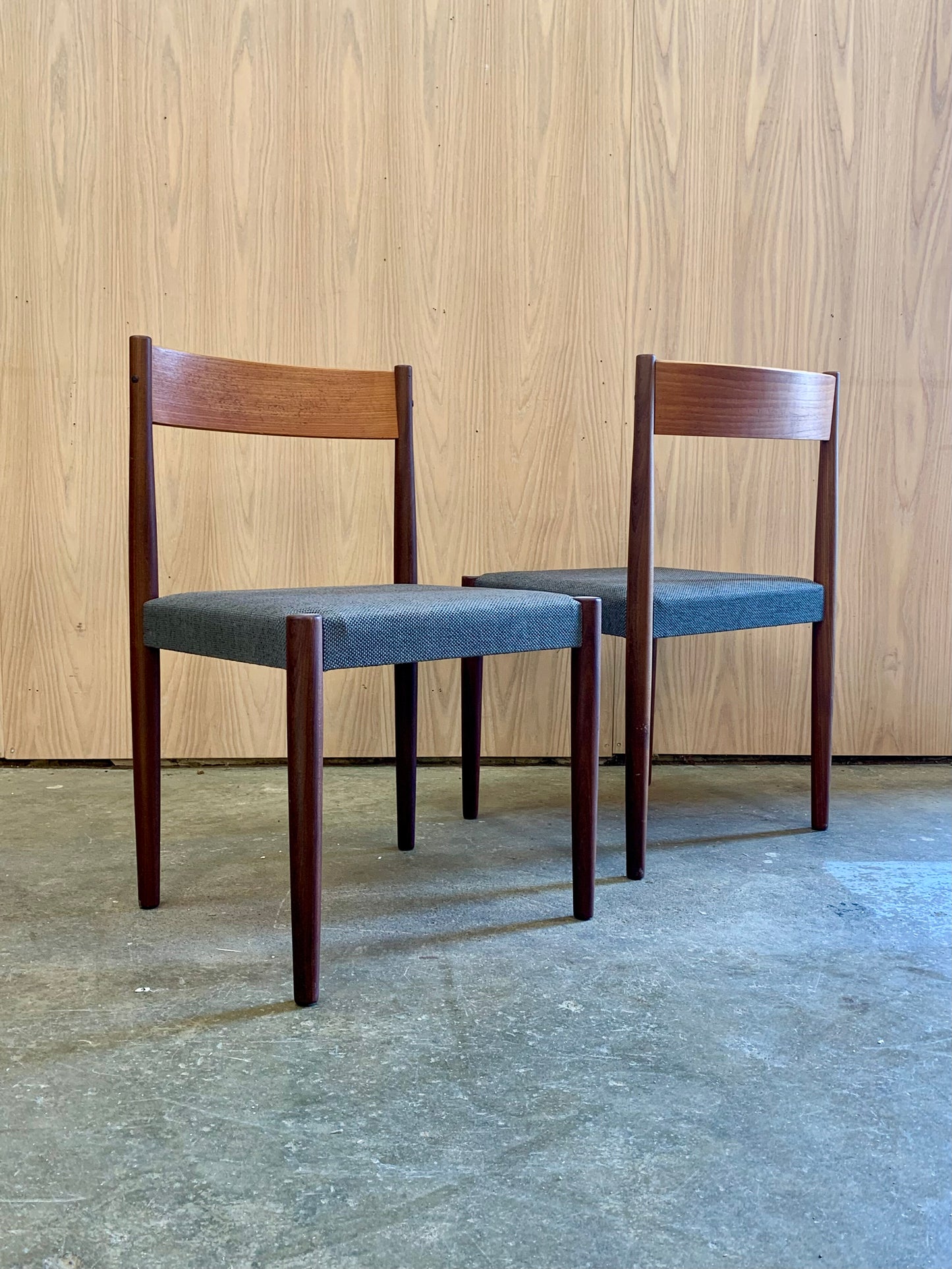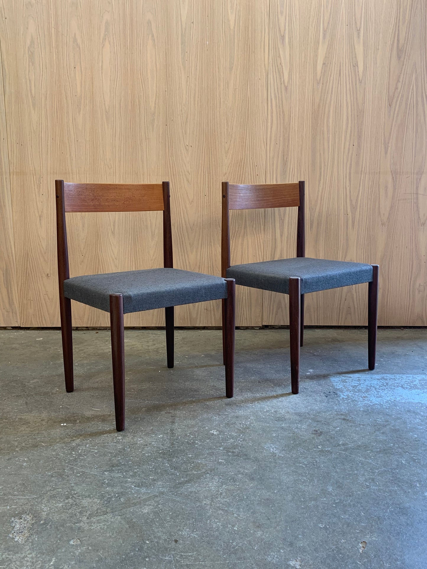 Pair of Danish teak dining chairs designed by Poul Volther for Frem Røjle, circa 1960s. Known for his clean architectural lines and attention to proportion, Volther’s work bridges classic craftsmanship with modern simplicity. These chairs feature gently curved teak backrests and subtly tapered legs, offering a refined yet warm profile. Freshly upholstered in a rich woven fabric and fully cleaned and polished by our team. Excellent condition throughout. A timeless addition to any design-forward dining space.