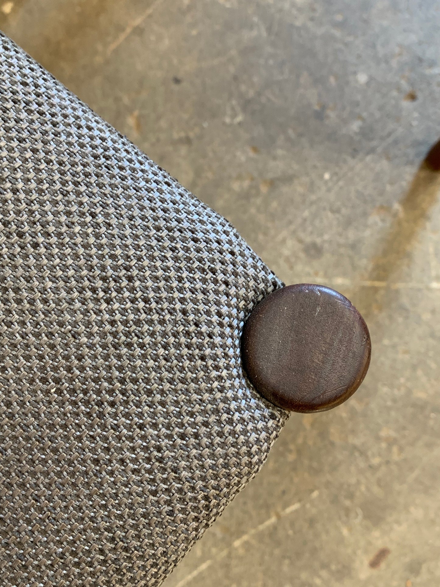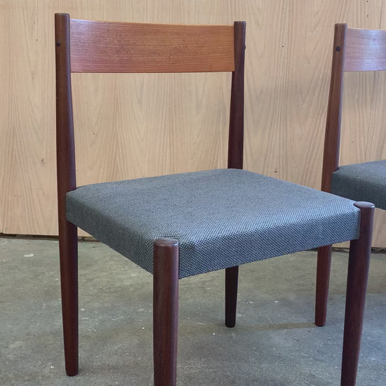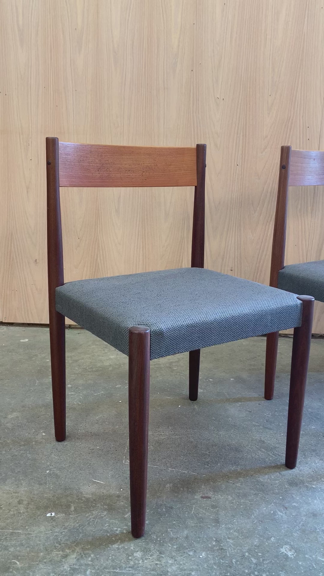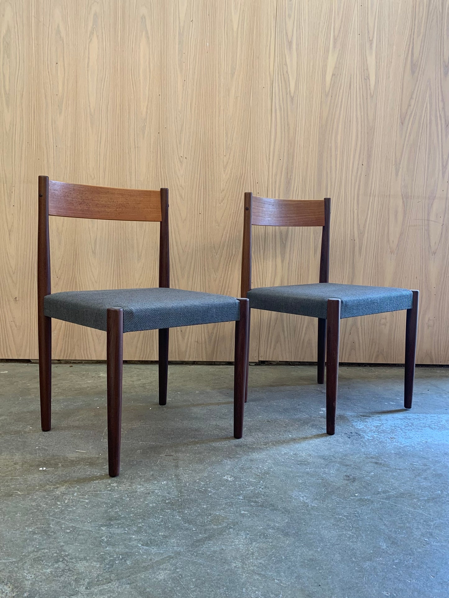 Pair of Danish teak dining chairs designed by Poul Volther for Frem Røjle, circa 1960s. Known for his clean architectural lines and attention to proportion, Volther’s work bridges classic craftsmanship with modern simplicity. These chairs feature gently curved teak backrests and subtly tapered legs, offering a refined yet warm profile. Freshly upholstered in a rich woven fabric and fully cleaned and polished by our team. Excellent condition throughout. A timeless addition to any design-forward dining space.