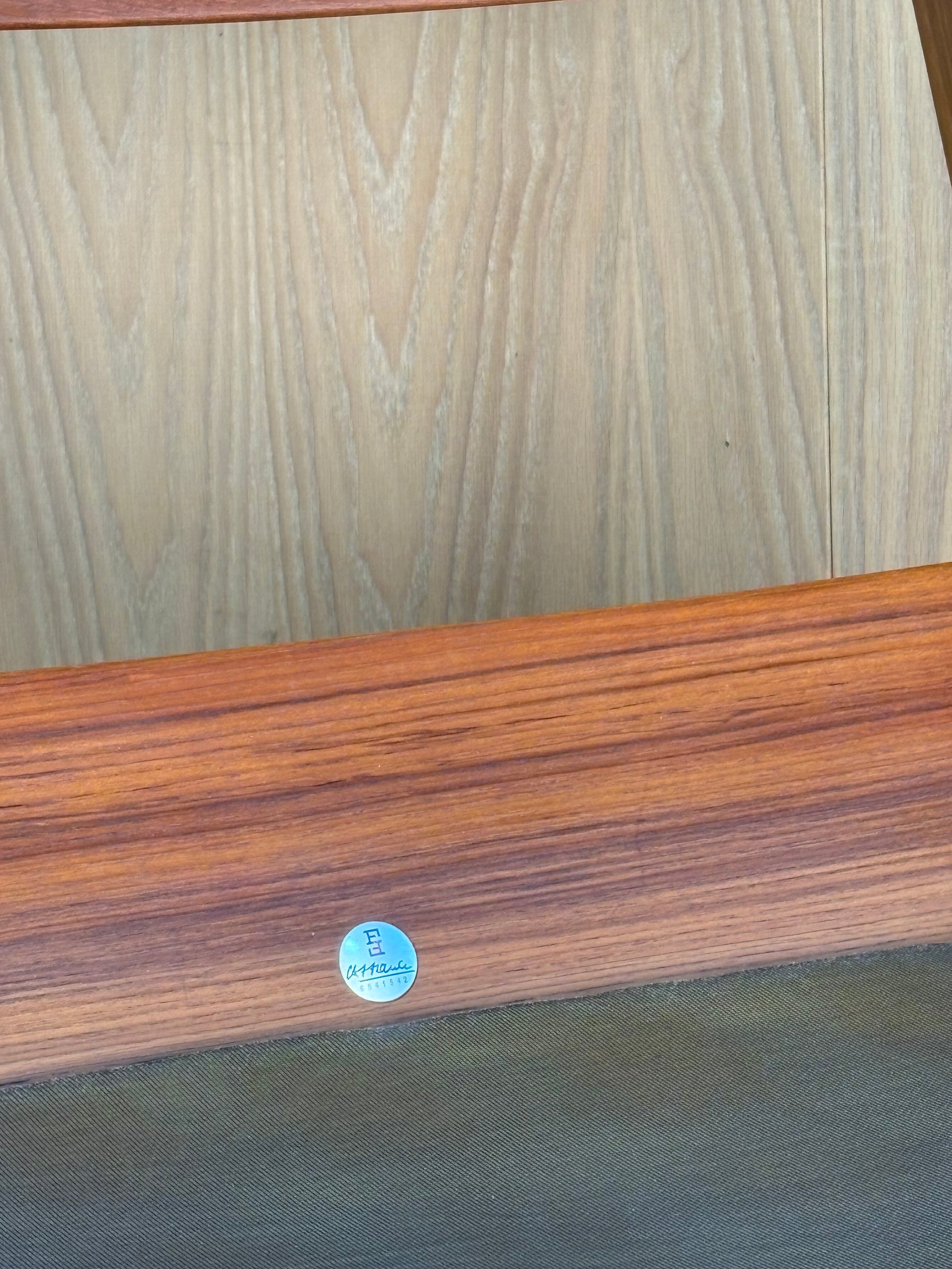 The solid teak frames feature gently tapering legs, sculpted armrests, and a sweeping backrest that offers both structural integrity and visual lightness. The joinery is seamless and refined, showcasing the mastery of Danish cabinetmaking.