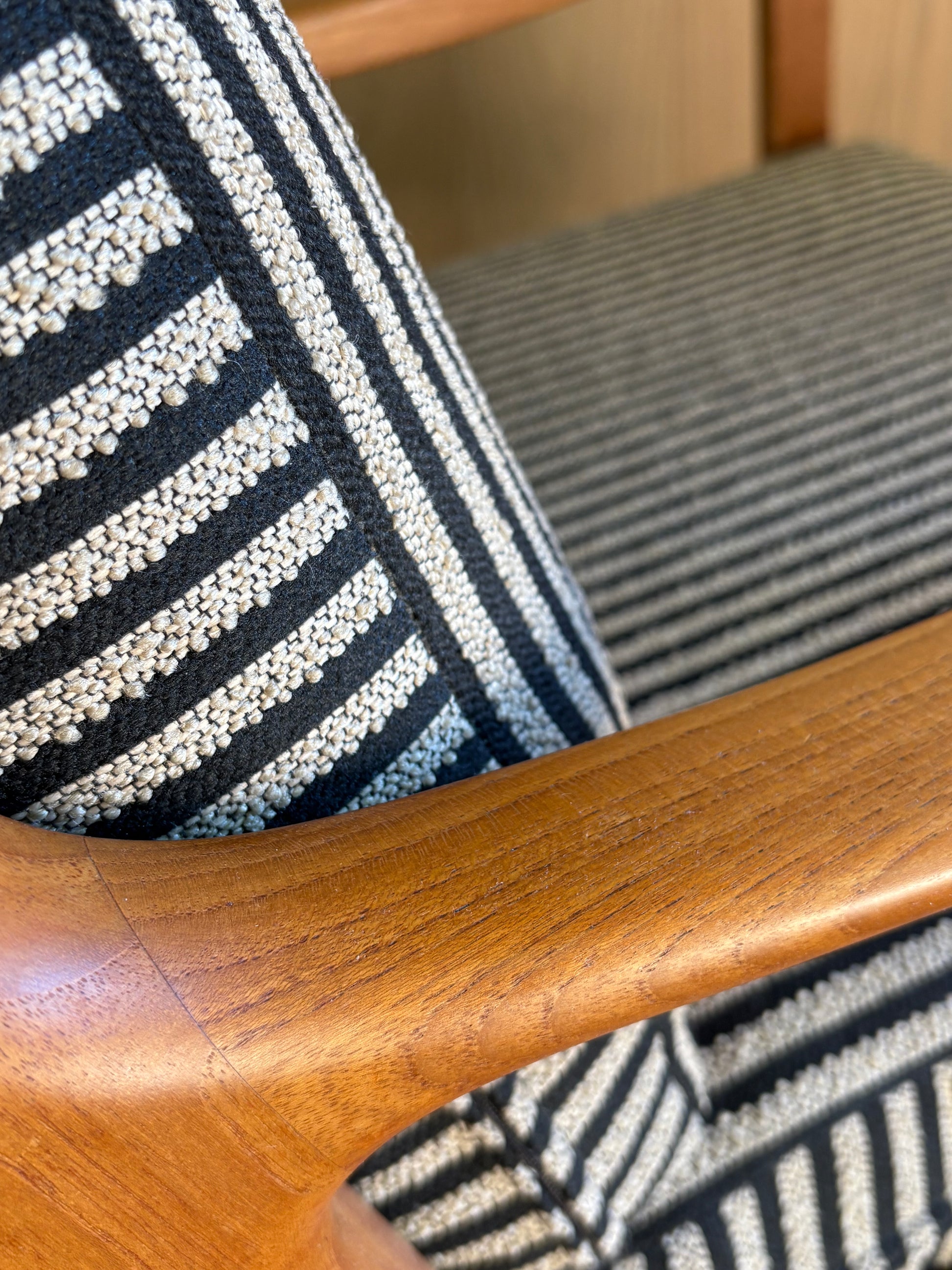 Freshly cleaned and polished by our team, the wood has a warm, glowing patina. The chairs have been newly upholstered in a high-quality, tactile striped fabric with a subtle boucle texture—providing a lively contrast to the smooth teak and emphasizing the modernist geometry of the form.