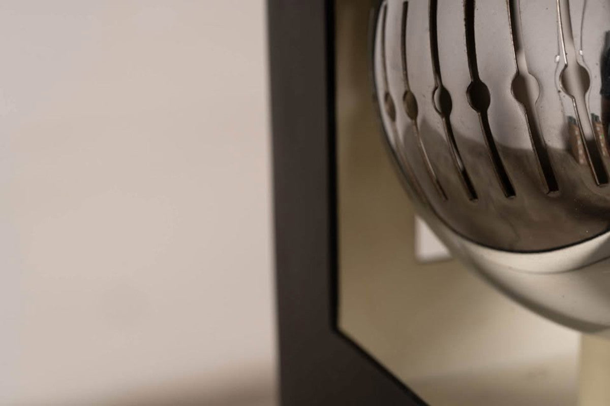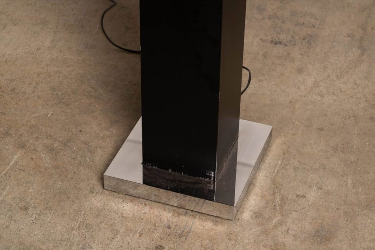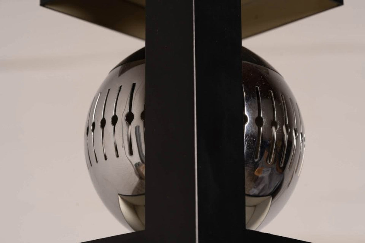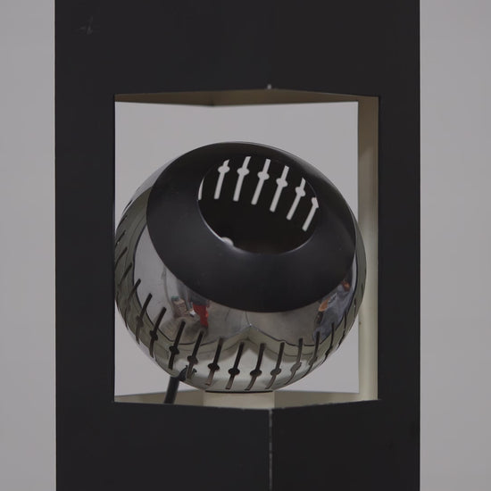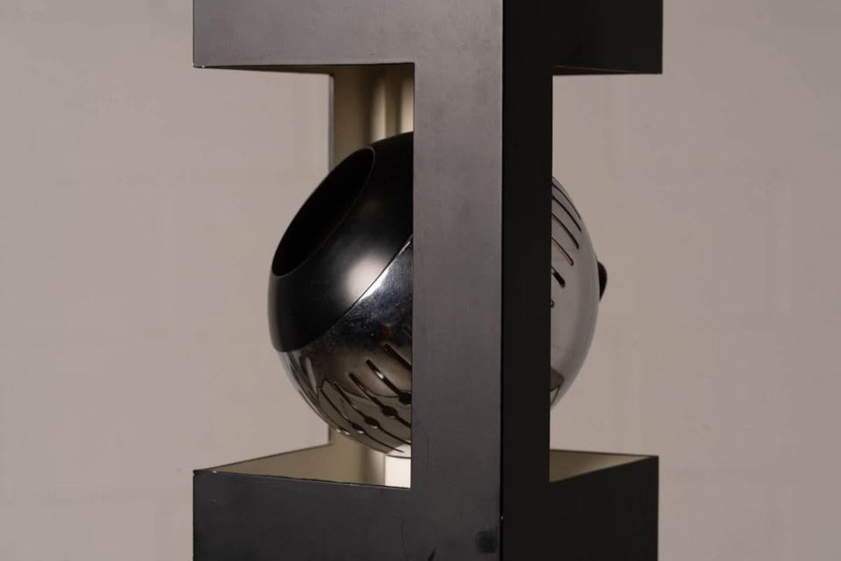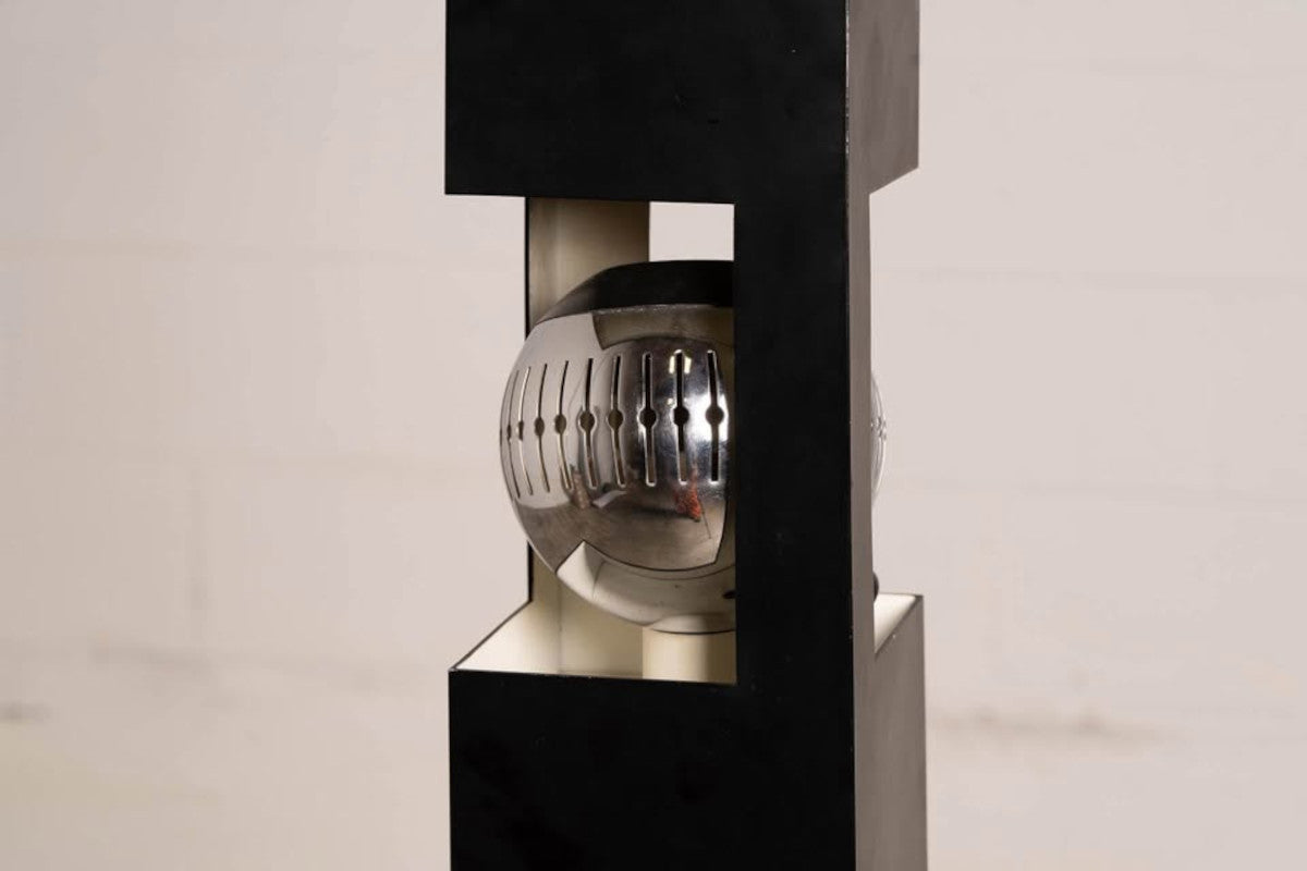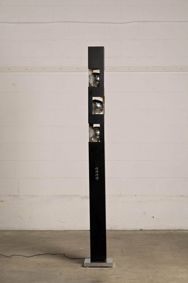 Three chrome spotlight heads are recessed within asymmetrical cutouts along the vertical shaft, each featuring magnetic, swiveling diffusers that allow for smooth, fully directional lighting. These floating chrome spheres are held in place by concealed magnets—an ingenious and rarely seen design element that gives the piece a futuristic, kinetic energy. A fourth concealed uplight adds an ambient glow, completing the lamp’s vertical composition.