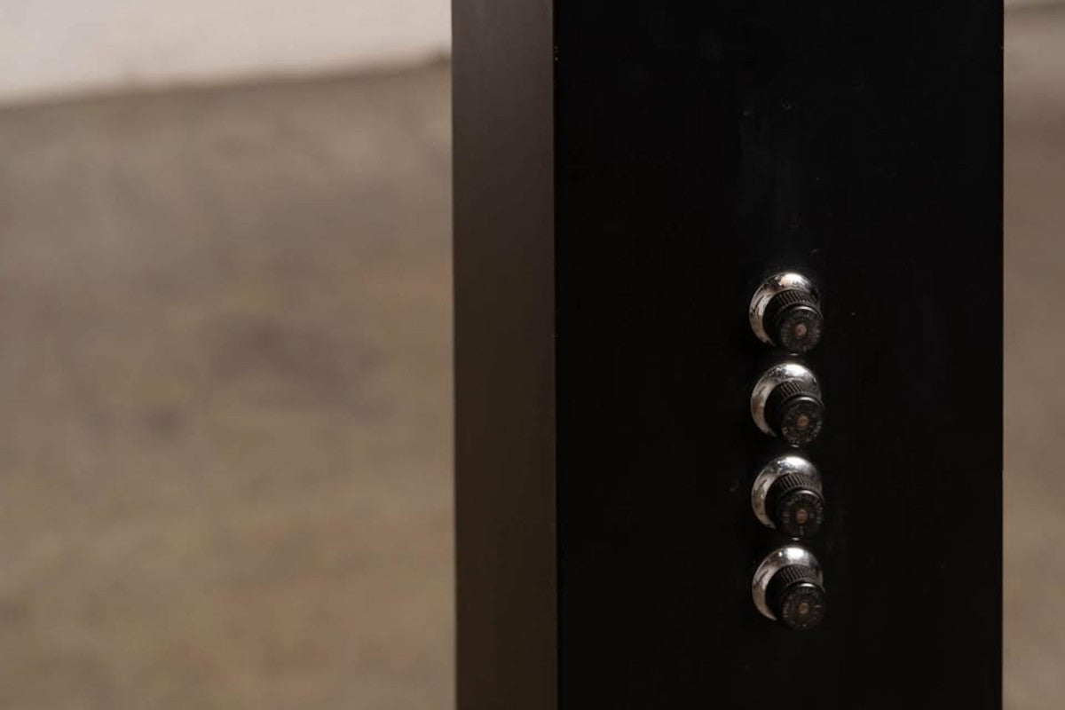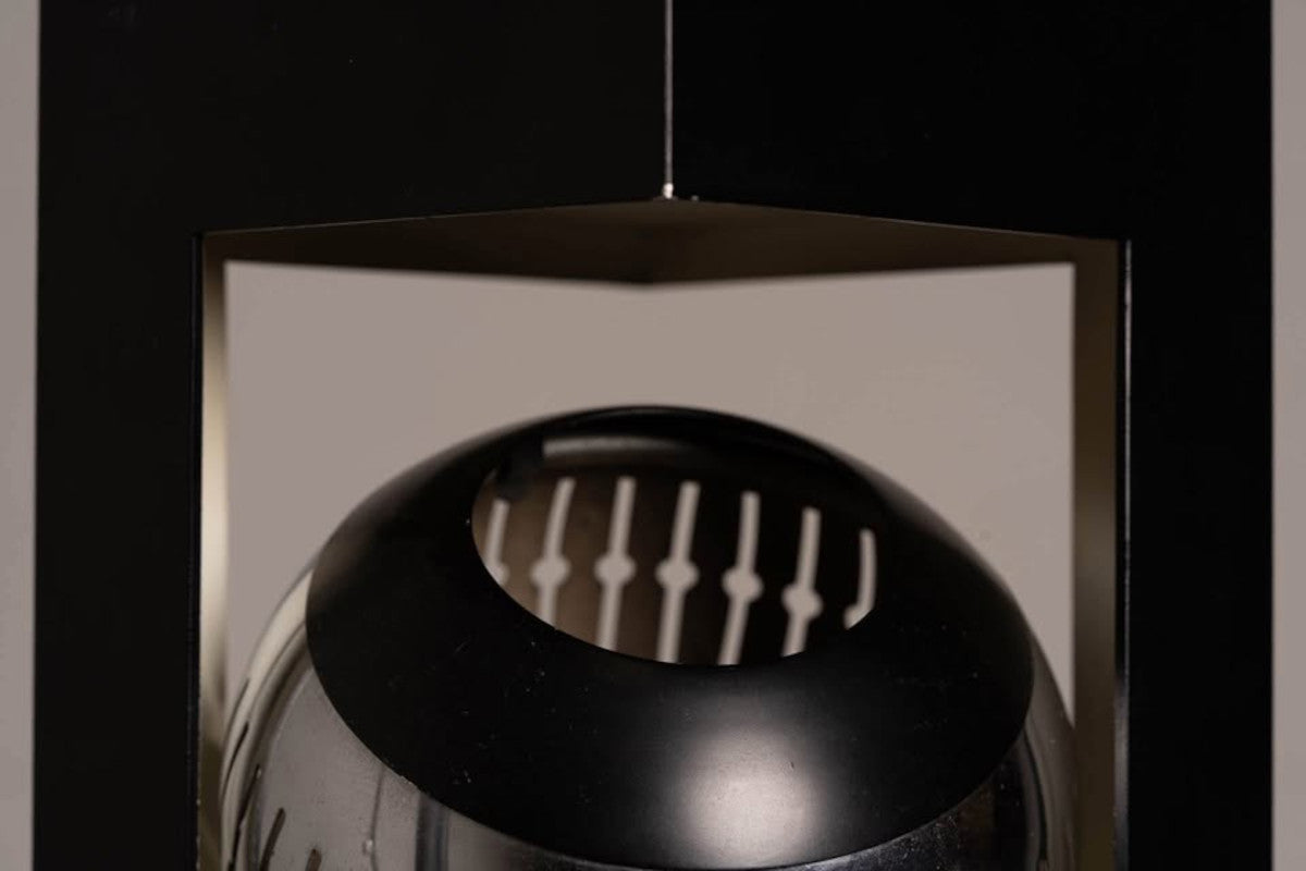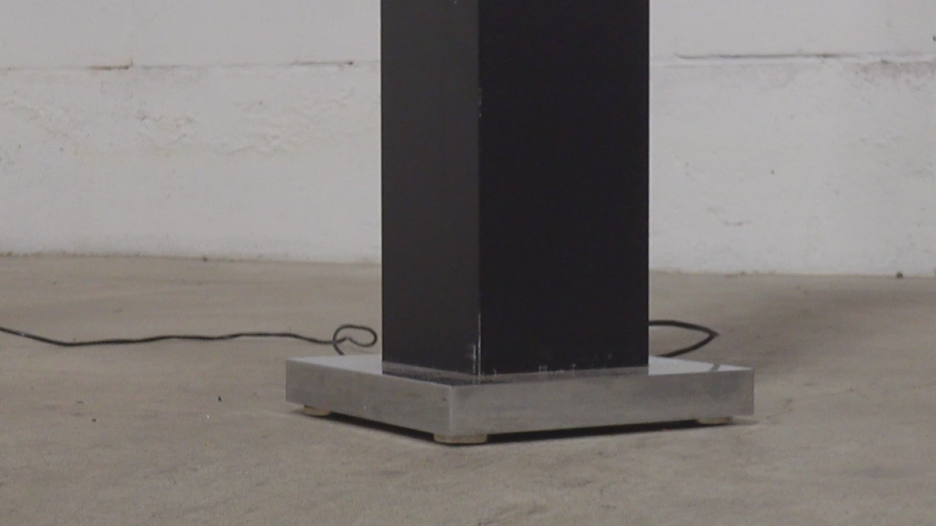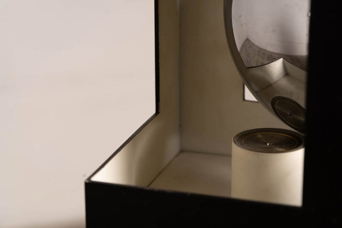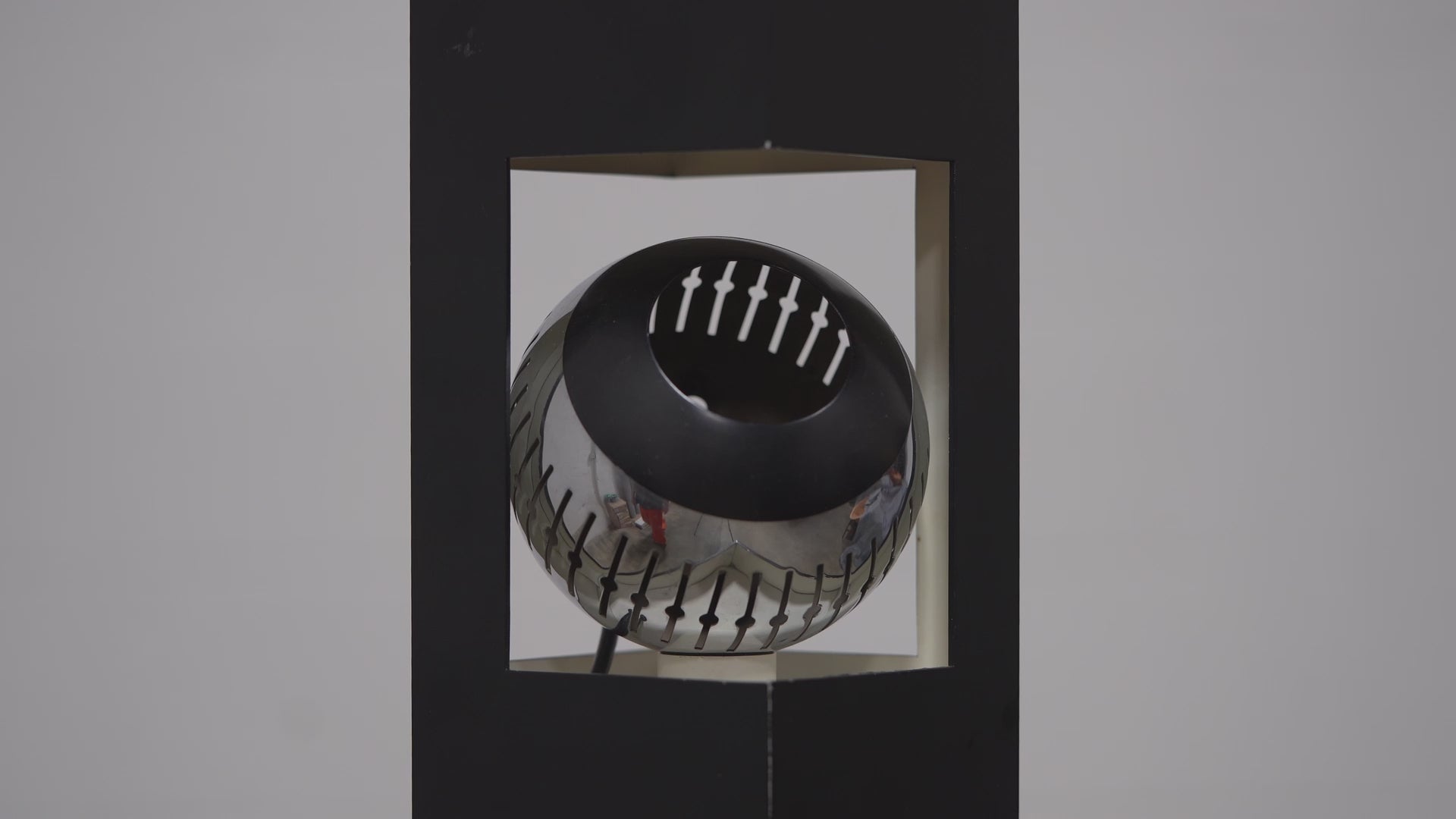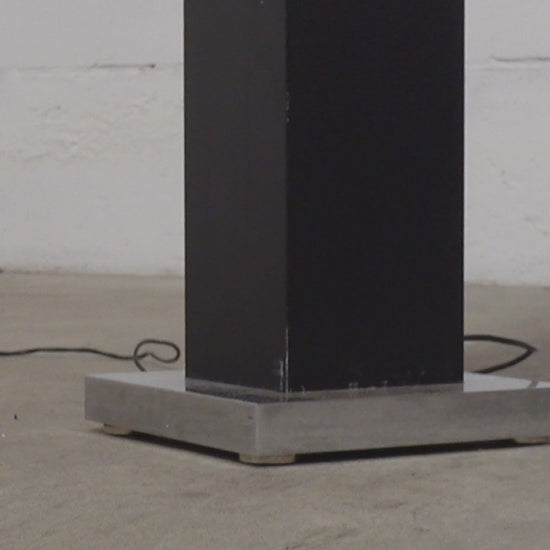 Three chrome spotlight heads are recessed within asymmetrical cutouts along the vertical shaft, each featuring magnetic, swiveling diffusers that allow for smooth, fully directional lighting. These floating chrome spheres are held in place by concealed magnets—an ingenious and rarely seen design element that gives the piece a futuristic, kinetic energy. A fourth concealed uplight adds an ambient glow, completing the lamp’s vertical composition.