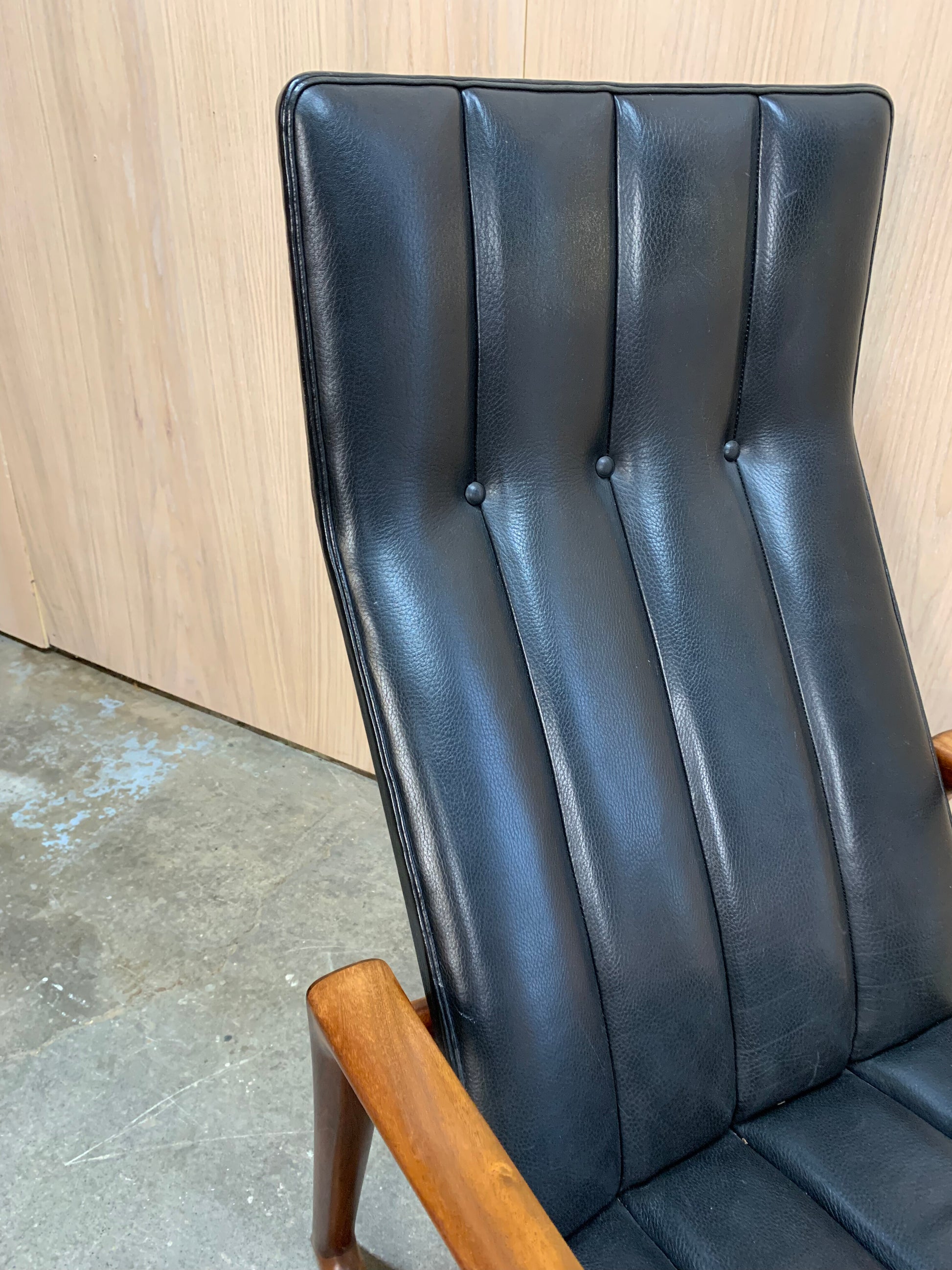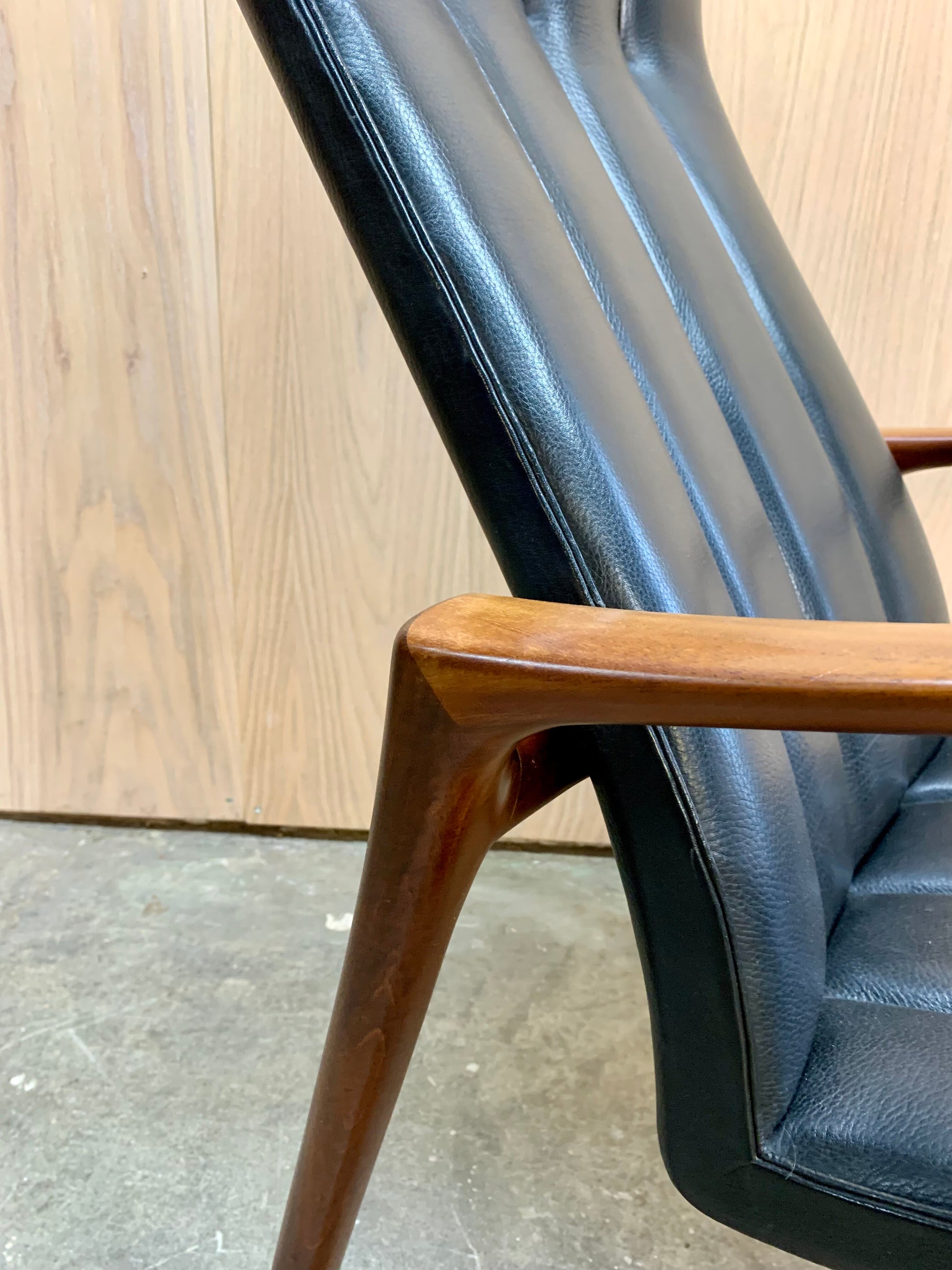 An exceptionally rare find, this sculptural rocking chair by Helge Vestergaard-Jensen for Søren Horn is a true treasure of Danish modern design. Crafted in Denmark in the mid-20th century, it features a solid mahogany frame paired with its original black leather upholstery—offering a sleek, elegant silhouette that’s both visually striking and supremely comfortable.