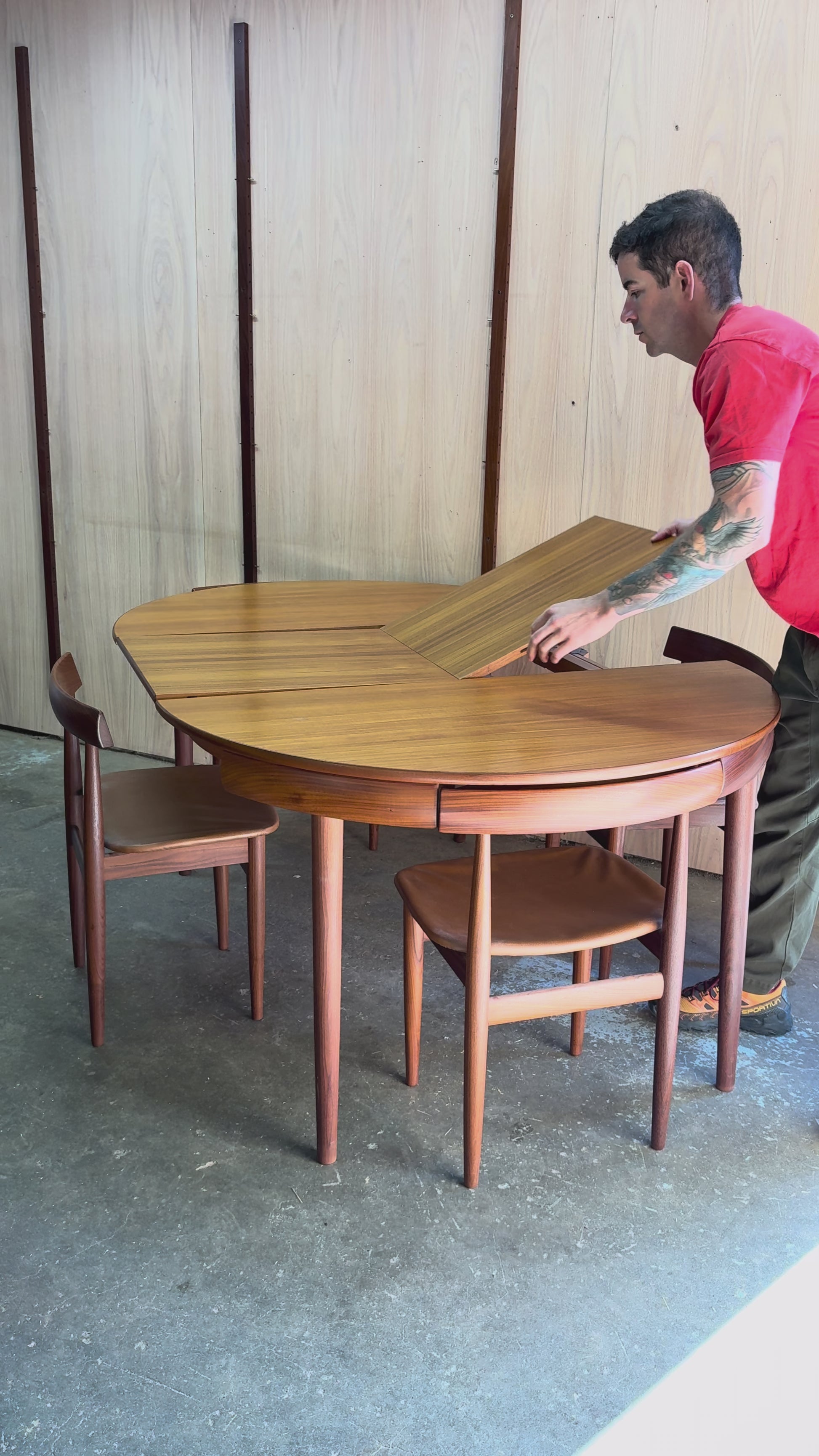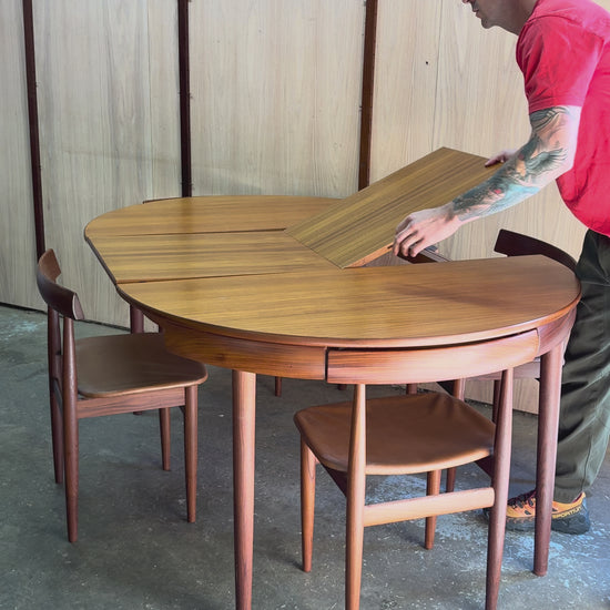 A true icon of Danish modern design, the “Roundette” dining set by Hans Olsen for Frem Røjle is one of the most innovative and space-efficient furniture designs of the mid-20th century. This rare example features the uncommon four-leg version of the table, paired with four beautifully sculpted chairs that tuck seamlessly beneath the edge of the table when not in use.