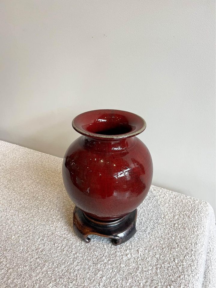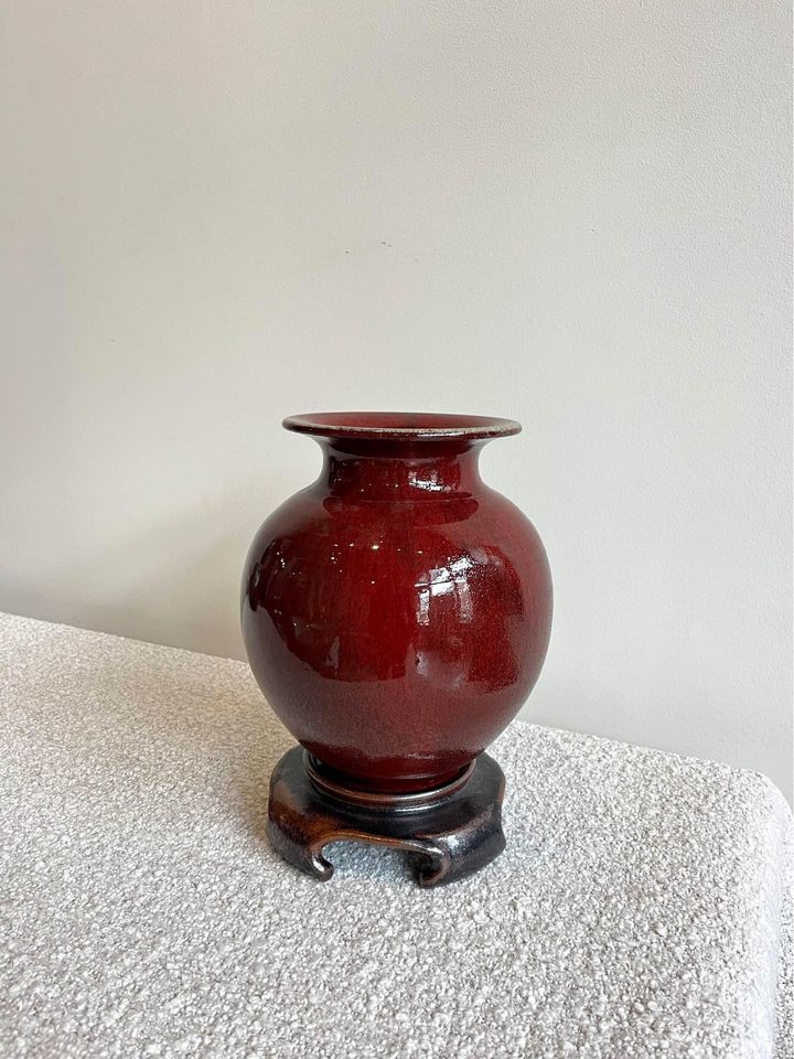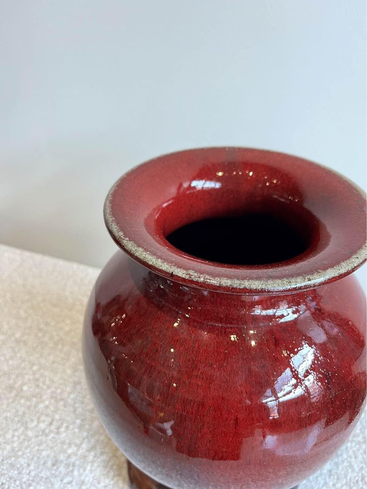 We are pleased to offer this exquisite sang-de-boeuf stoneware vase by the master artisan Lane Gordon Thorlaksson, complete with its unique ceramic base meticulously crafted to complement its elegance. Thorlaksson, a visionary in the realm of studio pottery, diverged from the mainstream path set by Leach and Hamada, instead drawing inspiration from the grandeur of the Song and later Chinese dynasties. Amidst the tumultuous aftermath of Mao's Cultural Revolution, Thorlaksson's genius shone bright as he was beckoned to China, where he played a pivotal role in the revival of the ceramic arts industry. Despite his untimely battle with cancer in 2009, his legacy endures through pieces like this, each a testament to his unwavering dedication and unparalleled craftsmanship.