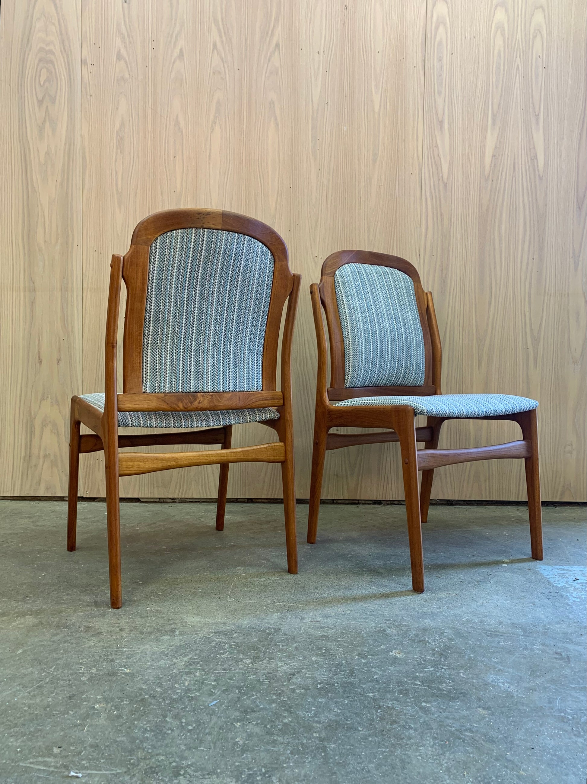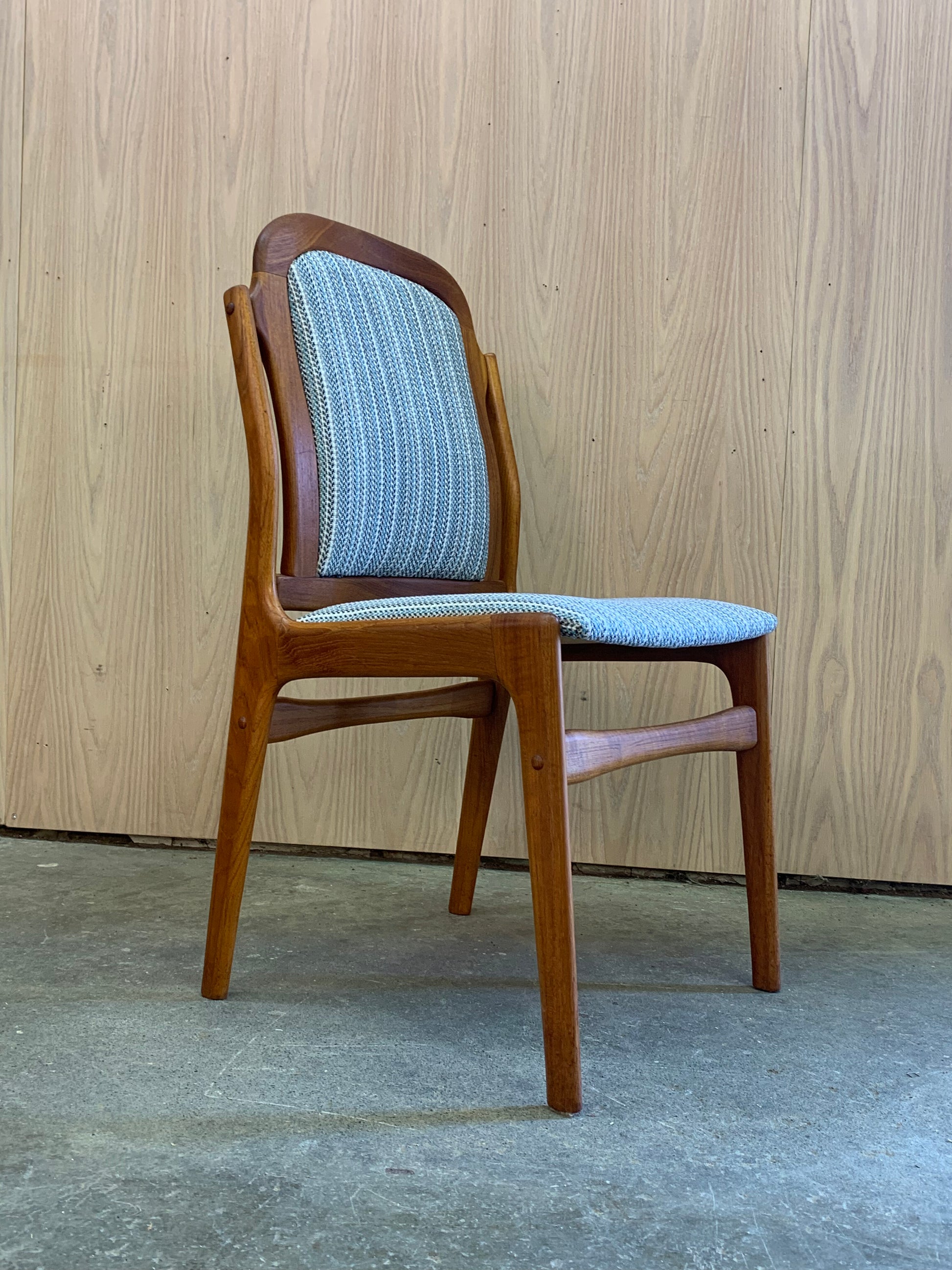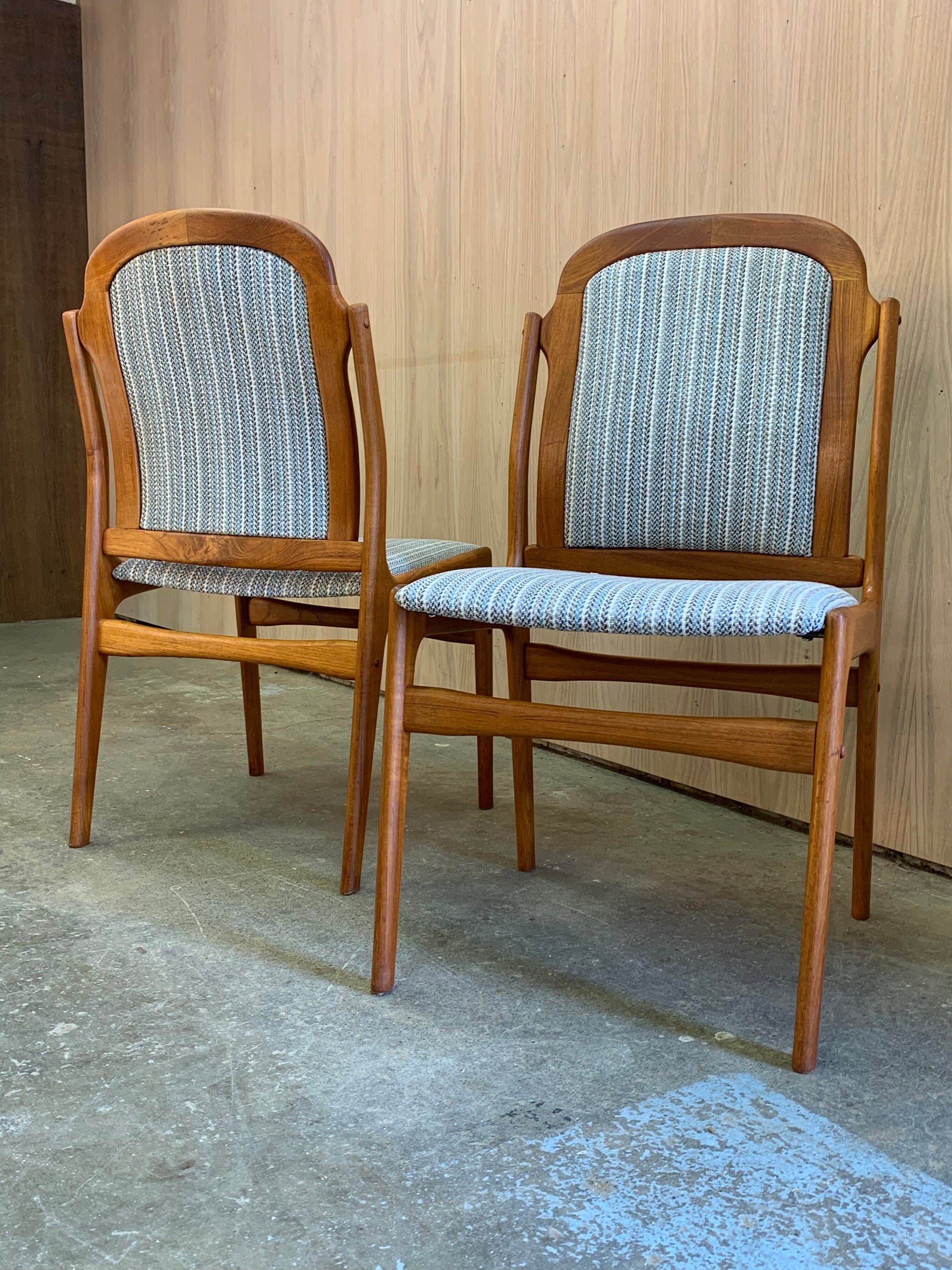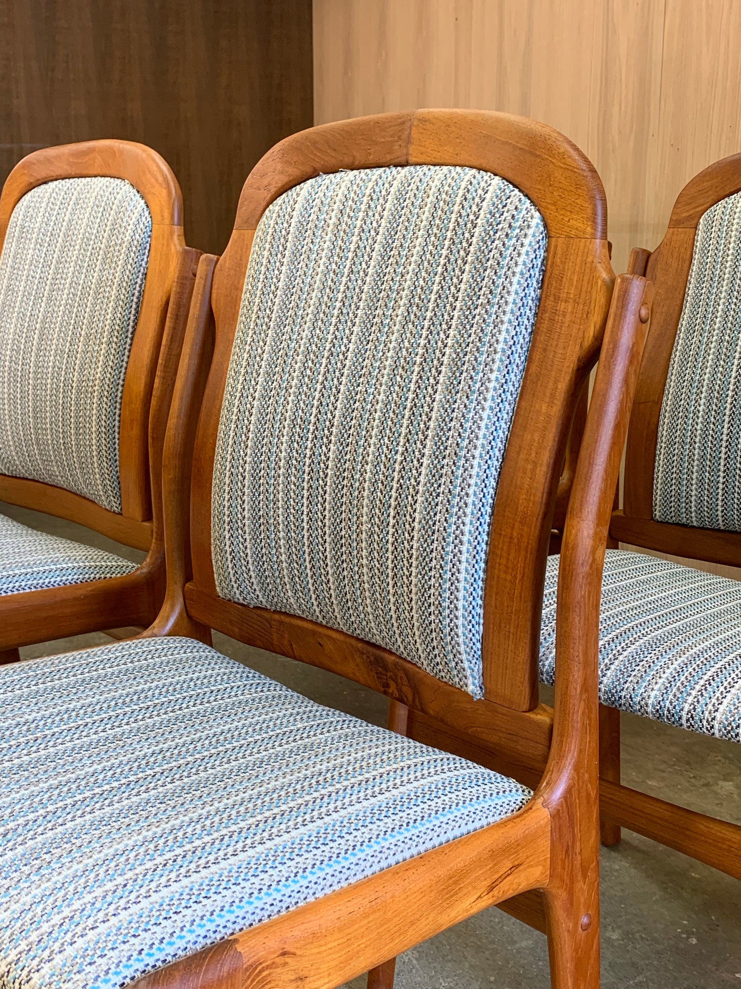 A beautifully sculpted set of four Danish dining chairs from the 1970s, crafted in solid teak with soft curves and refined joinery. Fully restored by our team and freshly upholstered in a luxurious silk blend fabric with a subtle woven pattern, these chairs offer both comfort and character. In excellent condition and ready to elevate any dining space.