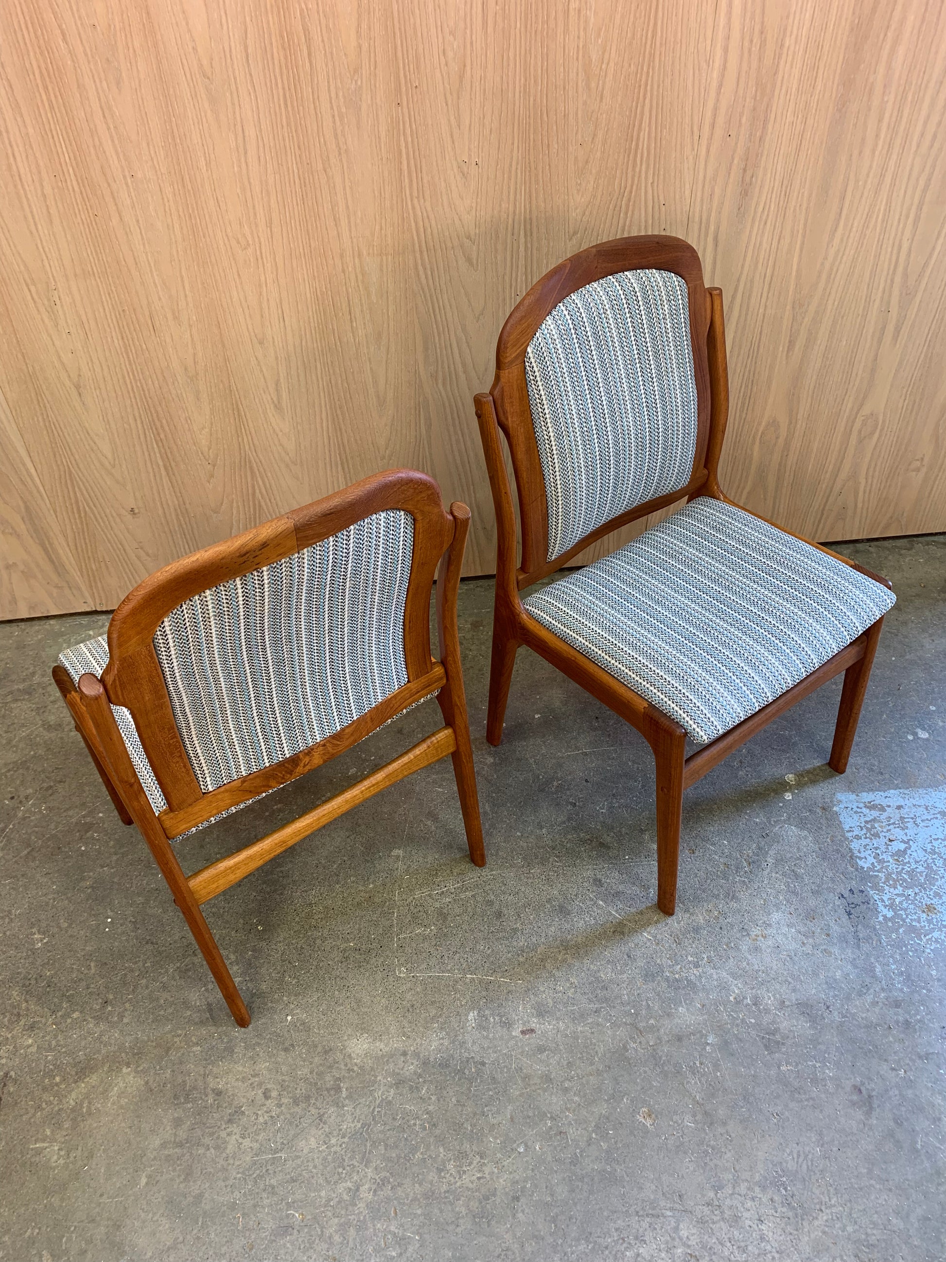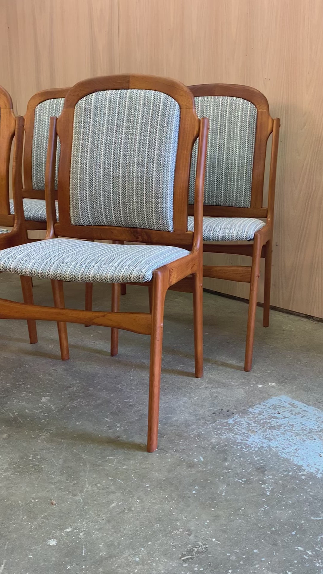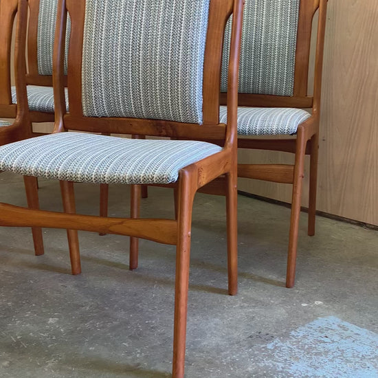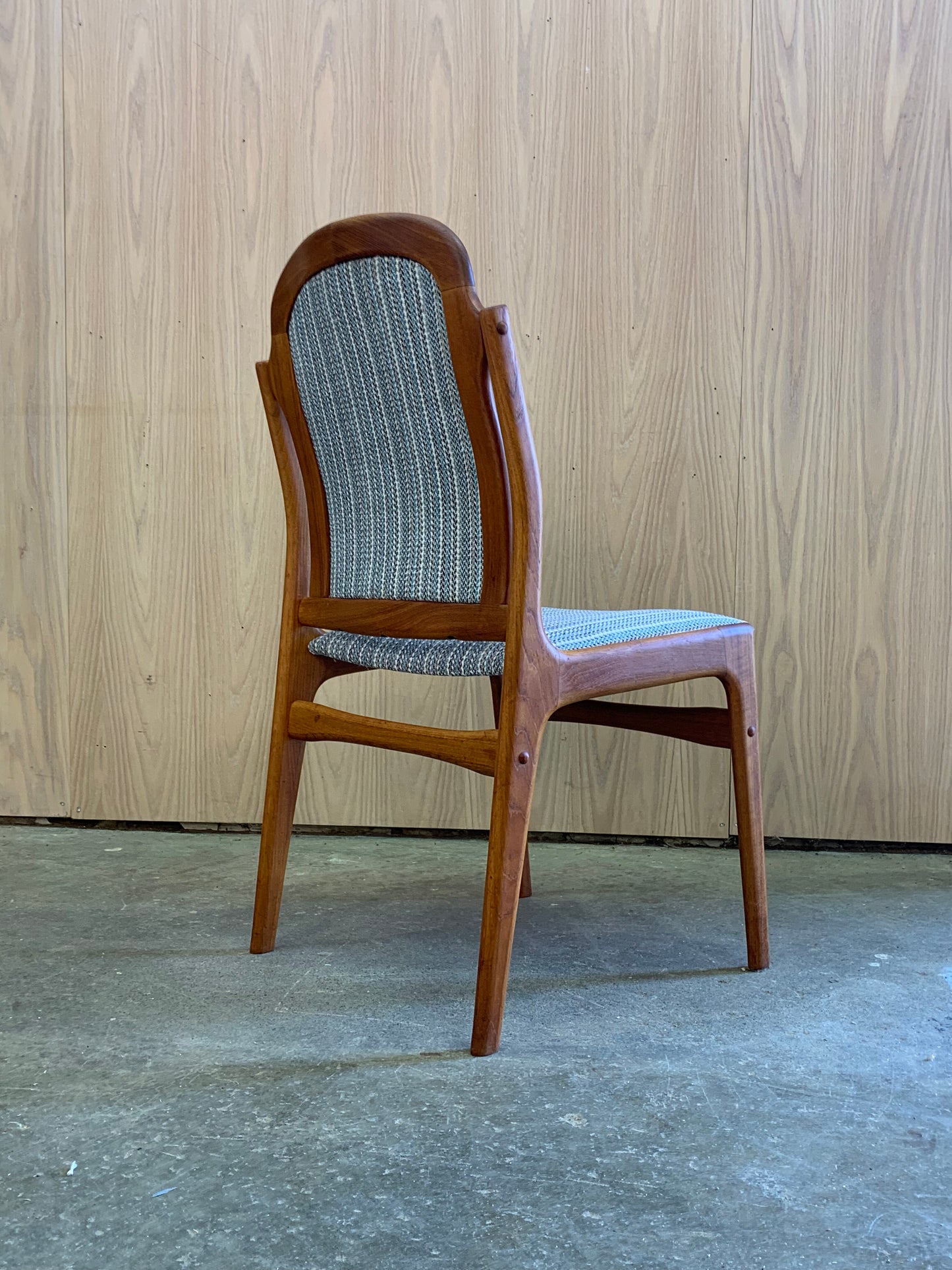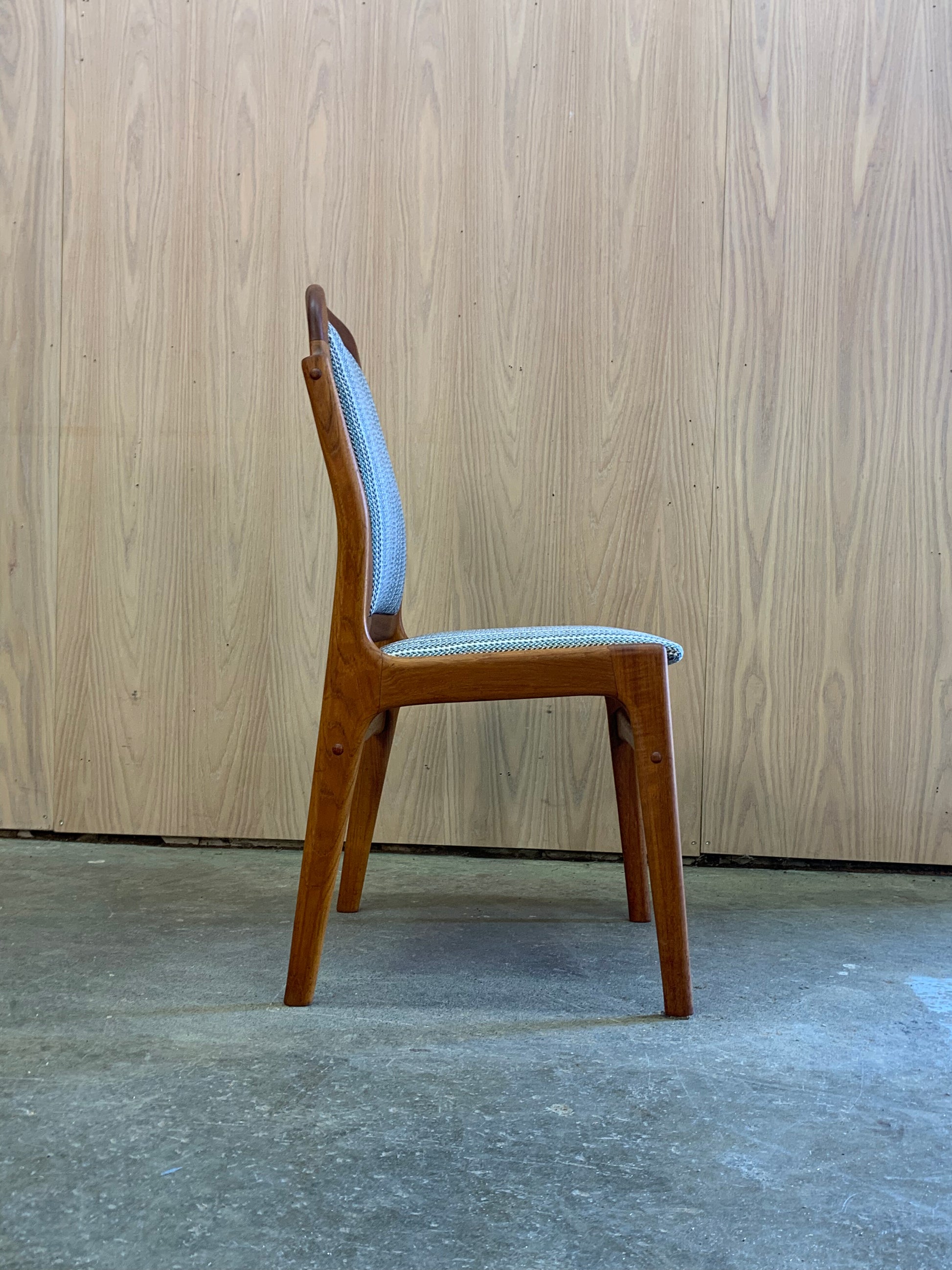 A beautifully sculpted set of four Danish dining chairs from the 1970s, crafted in solid teak with soft curves and refined joinery. Fully restored by our team and freshly upholstered in a luxurious silk blend fabric with a subtle woven pattern, these chairs offer both comfort and character. In excellent condition and ready to elevate any dining space.