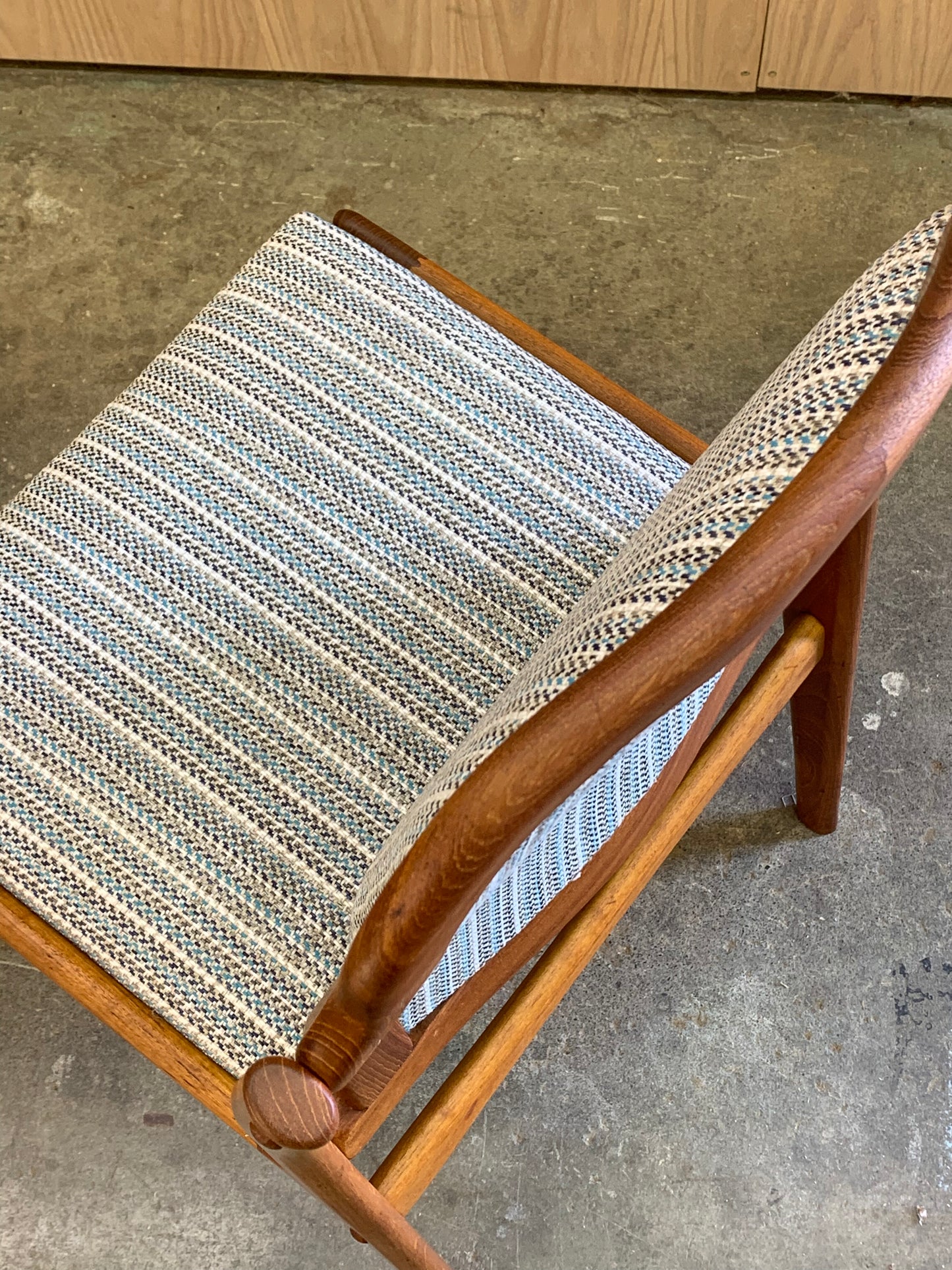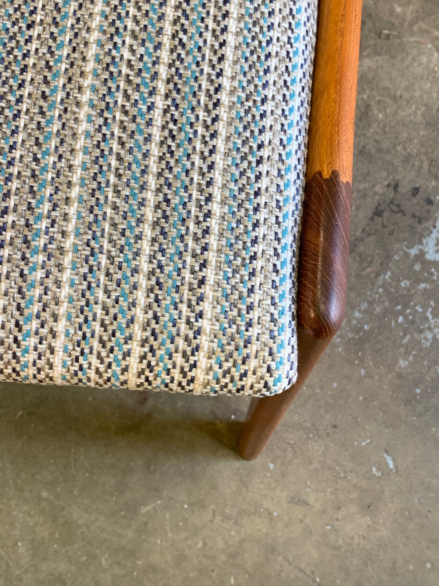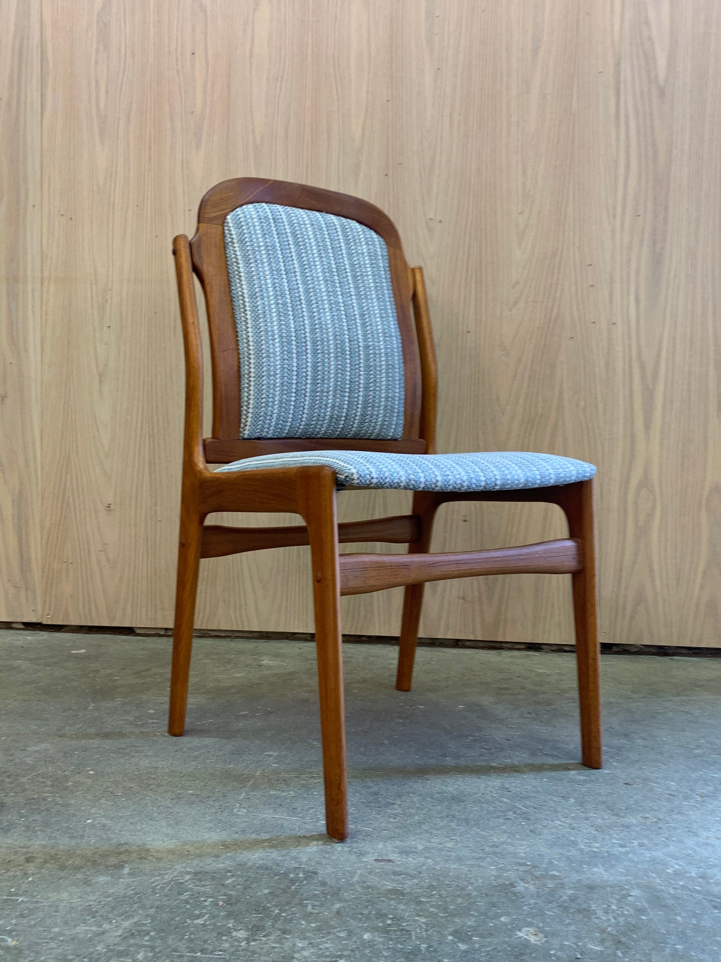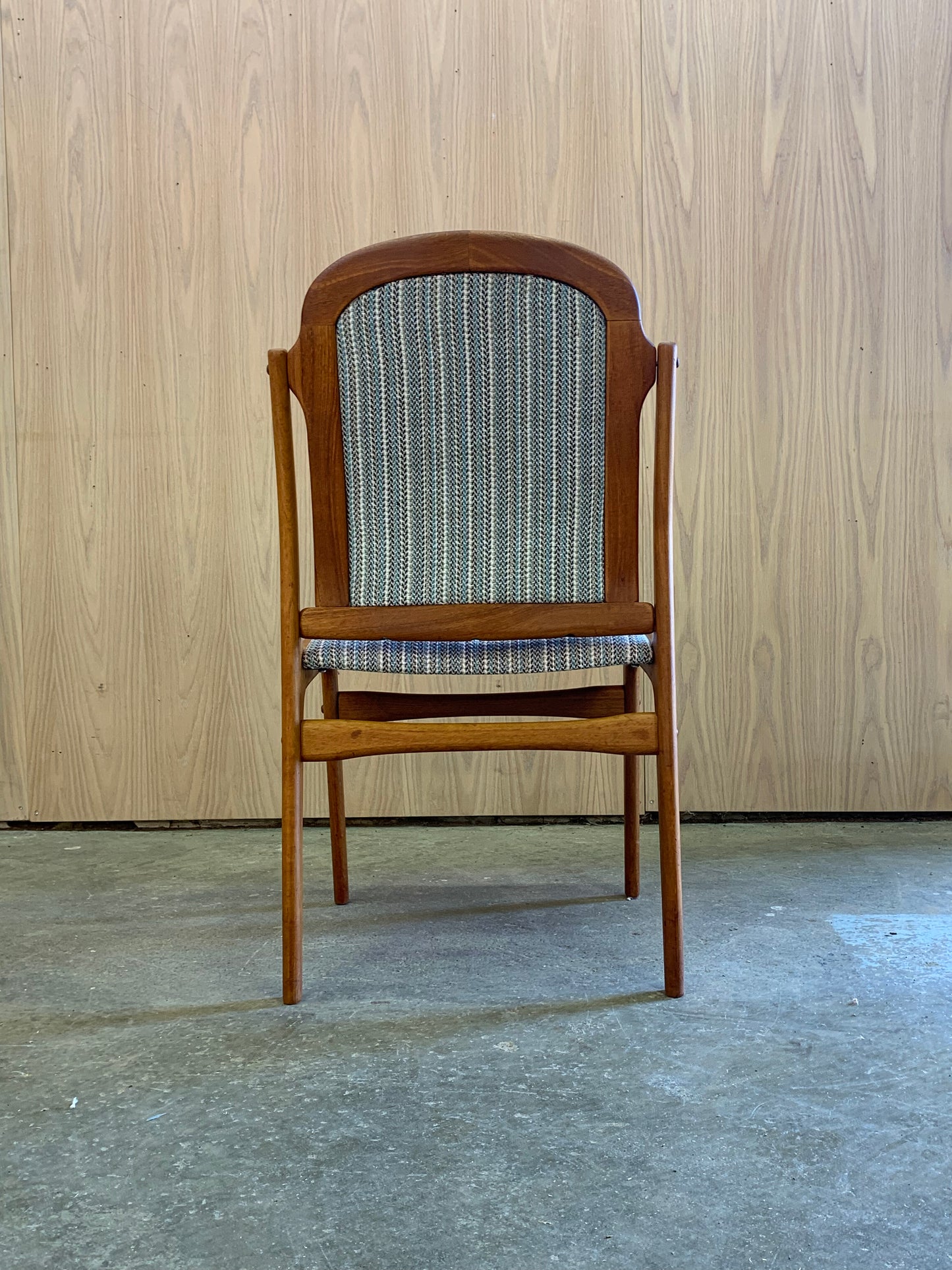 A beautifully sculpted set of four Danish dining chairs from the 1970s, crafted in solid teak with soft curves and refined joinery. Fully restored by our team and freshly upholstered in a luxurious silk blend fabric with a subtle woven pattern, these chairs offer both comfort and character. In excellent condition and ready to elevate any dining space.