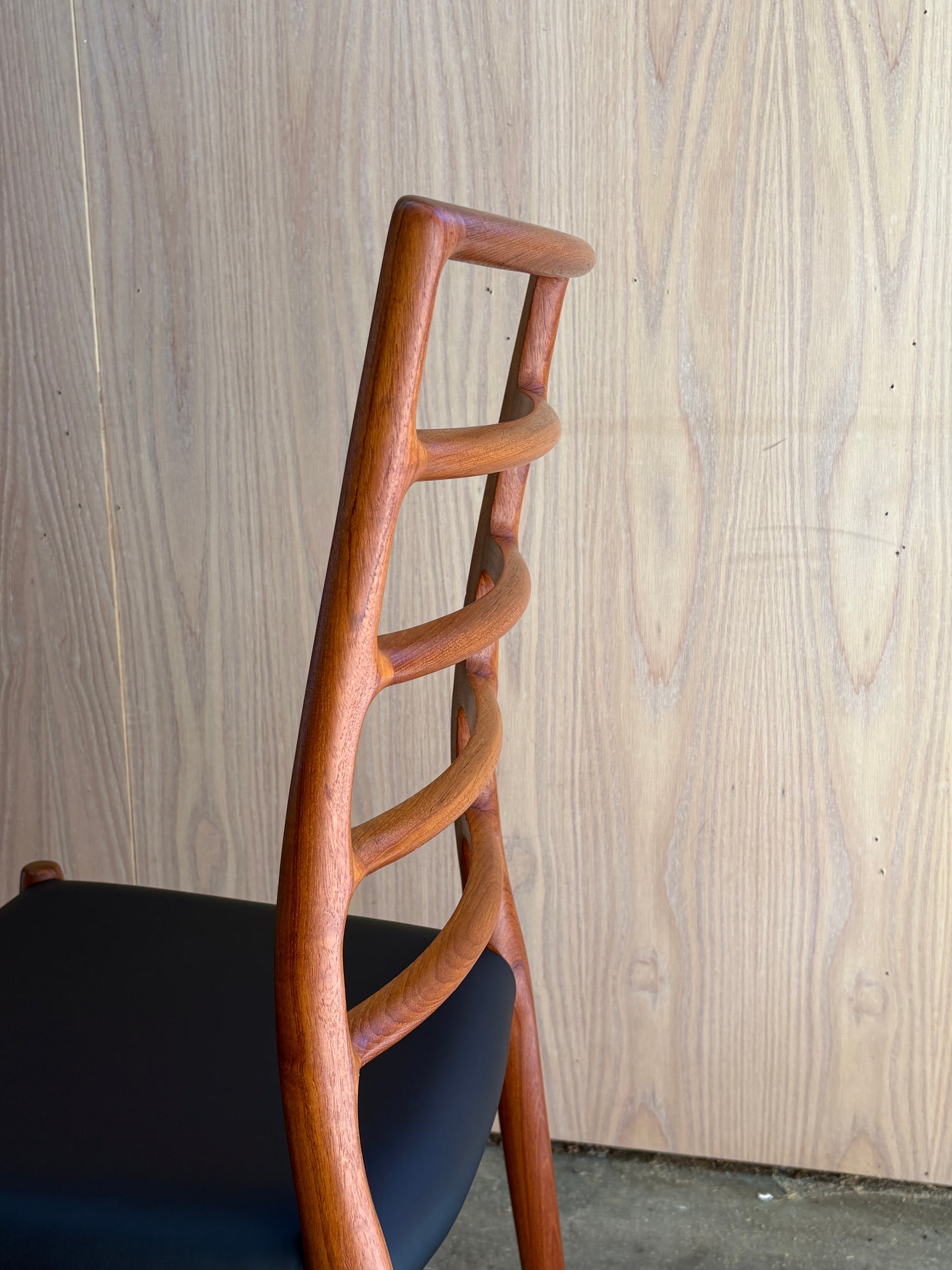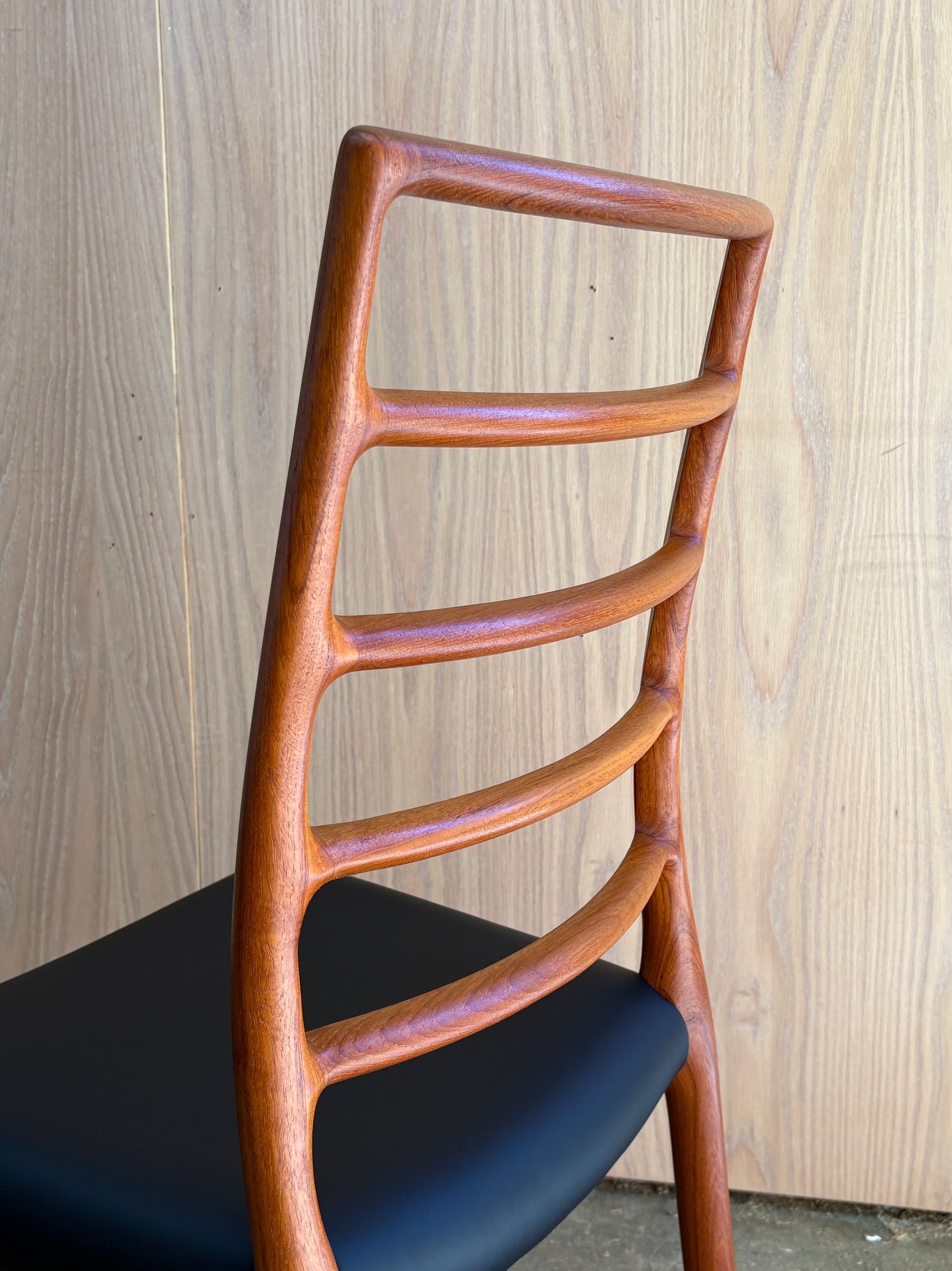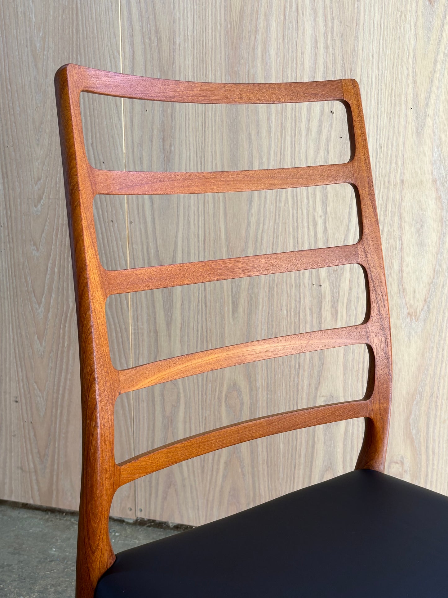 A masterclass in Danish craftsmanship, this set of eight Model 78 dining chairs was designed by Niels Otto Møller in 1962 and crafted in the 1970s by J.L. Møllers Møbelfabrik. Sculpted from rich solid teak, the chairs feature Møller’s signature organically curved ladder-back design, seamlessly flowing joinery, and elegantly tapered legs.