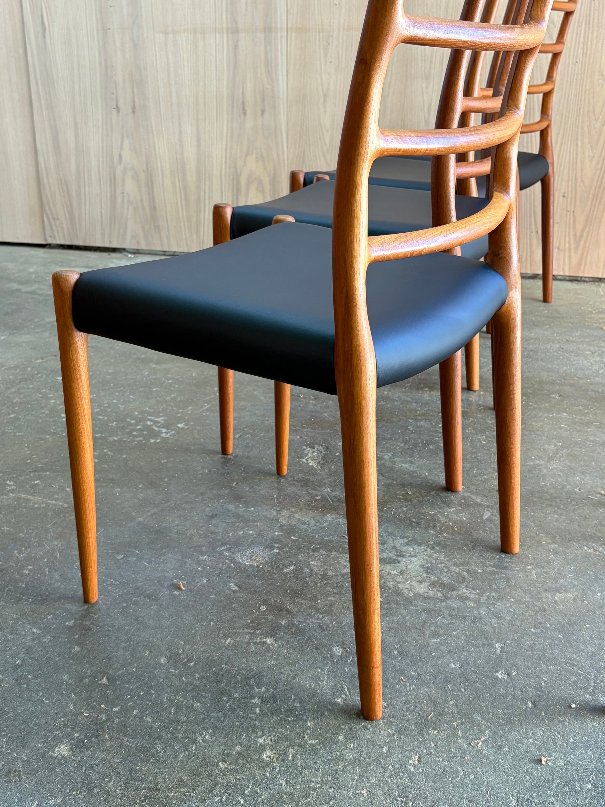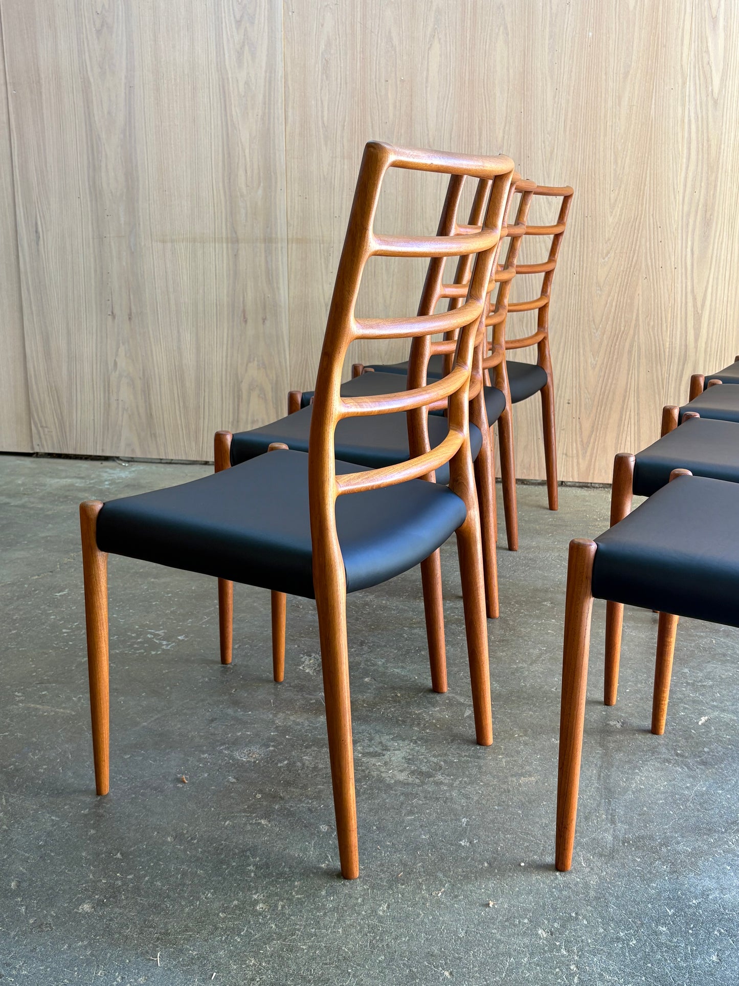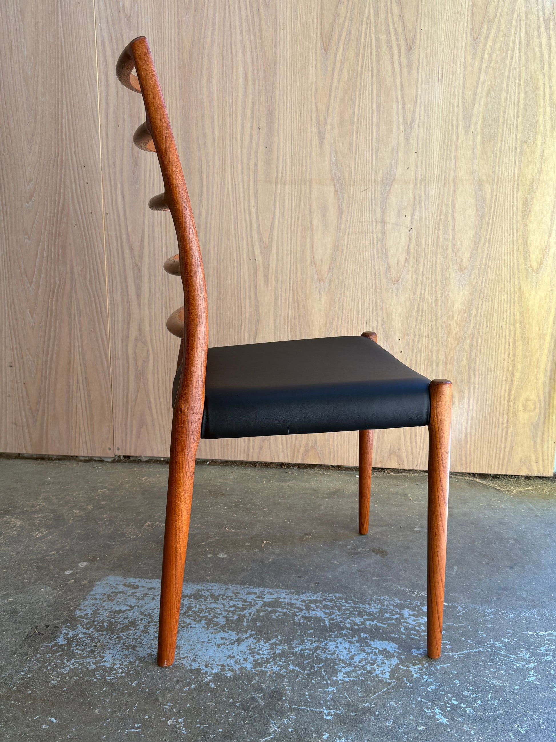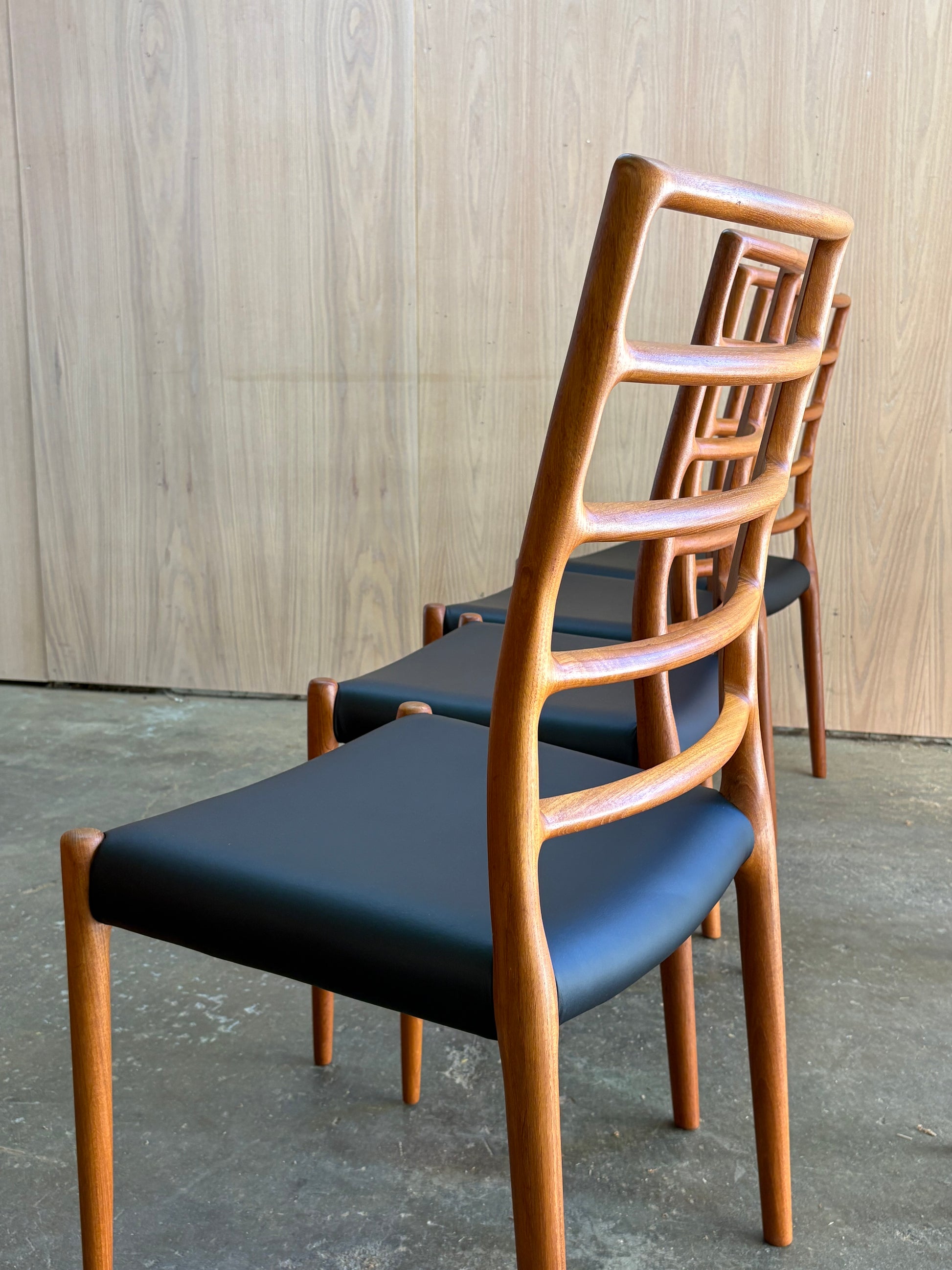 Lovingly maintained over the decades, each chair has been freshly cleaned and polished by our team and newly upholstered in top quality Italian black leather for a timeless and durable finish. A perfect harmony of comfort, craftsmanship, and sculptural form—these are among the most sought-after chairs of the Danish modern era.