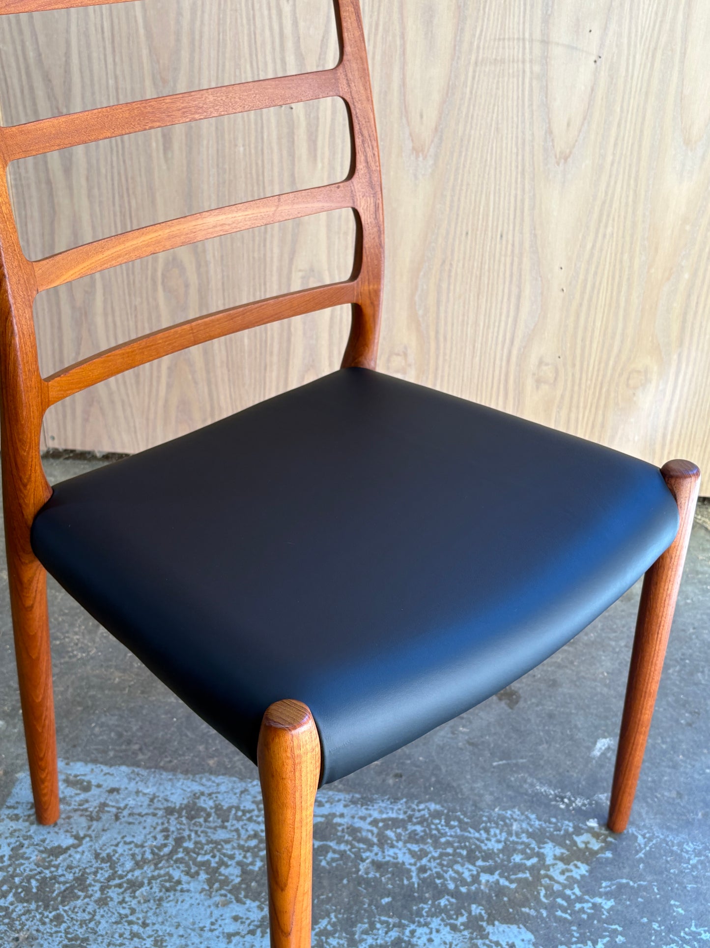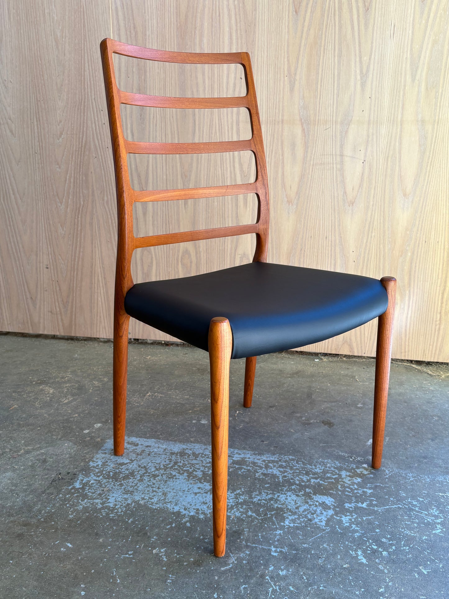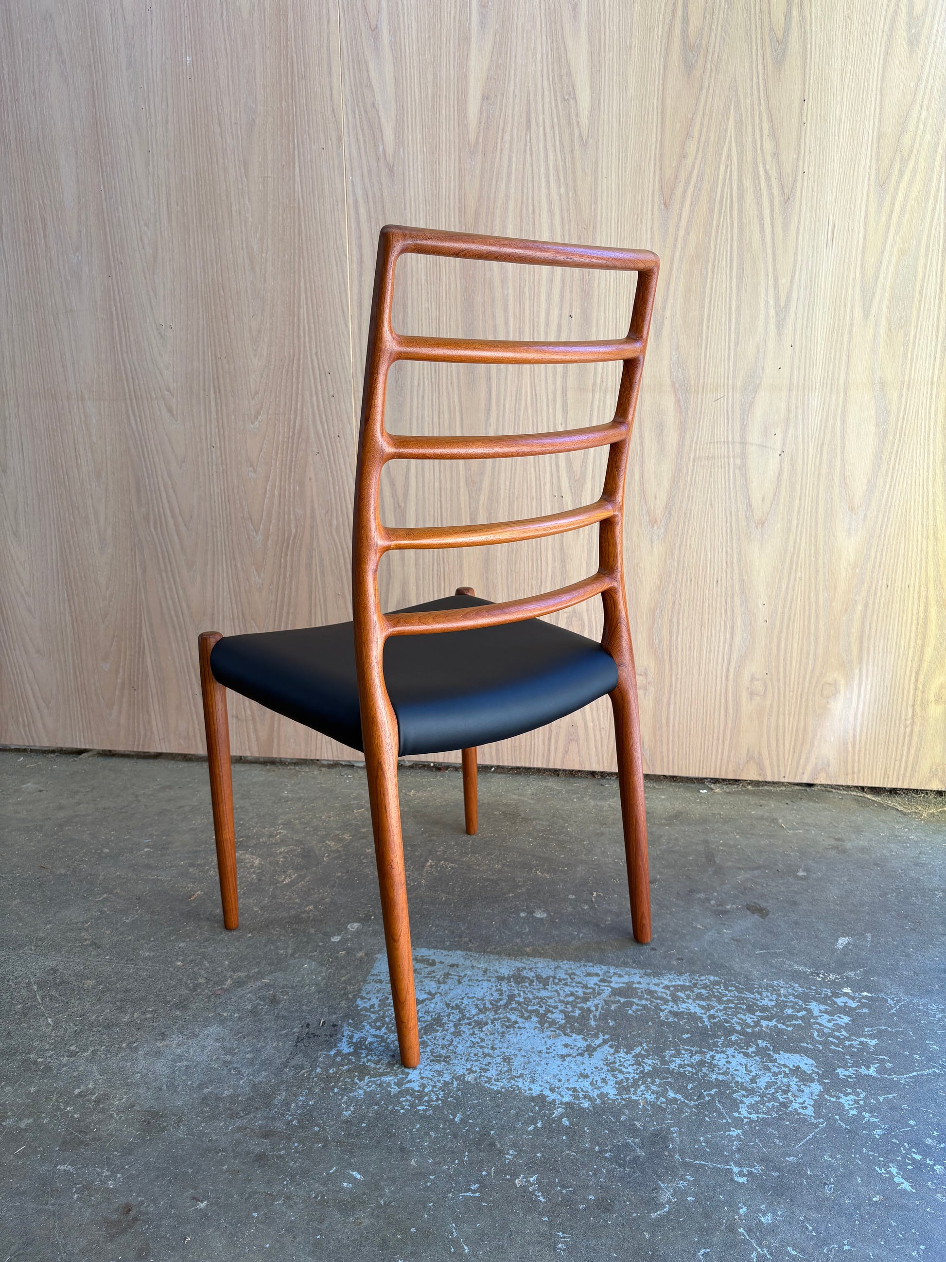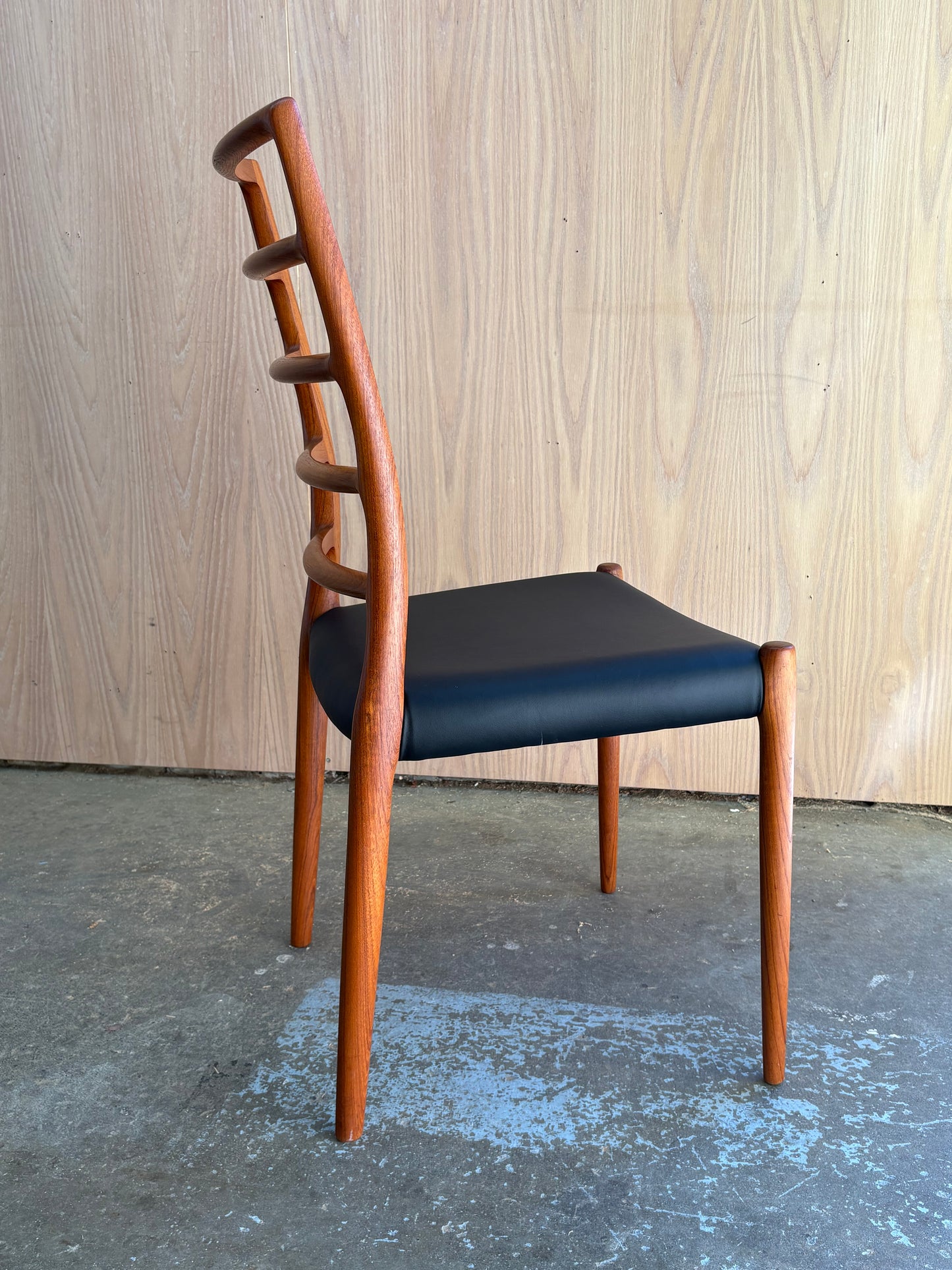 Lovingly maintained over the decades, each chair has been freshly cleaned and polished by our team and newly upholstered in top quality Italian black leather for a timeless and durable finish. A perfect harmony of comfort, craftsmanship, and sculptural form—these are among the most sought-after chairs of the Danish modern era.