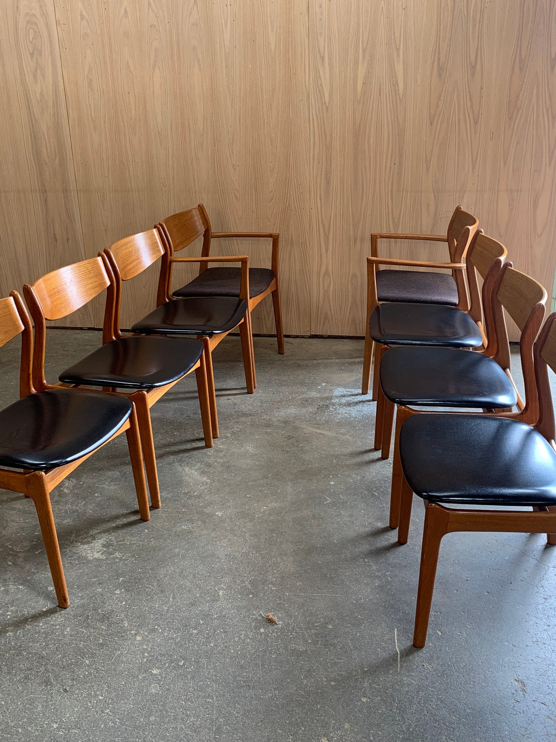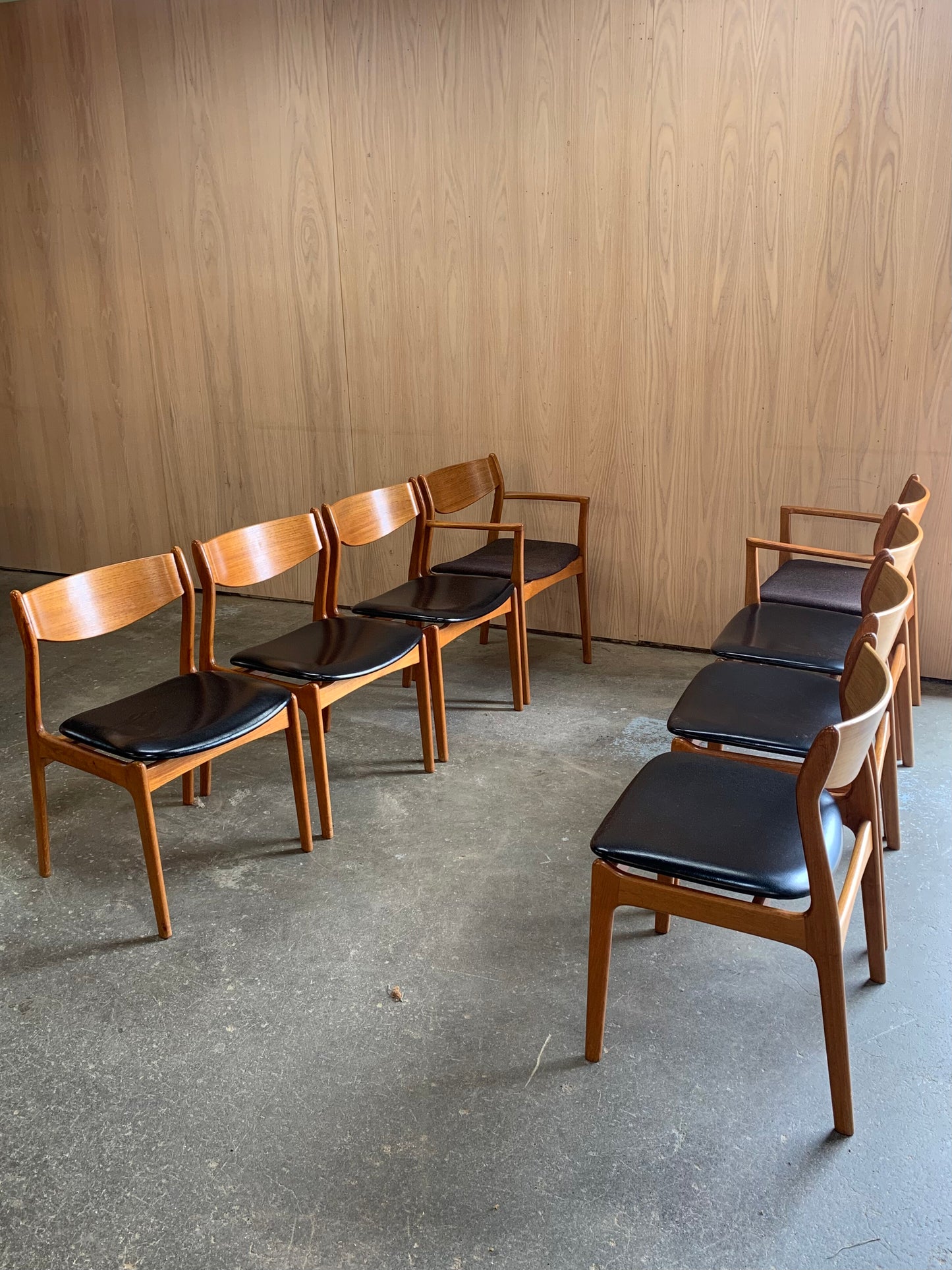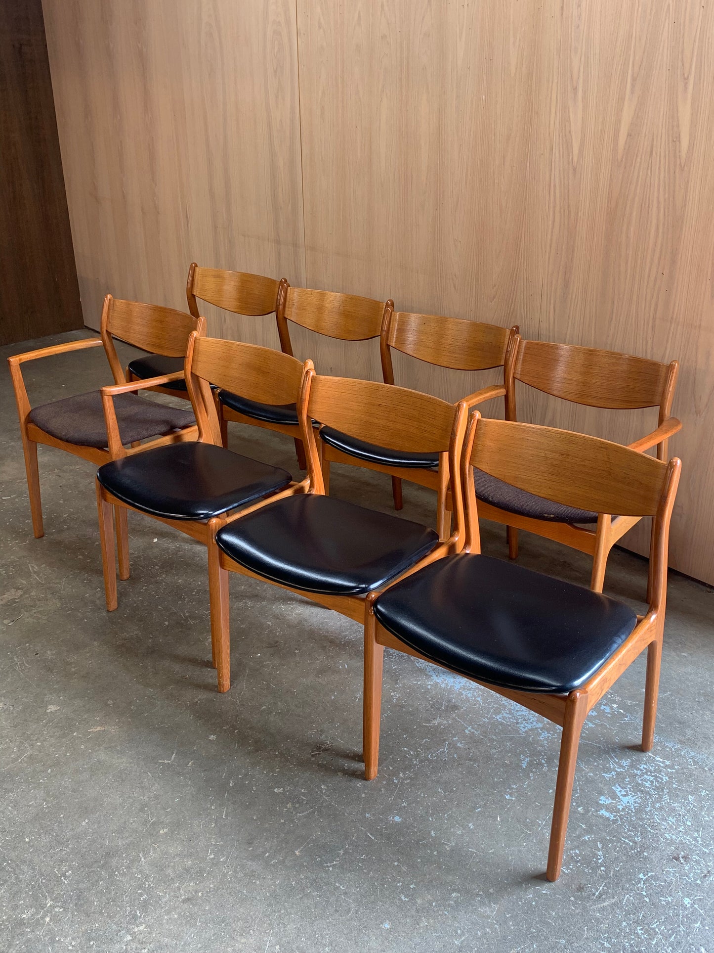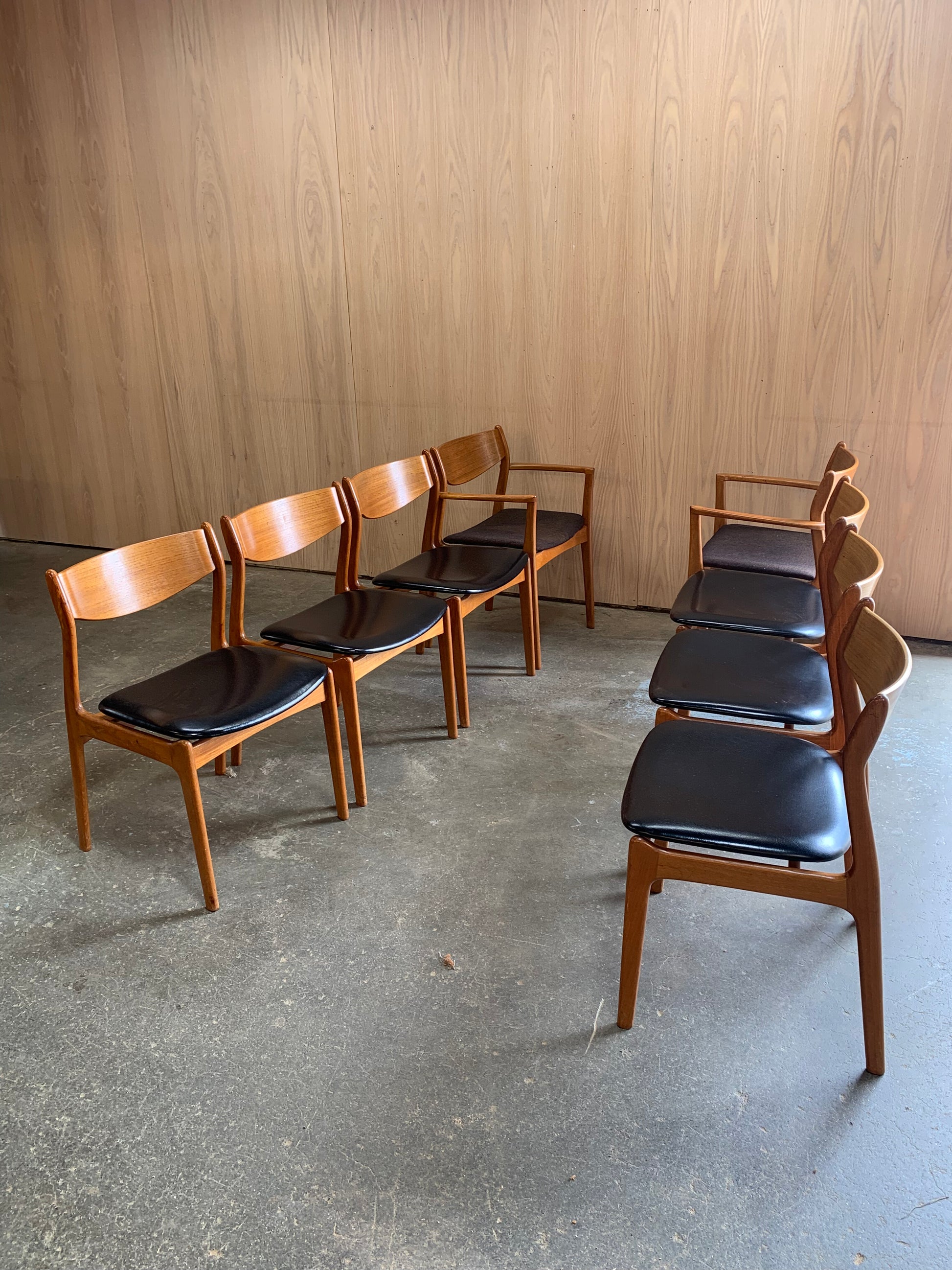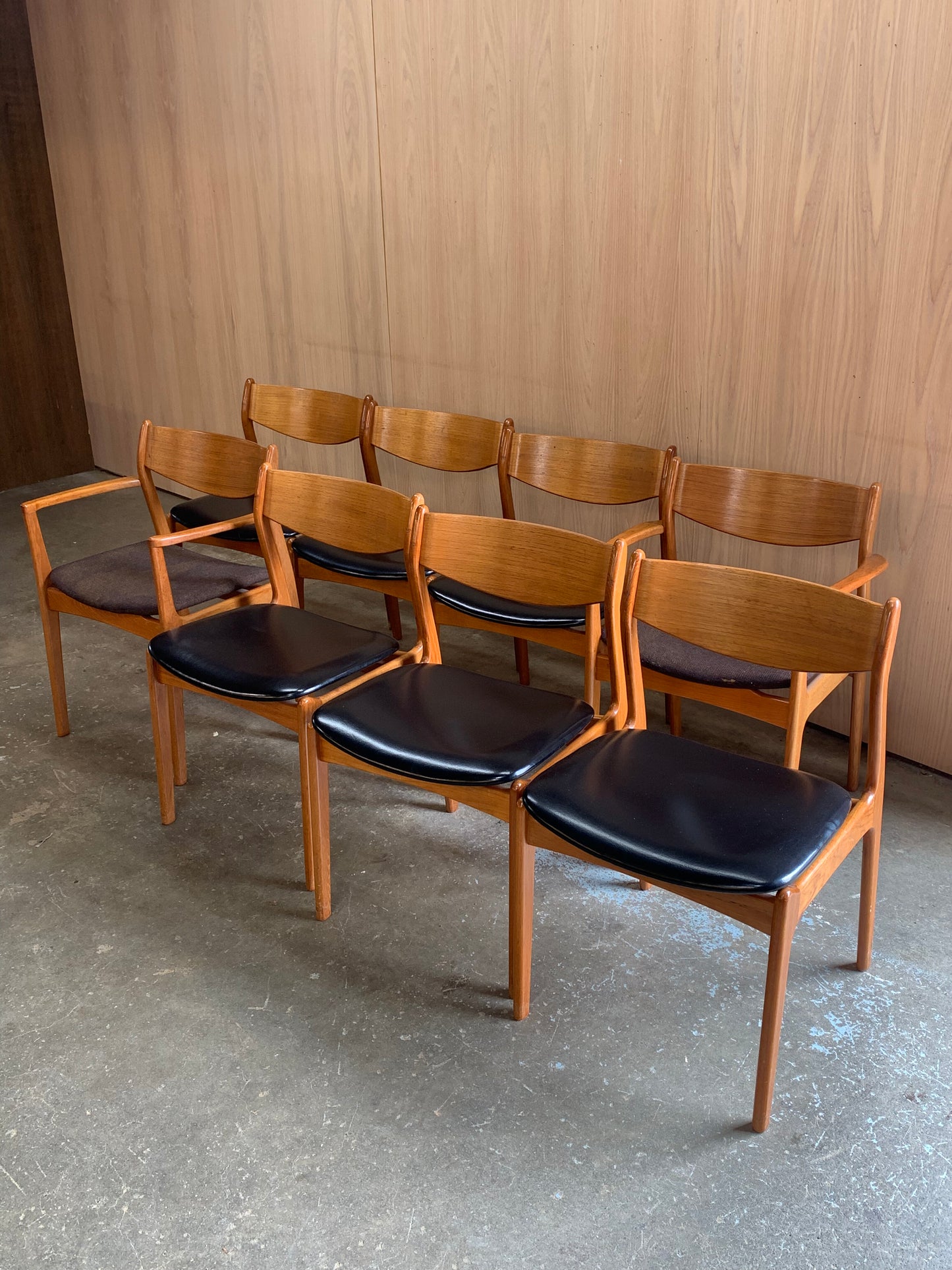 A rare and cohesive set of eight vintage Danish teak dining chairs, including six side chairs and a matching pair of armchairs. The sculptural lines, curved backrests, and solid craftsmanship speak to the timeless elegance of mid-century design. Freshly cleaned and polished, each chair is in excellent condition. Complete original sets like this—especially with armchairs—are increasingly hard to come by. Listing is for the chairs only, but we also have the original solid teak dining table available.