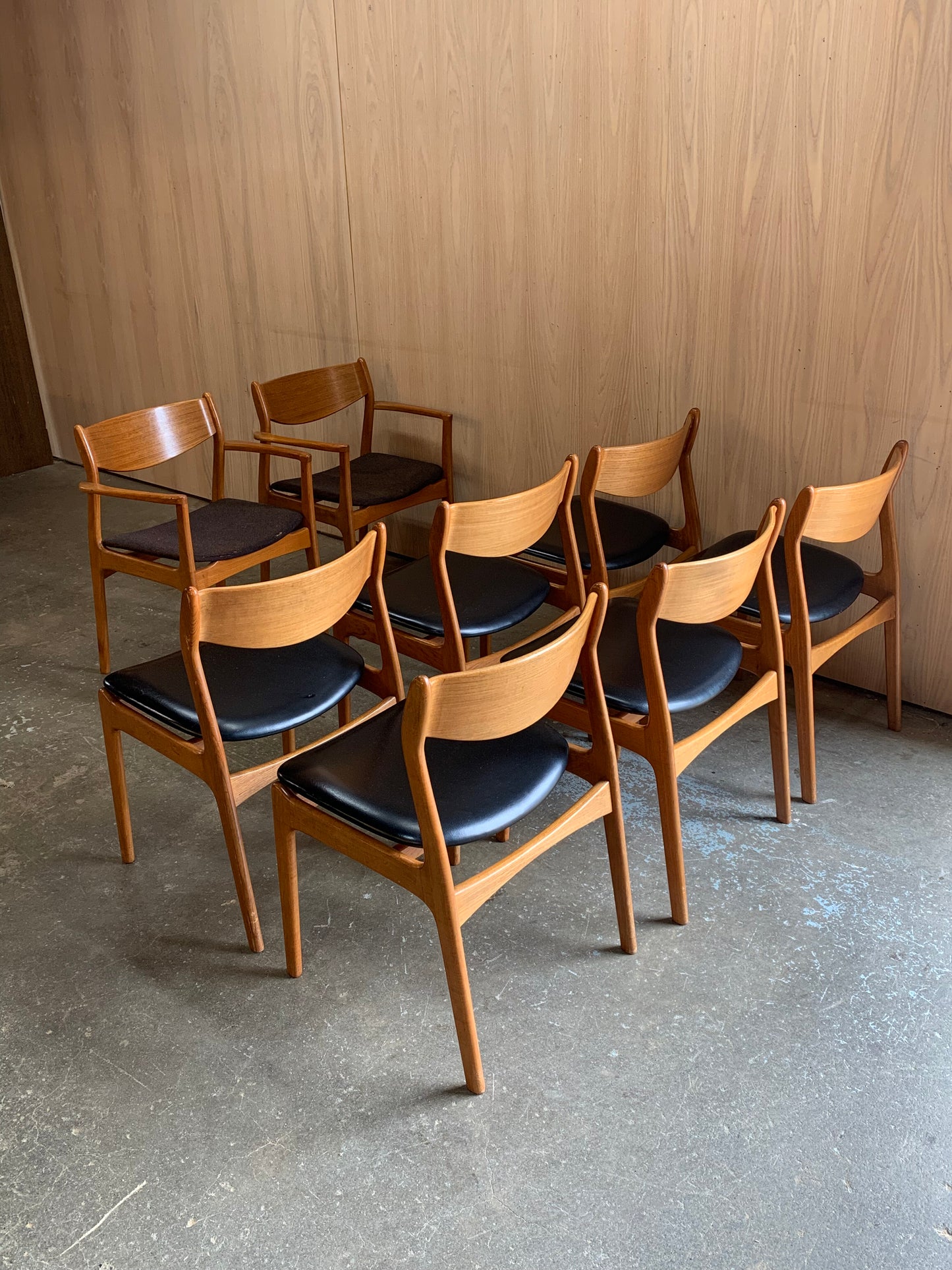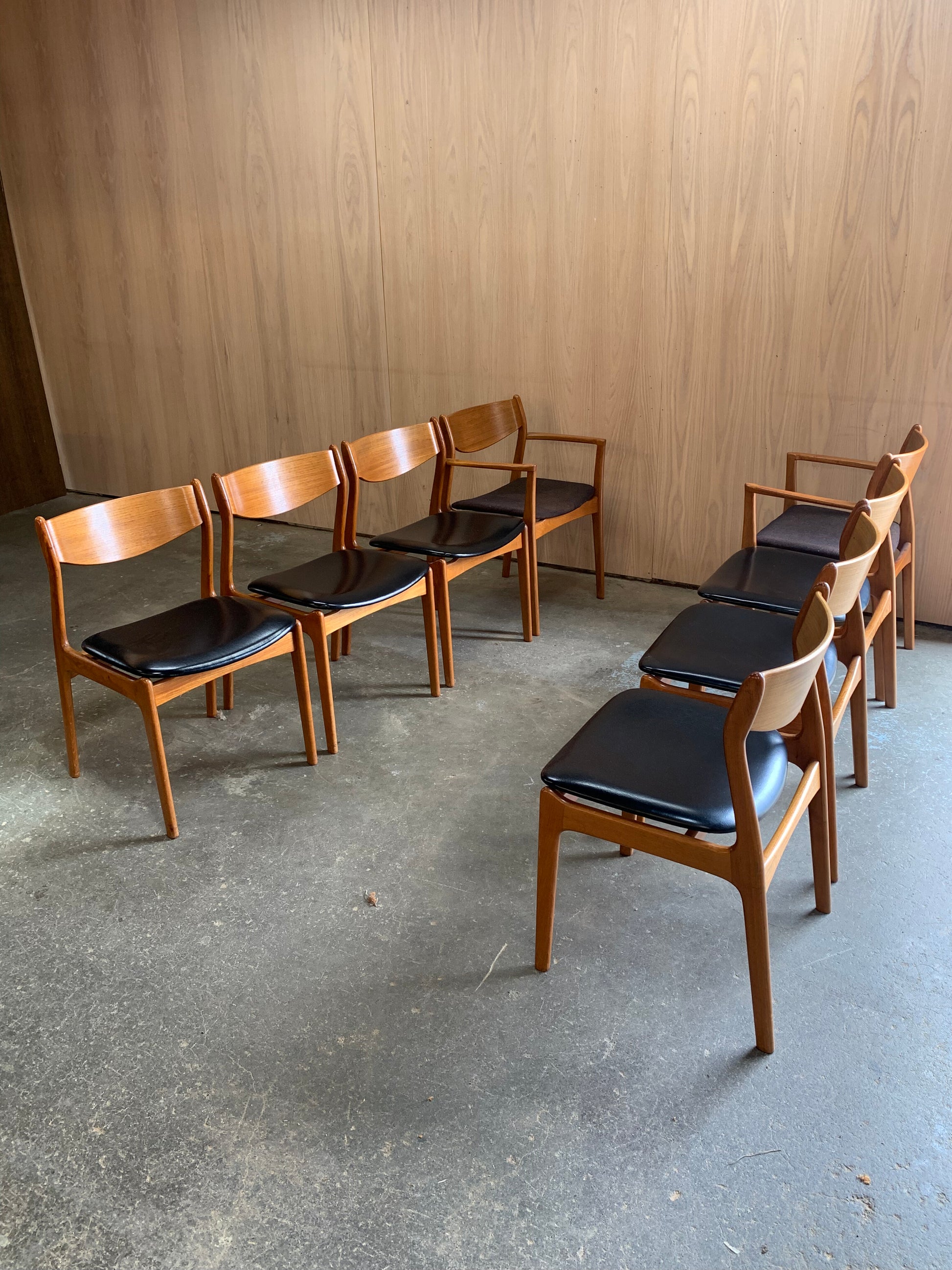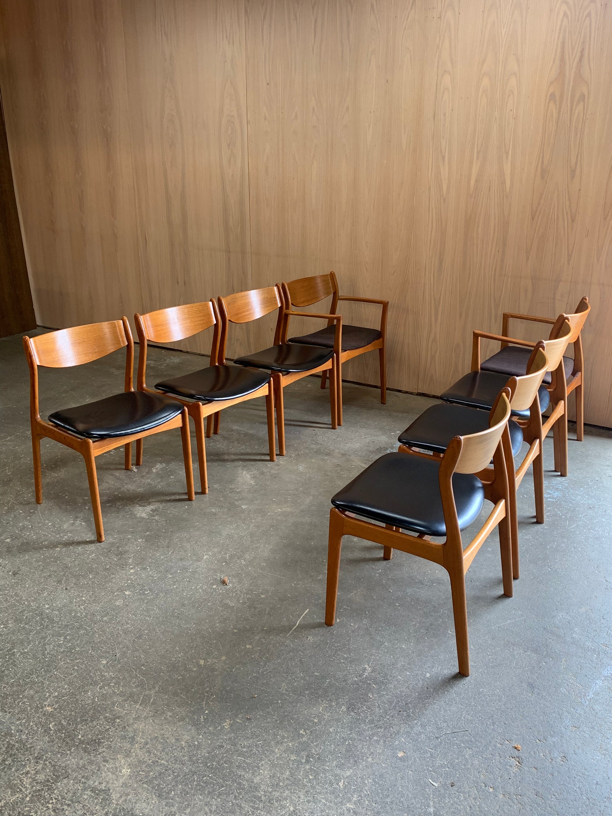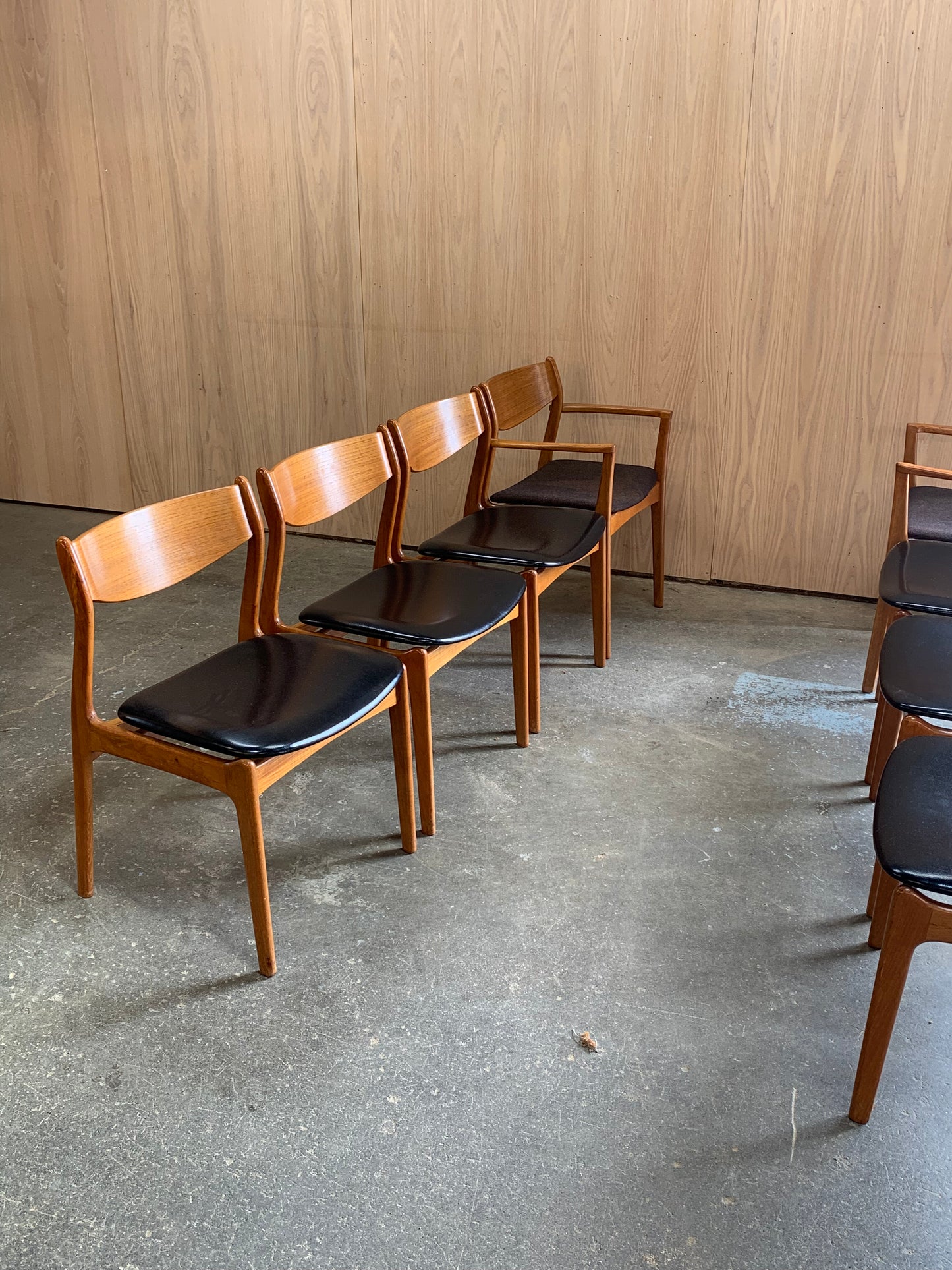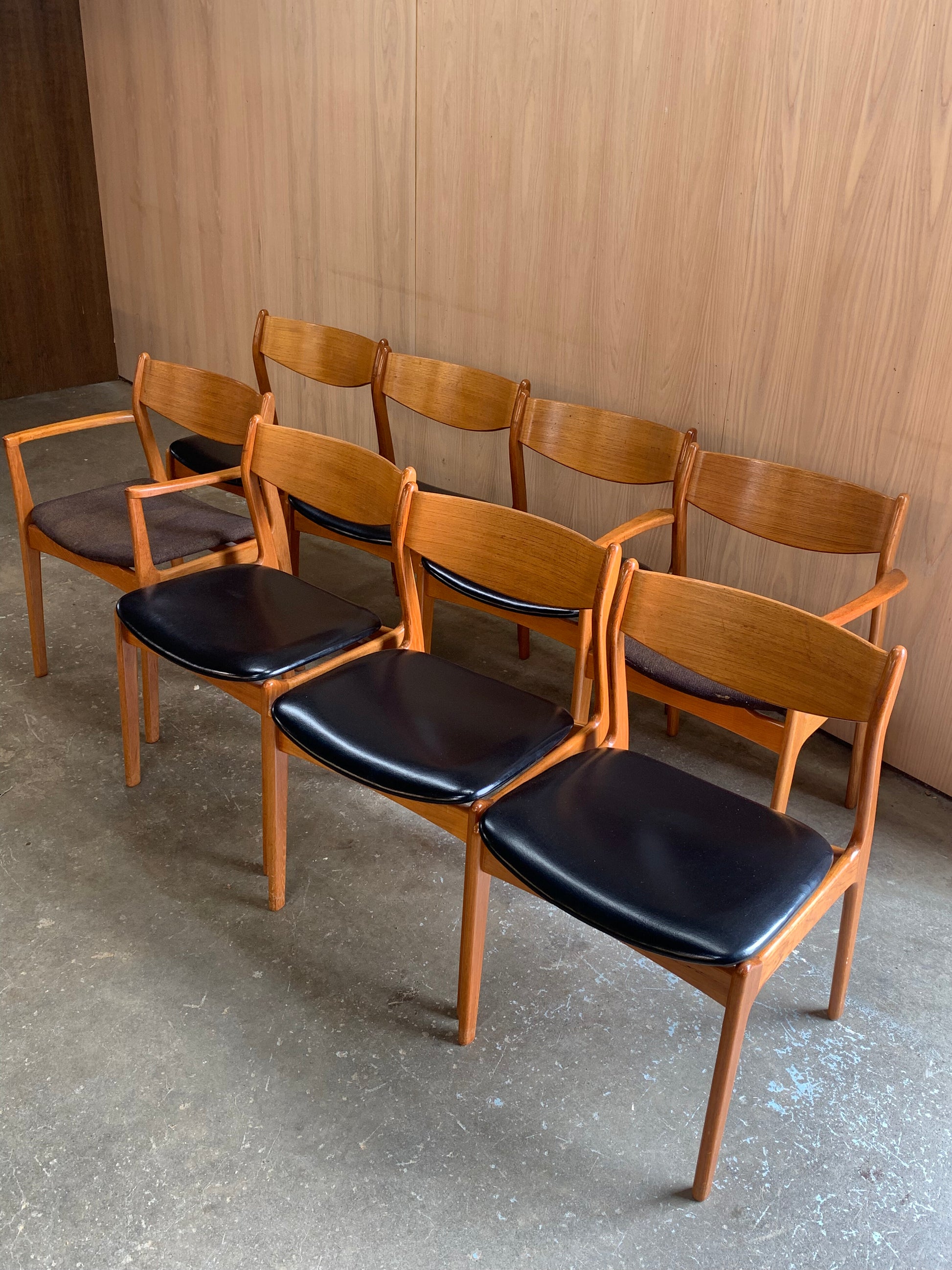A rare and cohesive set of eight vintage Danish teak dining chairs, including six side chairs and a matching pair of armchairs. The sculptural lines, curved backrests, and solid craftsmanship speak to the timeless elegance of mid-century design. Freshly cleaned and polished, each chair is in excellent condition. Complete original sets like this—especially with armchairs—are increasingly hard to come by. Listing is for the chairs only, but we also have the original solid teak dining table available.