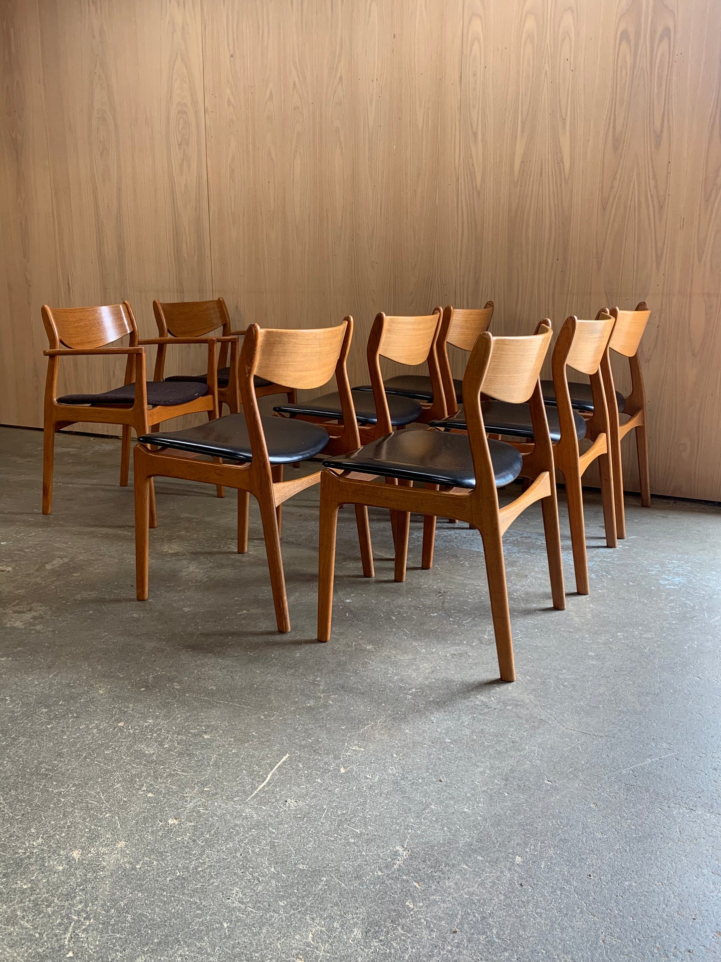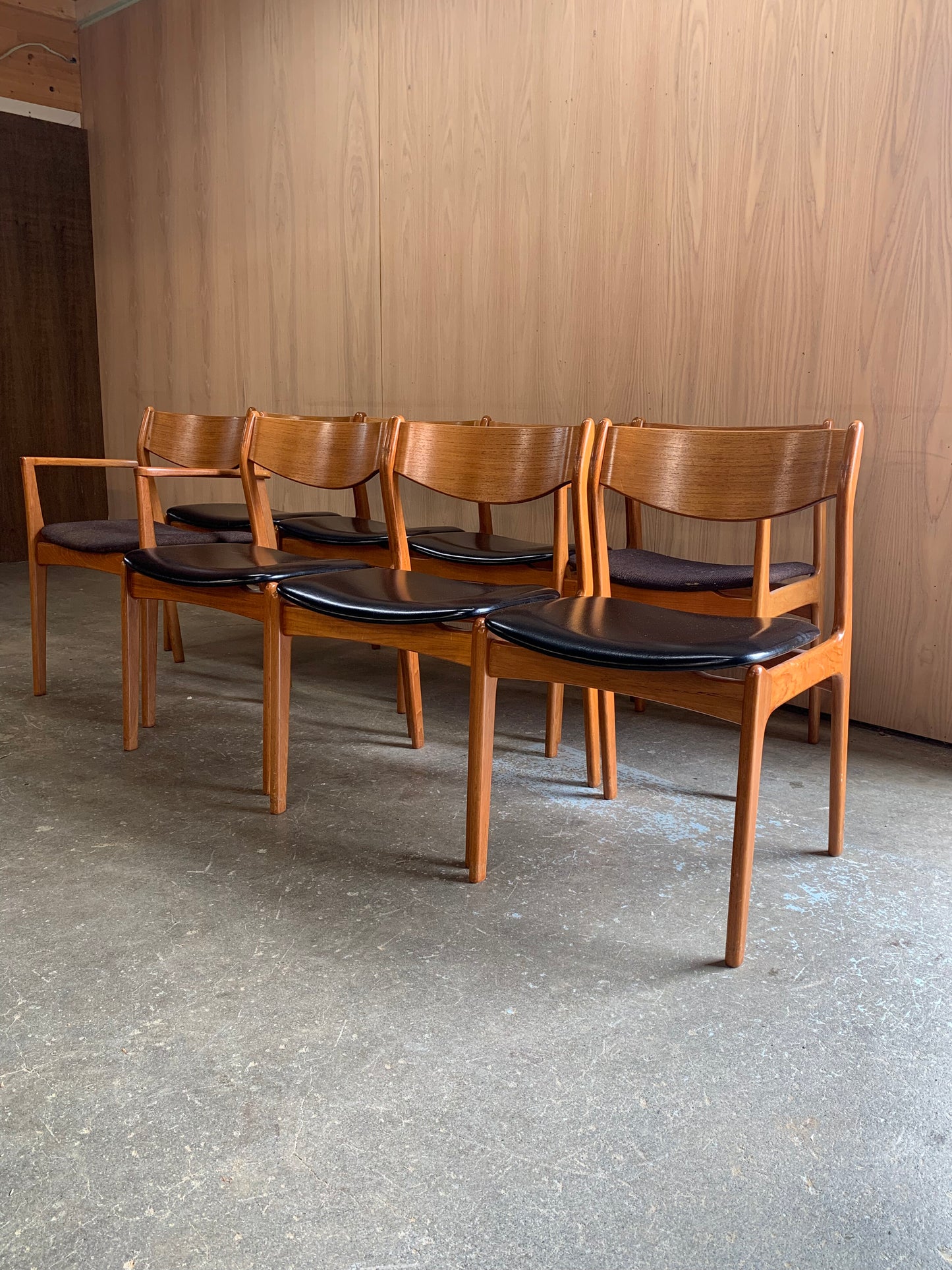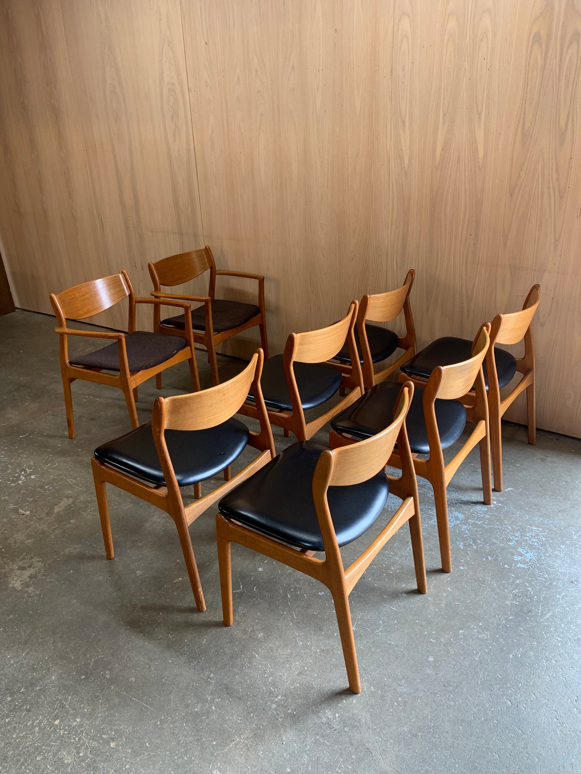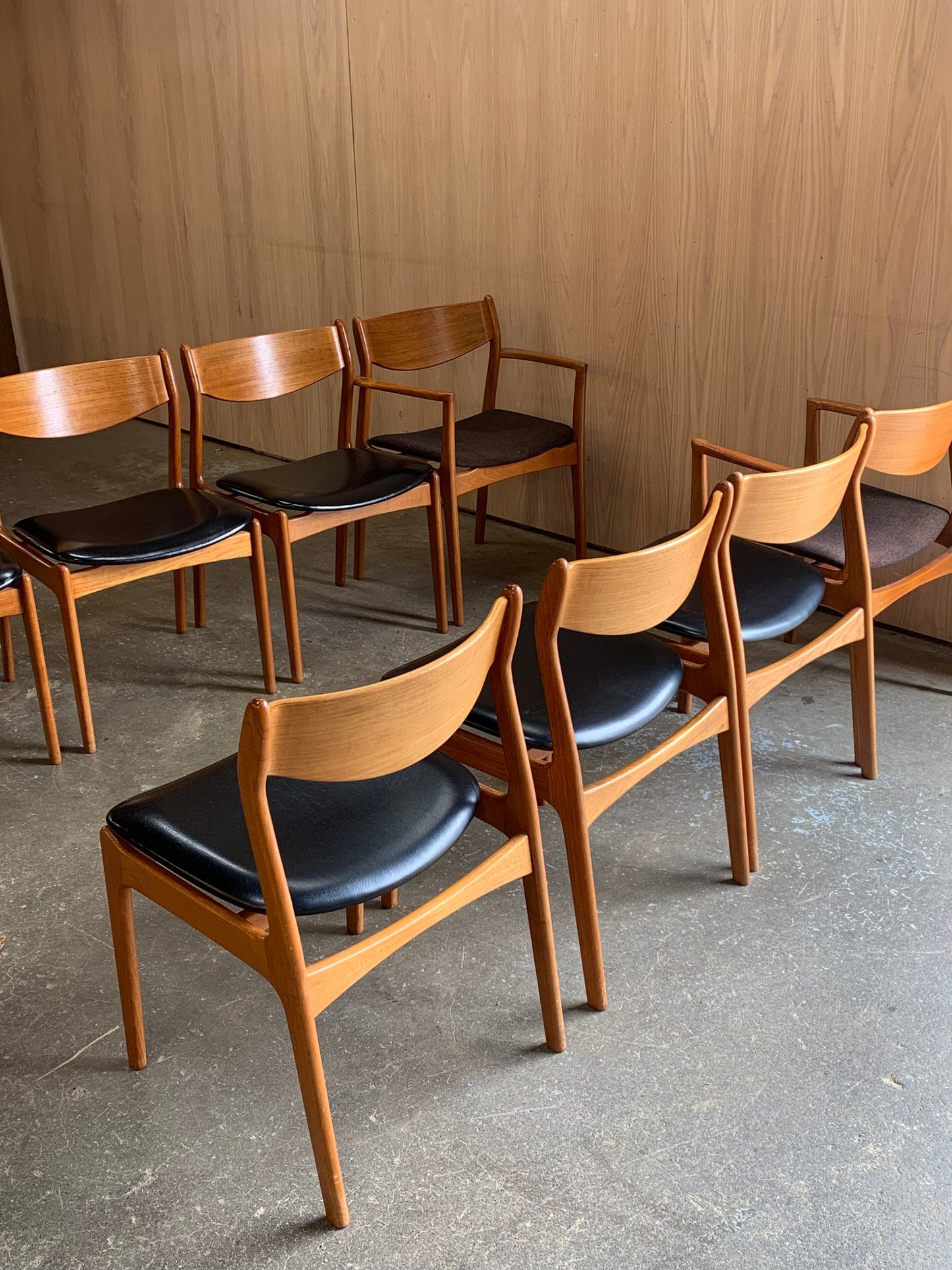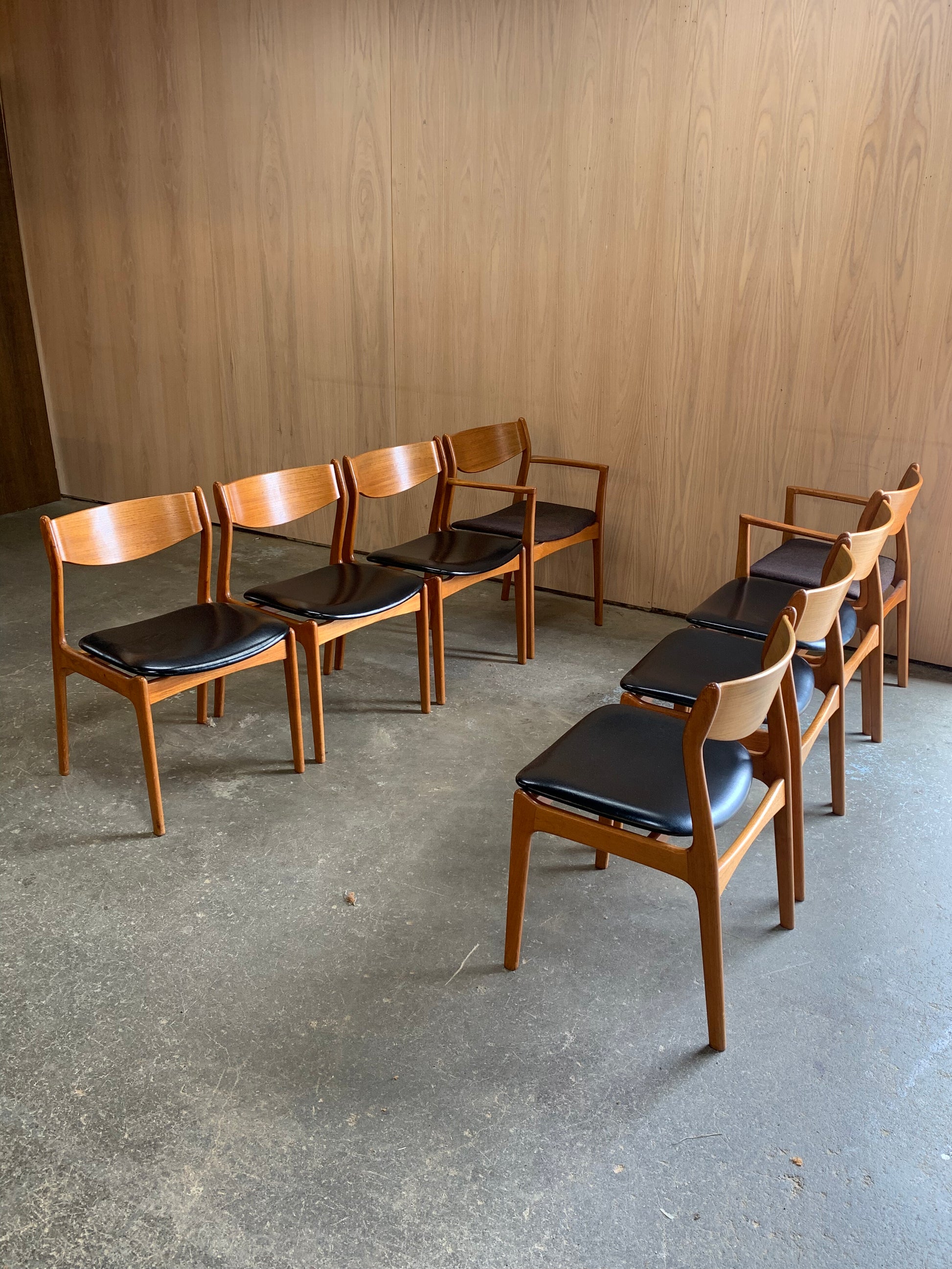A rare and cohesive set of eight vintage Danish teak dining chairs, including six side chairs and a matching pair of armchairs. The sculptural lines, curved backrests, and solid craftsmanship speak to the timeless elegance of mid-century design. Freshly cleaned and polished, each chair is in excellent condition. Complete original sets like this—especially with armchairs—are increasingly hard to come by. Listing is for the chairs only, but we also have the original solid teak dining table available.