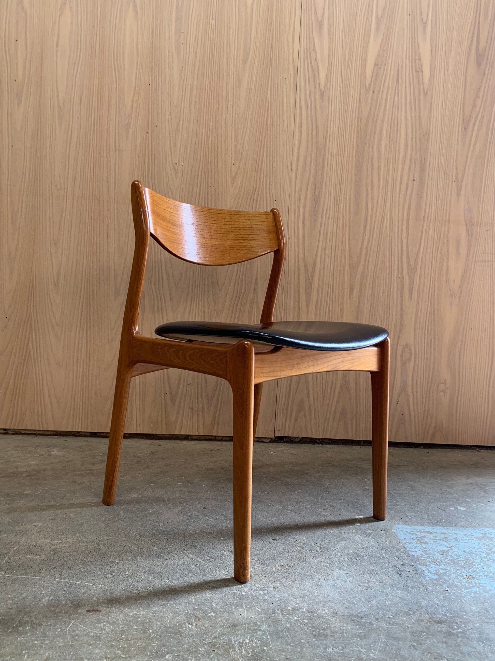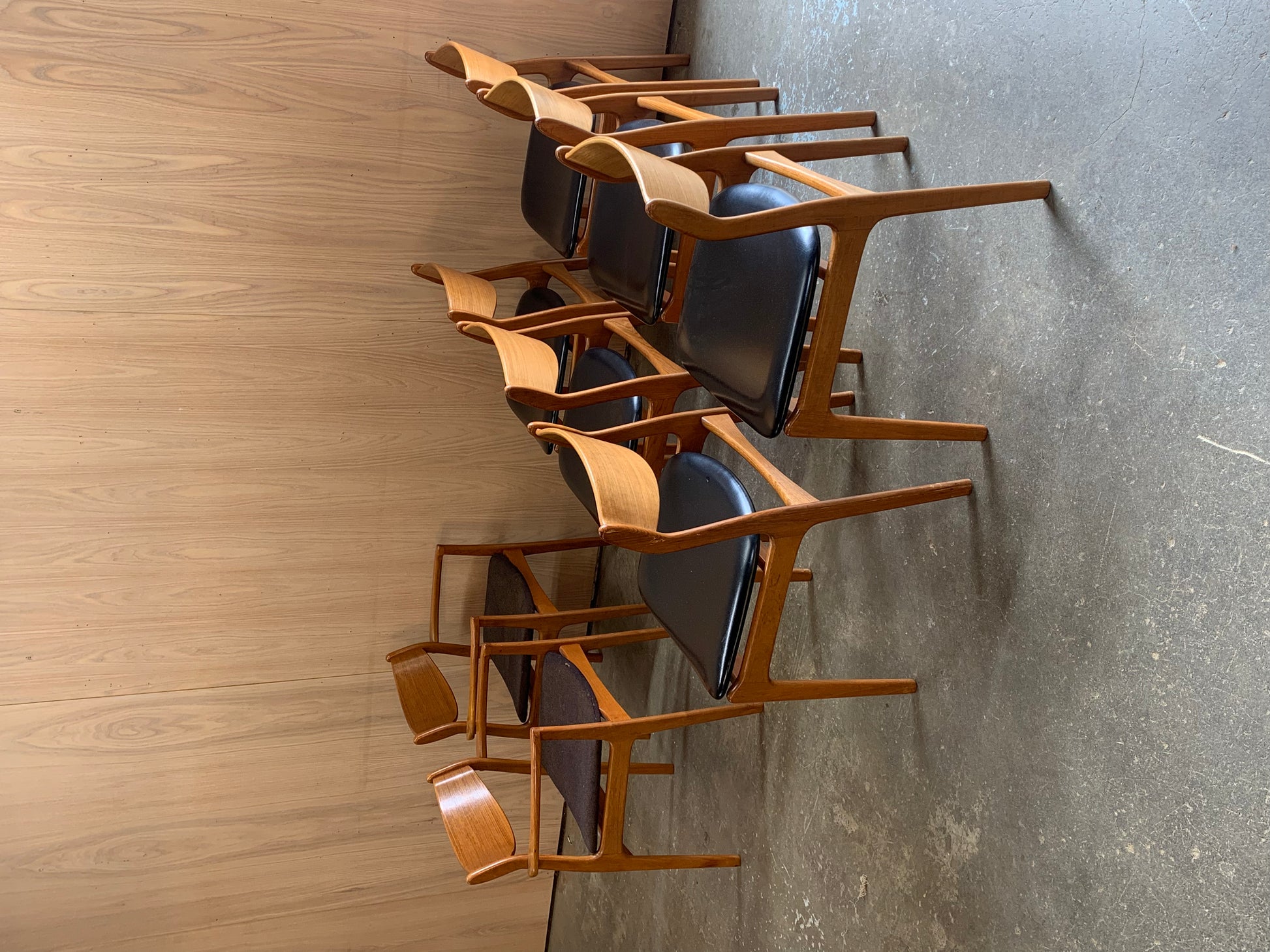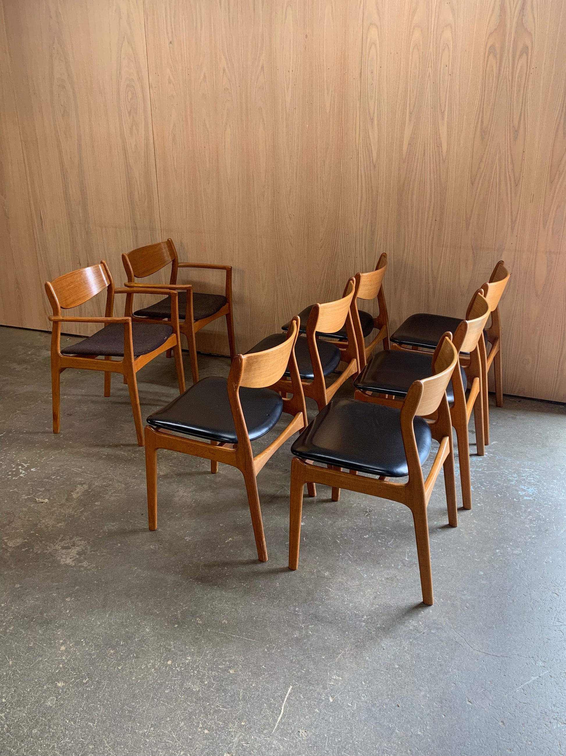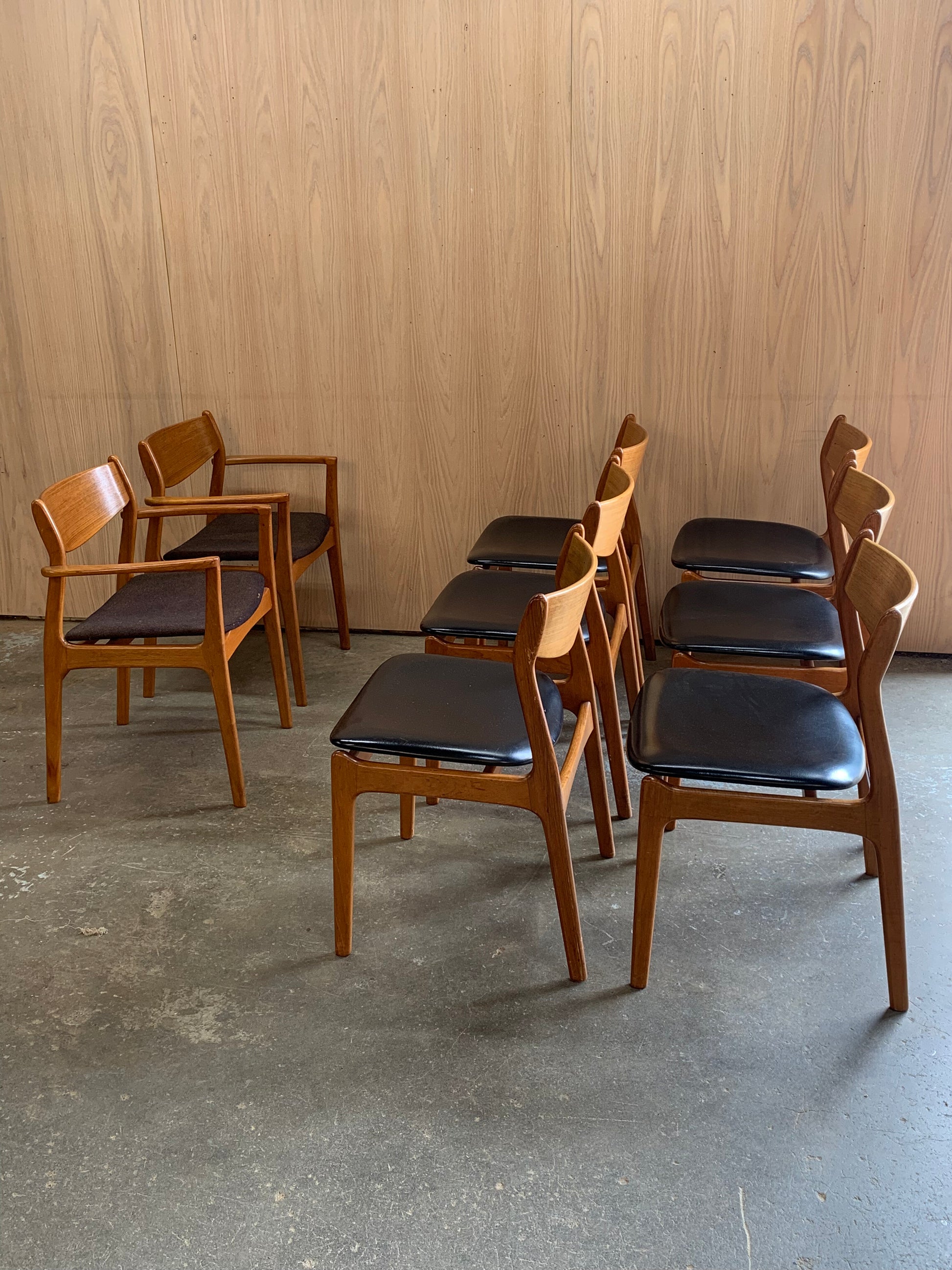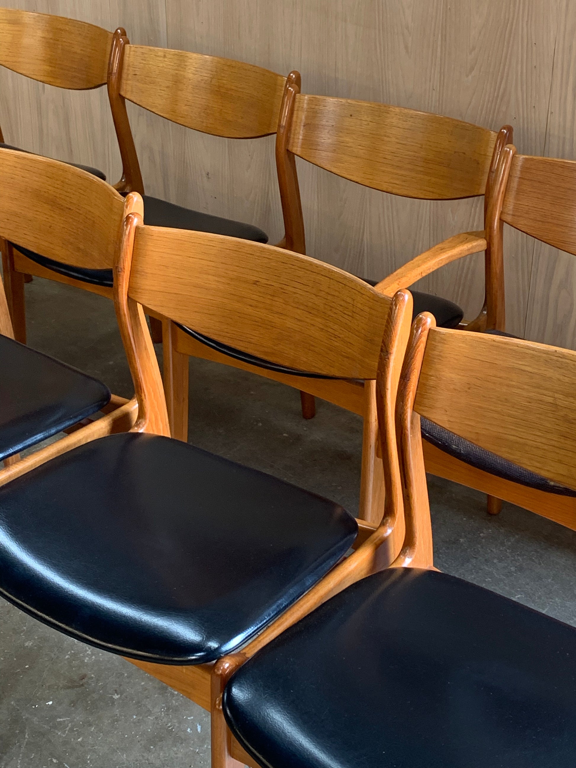 A rare and cohesive set of eight vintage Danish teak dining chairs, including six side chairs and a matching pair of armchairs. The sculptural lines, curved backrests, and solid craftsmanship speak to the timeless elegance of mid-century design. Freshly cleaned and polished, each chair is in excellent condition. Complete original sets like this—especially with armchairs—are increasingly hard to come by. Listing is for the chairs only, but we also have the original solid teak dining table available.