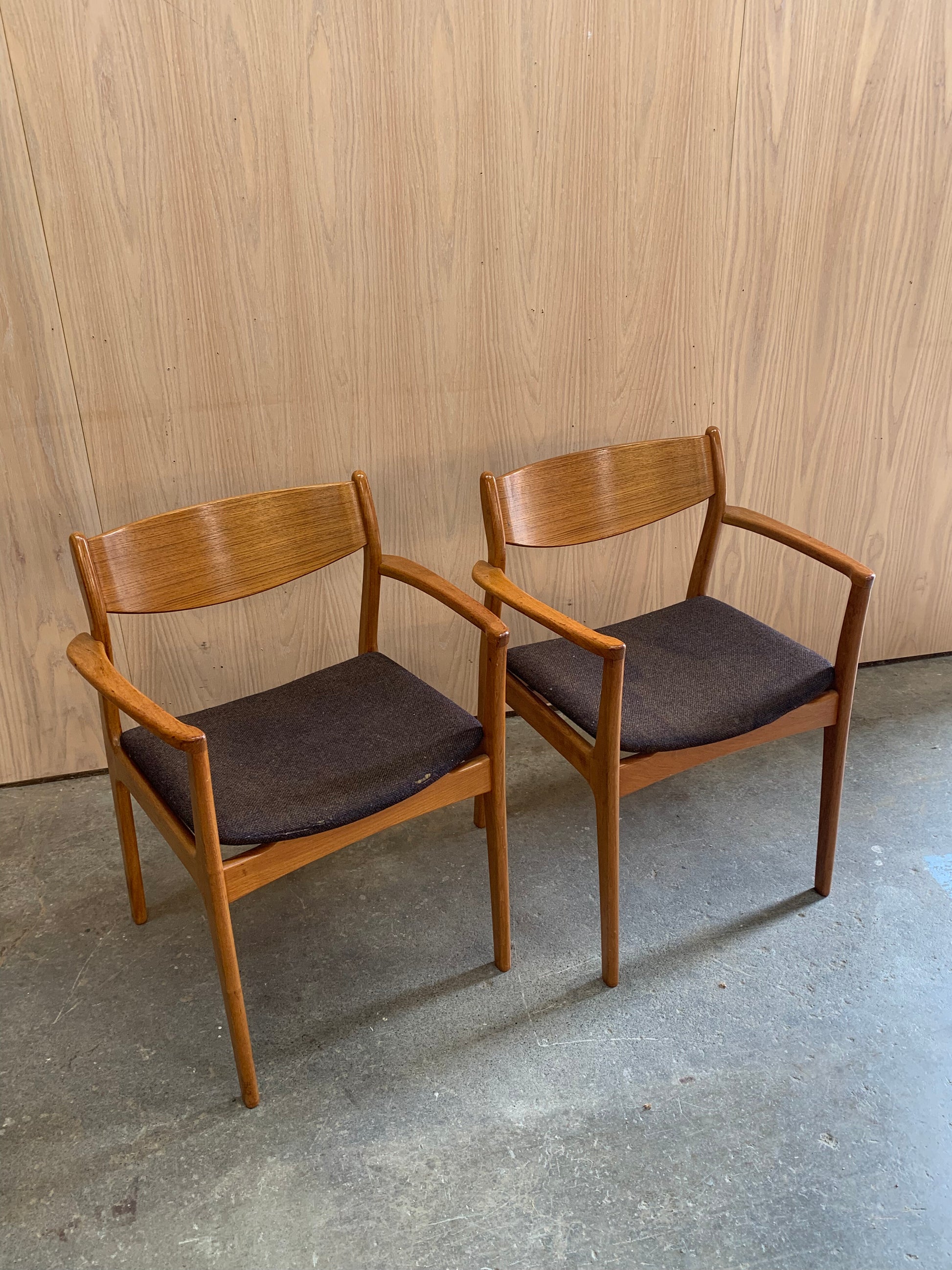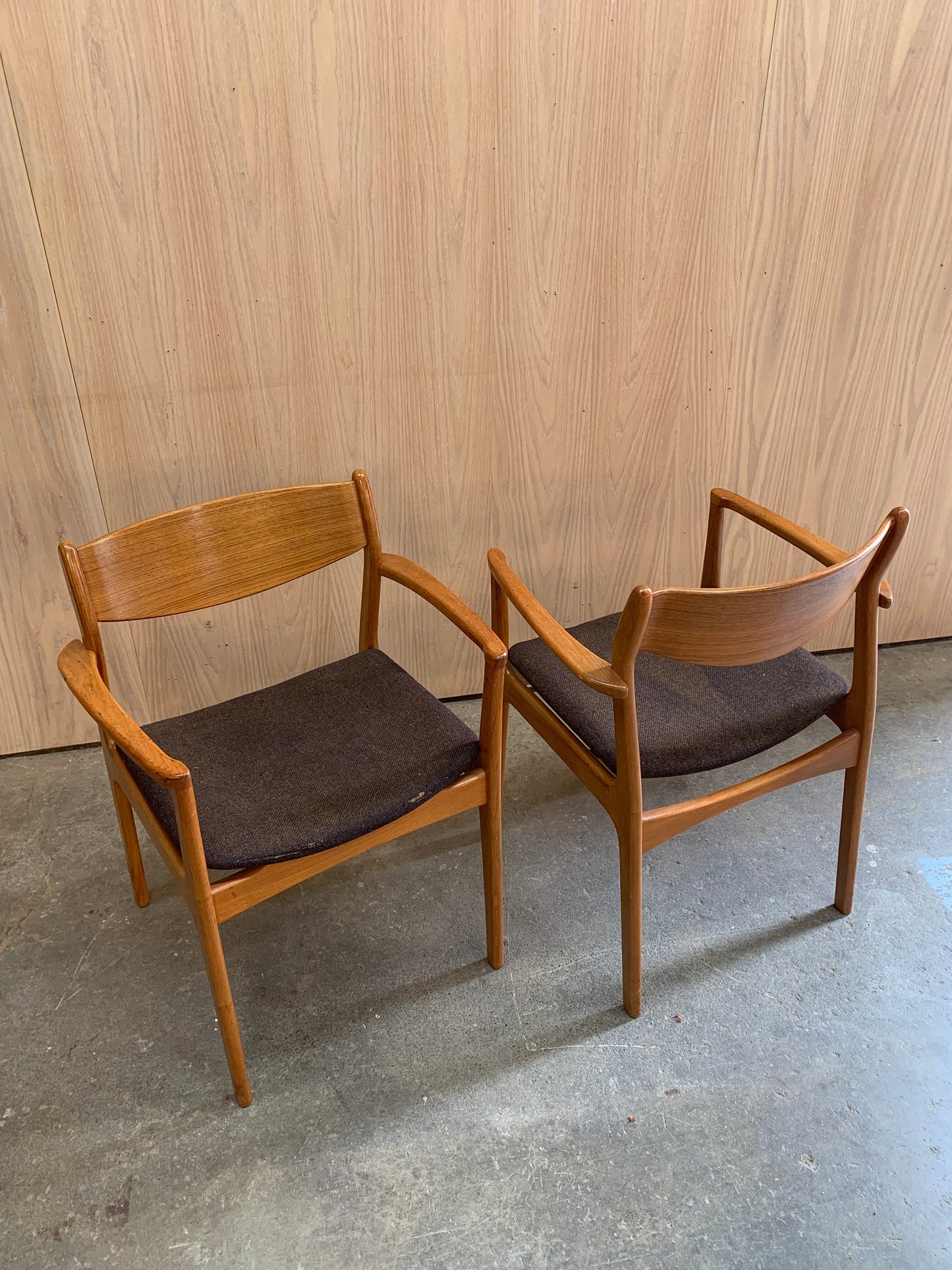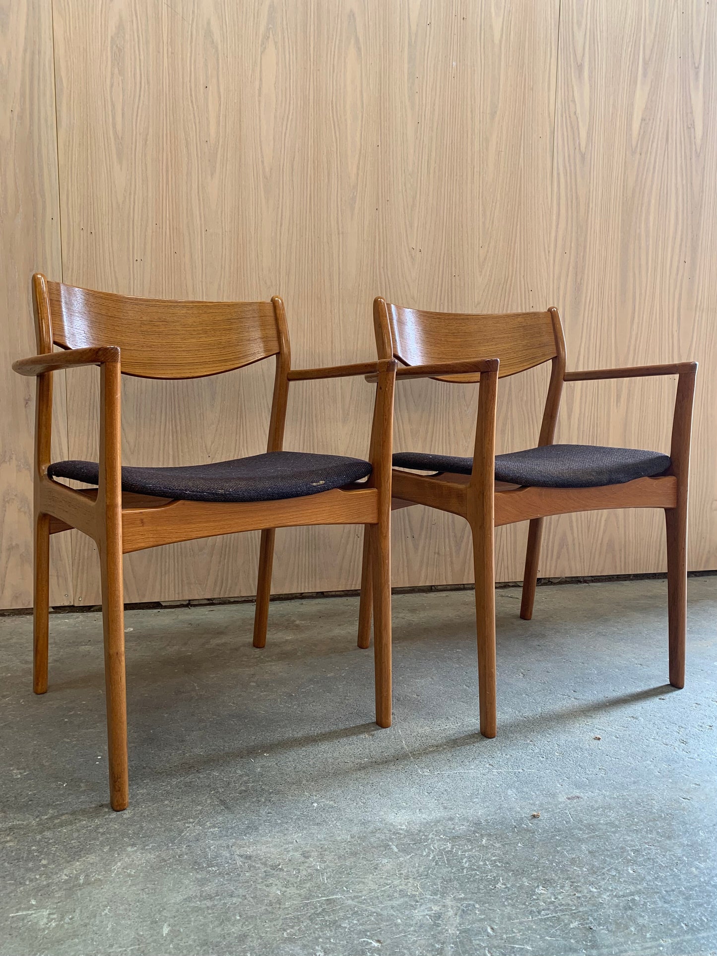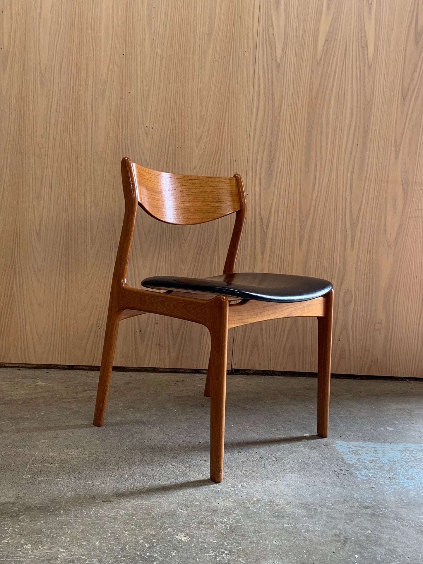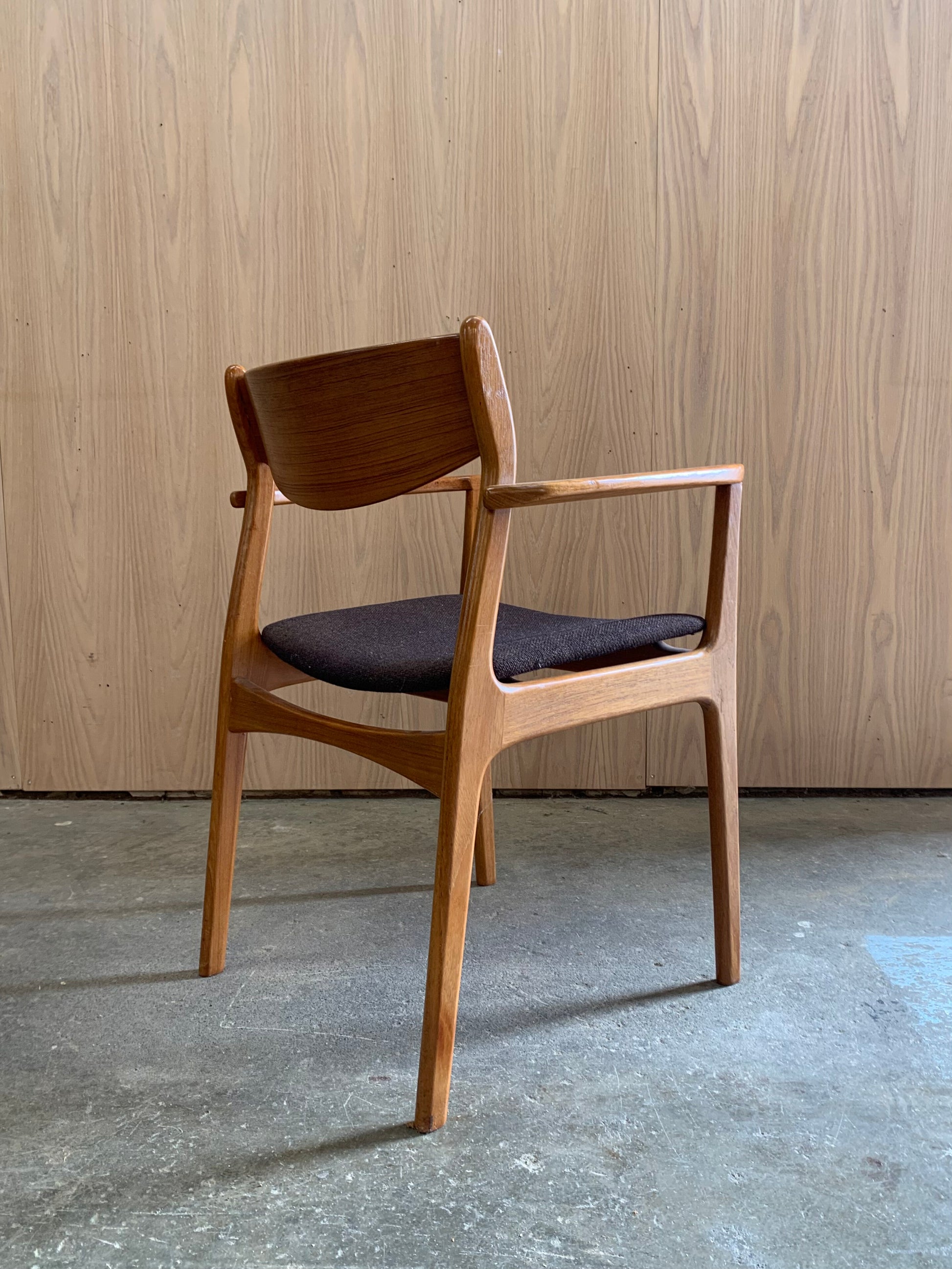 A rare and cohesive set of eight vintage Danish teak dining chairs, including six side chairs and a matching pair of armchairs. The sculptural lines, curved backrests, and solid craftsmanship speak to the timeless elegance of mid-century design. Freshly cleaned and polished, each chair is in excellent condition. Complete original sets like this—especially with armchairs—are increasingly hard to come by. Listing is for the chairs only, but we also have the original solid teak dining table available.