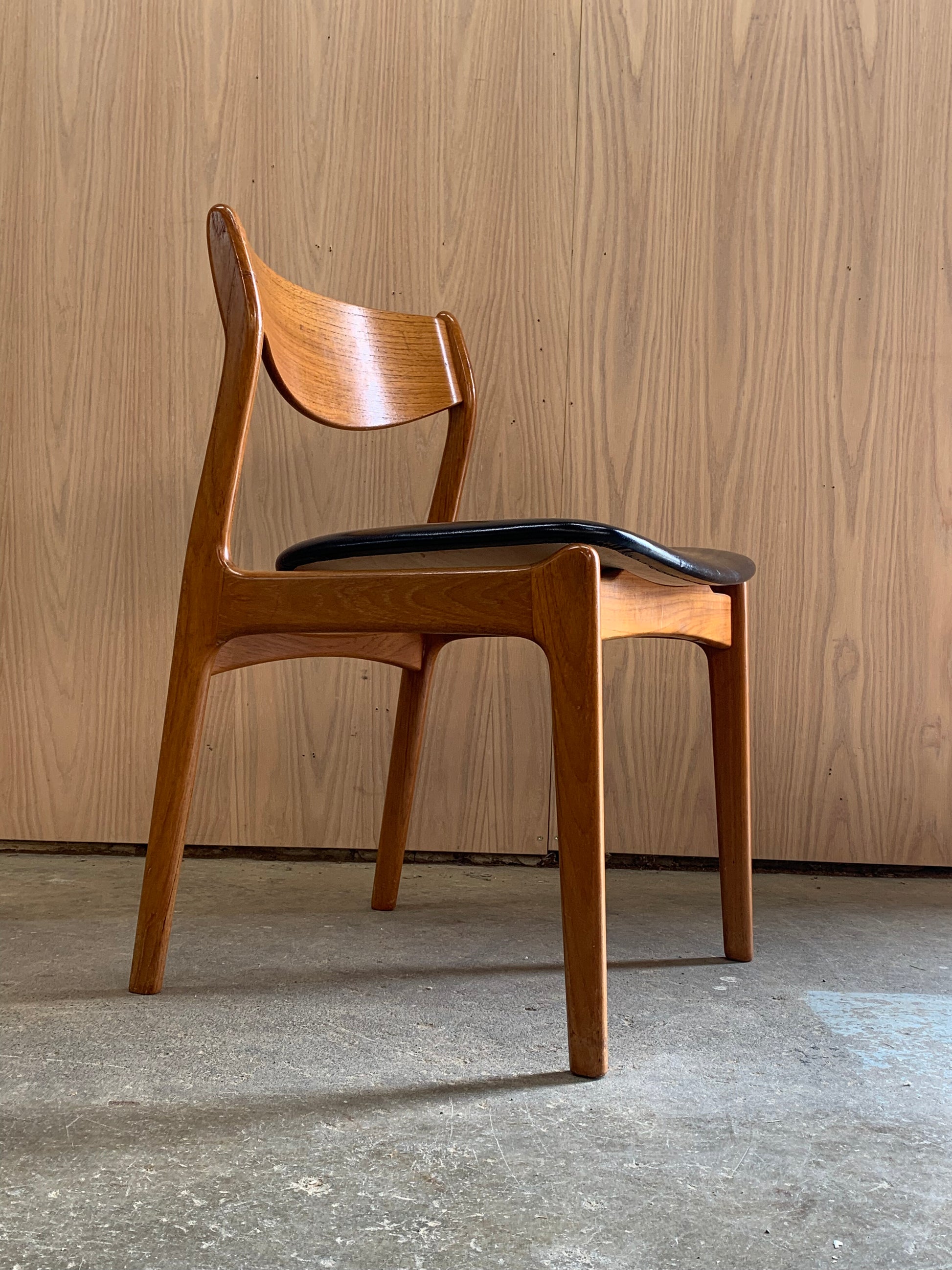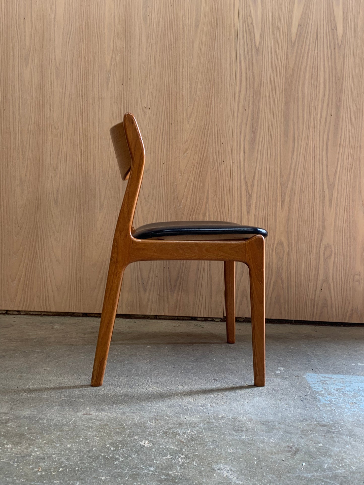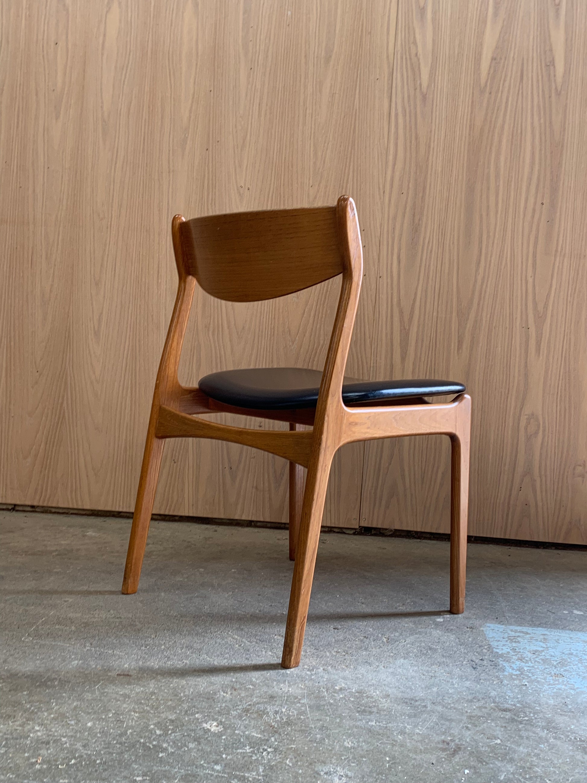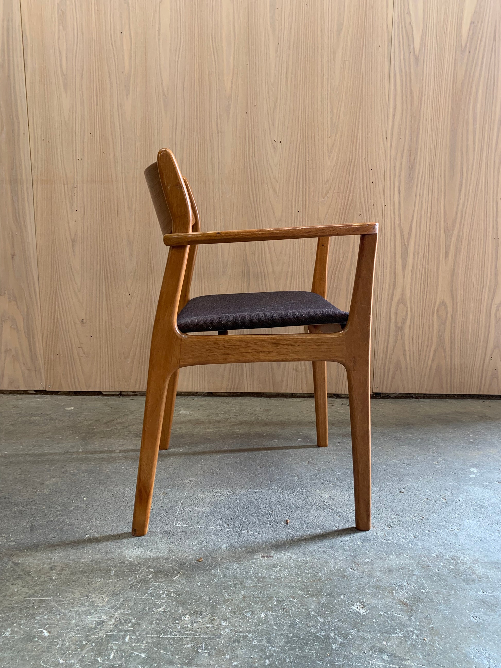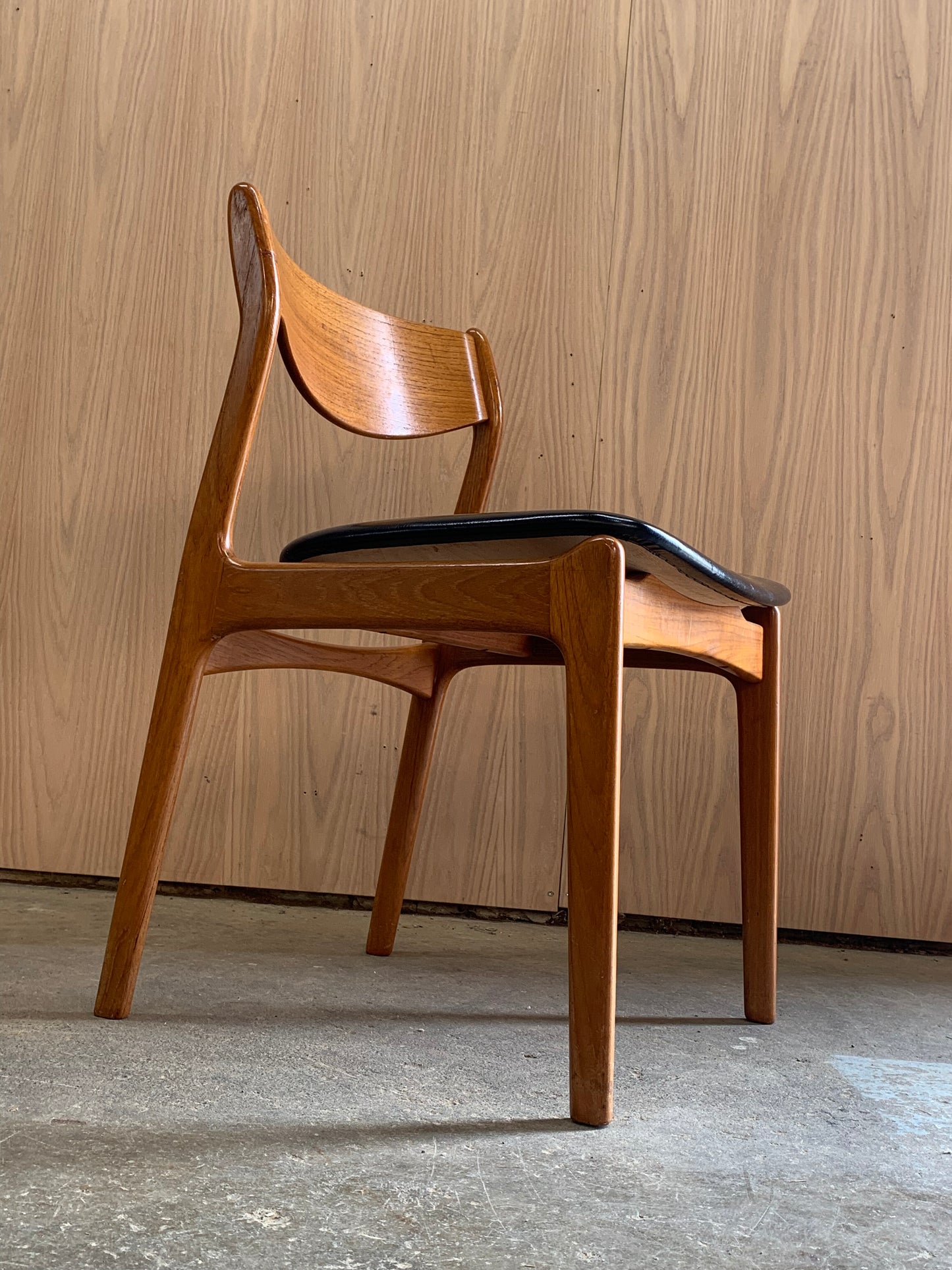 A rare and cohesive set of eight vintage Danish teak dining chairs, including six side chairs and a matching pair of armchairs. The sculptural lines, curved backrests, and solid craftsmanship speak to the timeless elegance of mid-century design. Freshly cleaned and polished, each chair is in excellent condition. Complete original sets like this—especially with armchairs—are increasingly hard to come by. Listing is for the chairs only, but we also have the original solid teak dining table available.