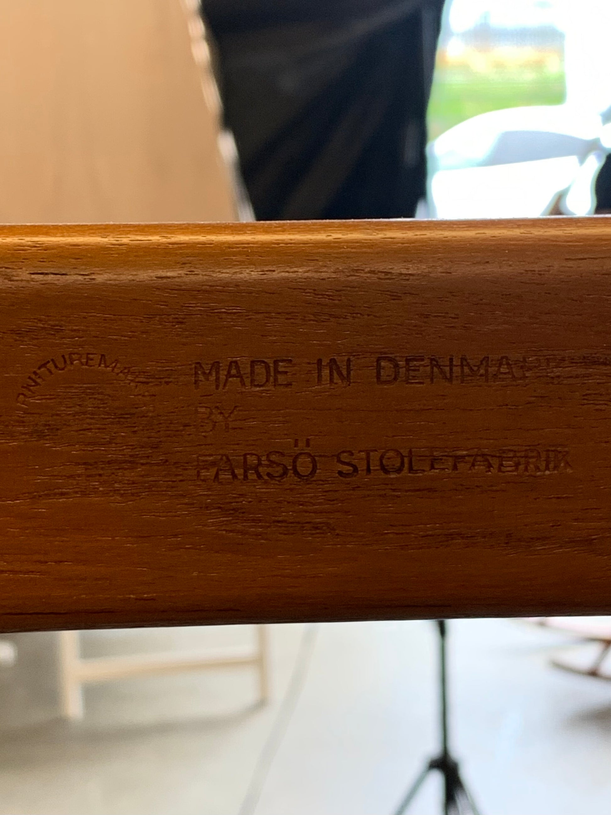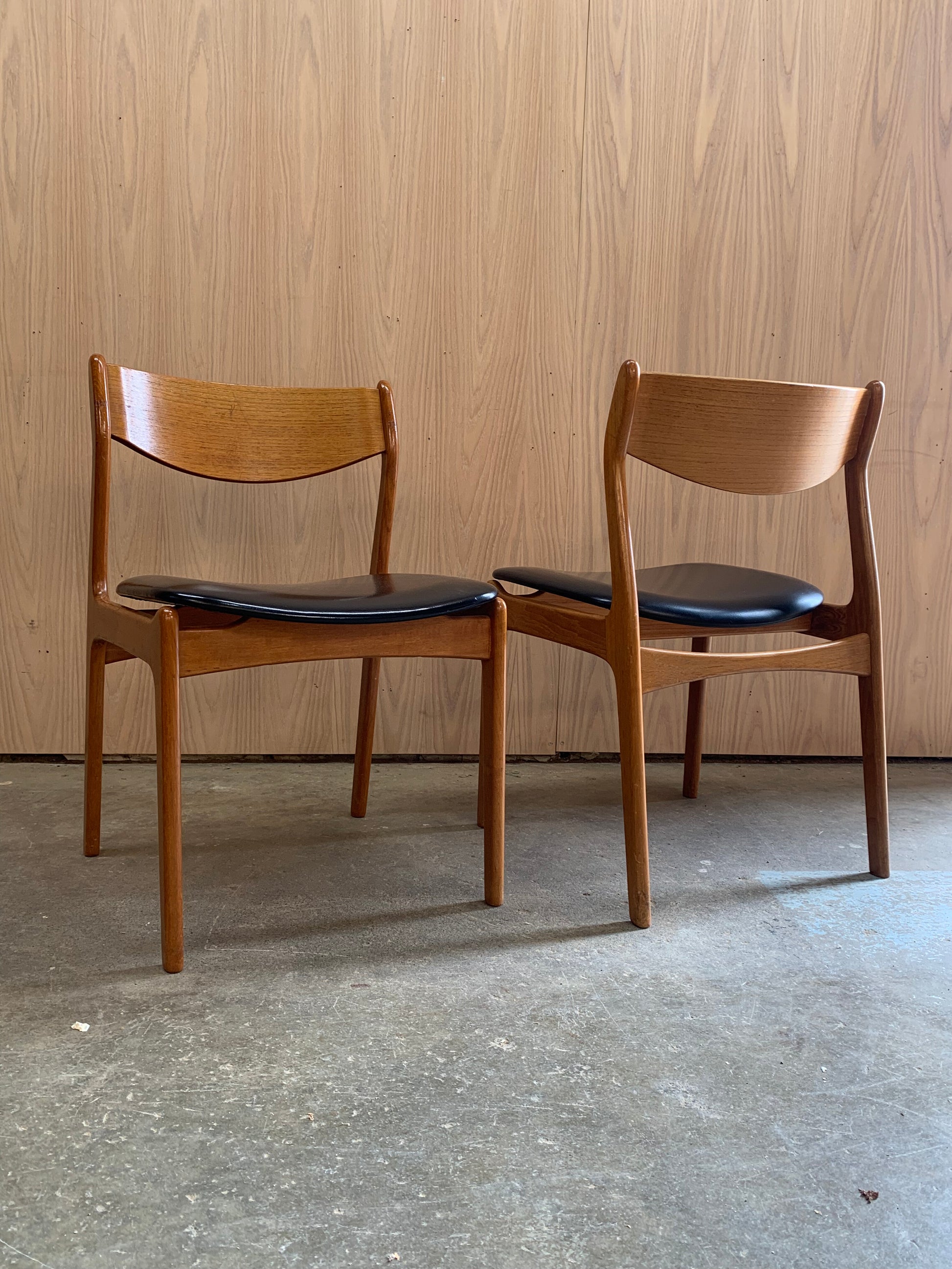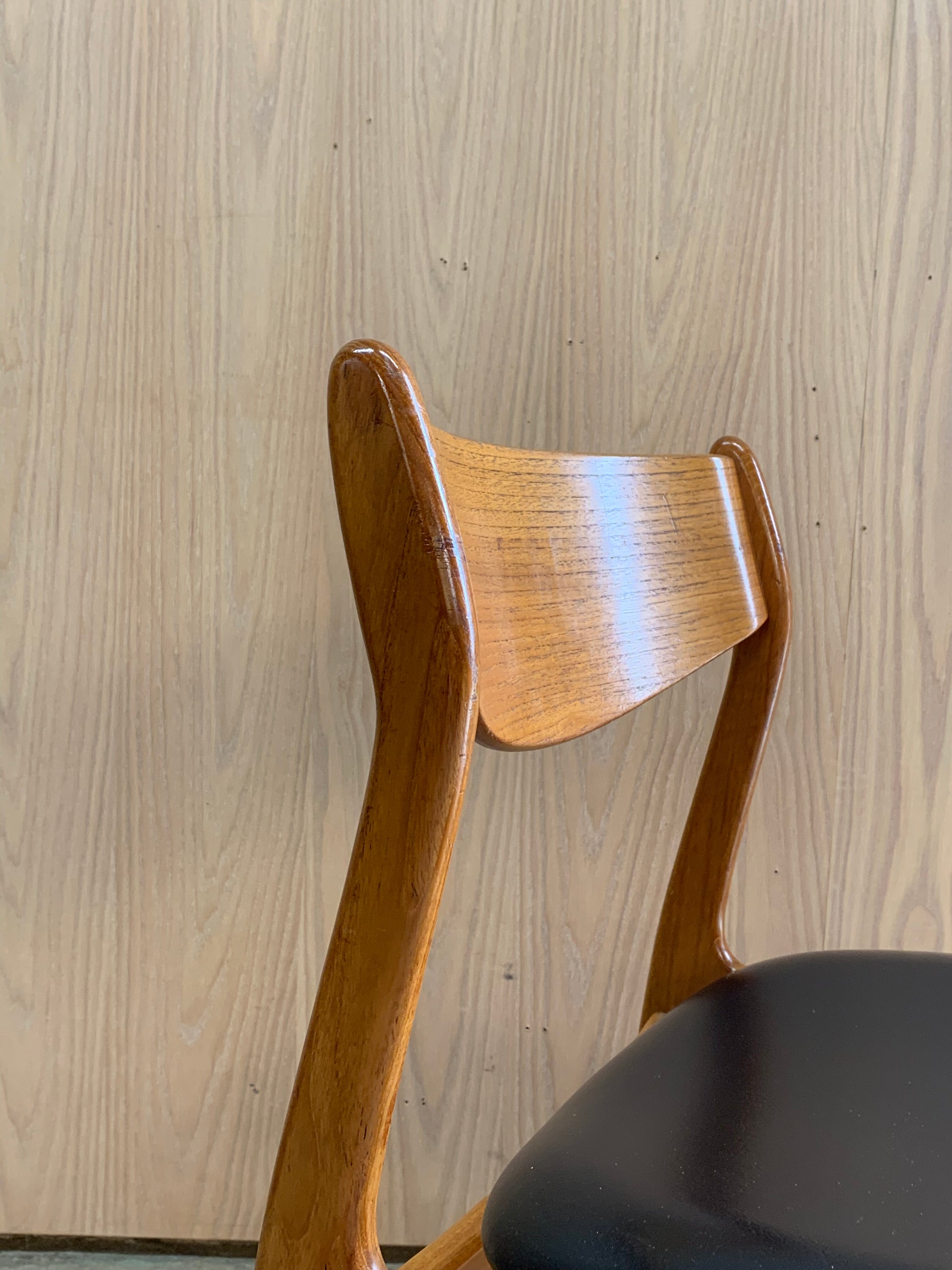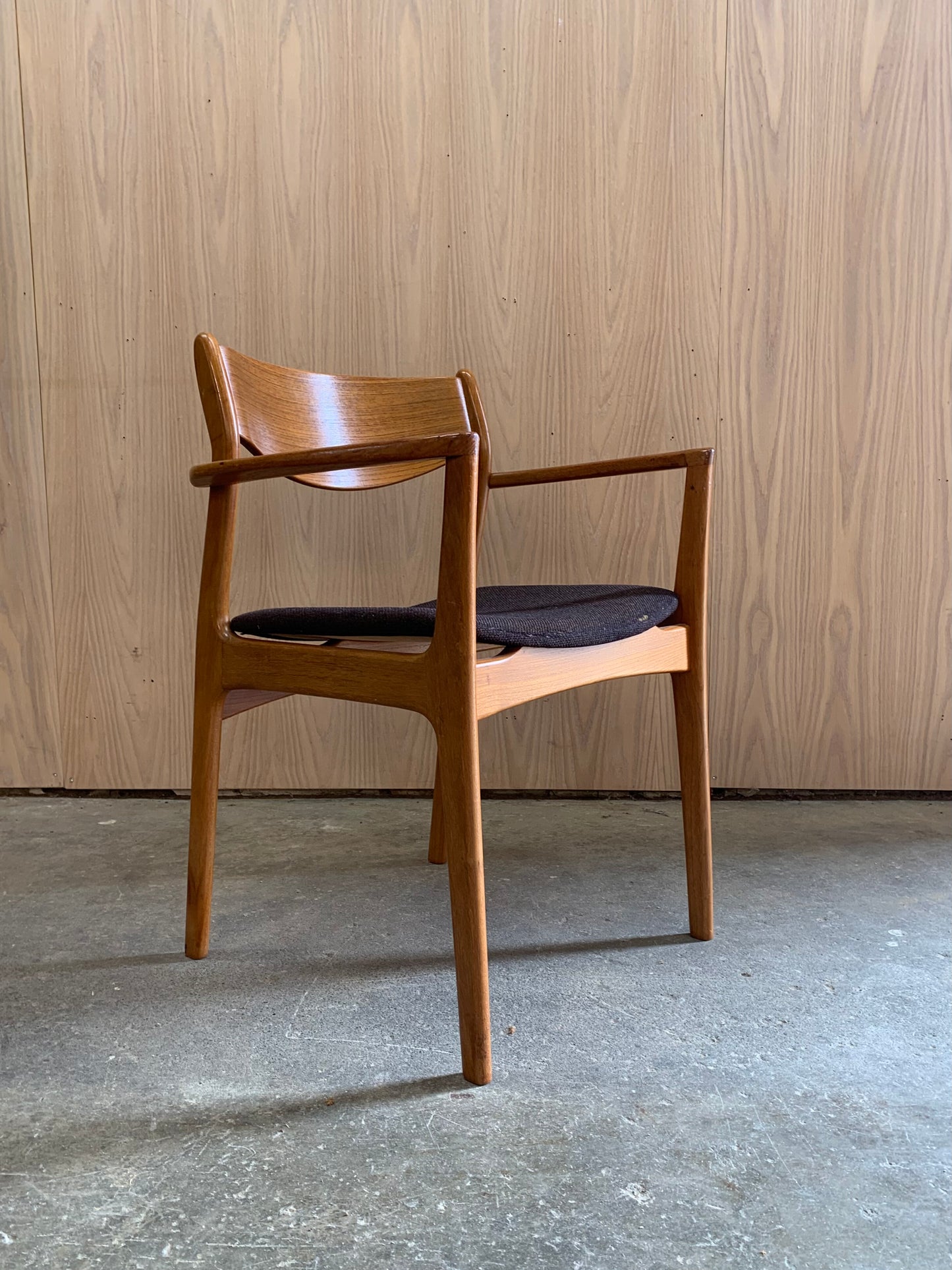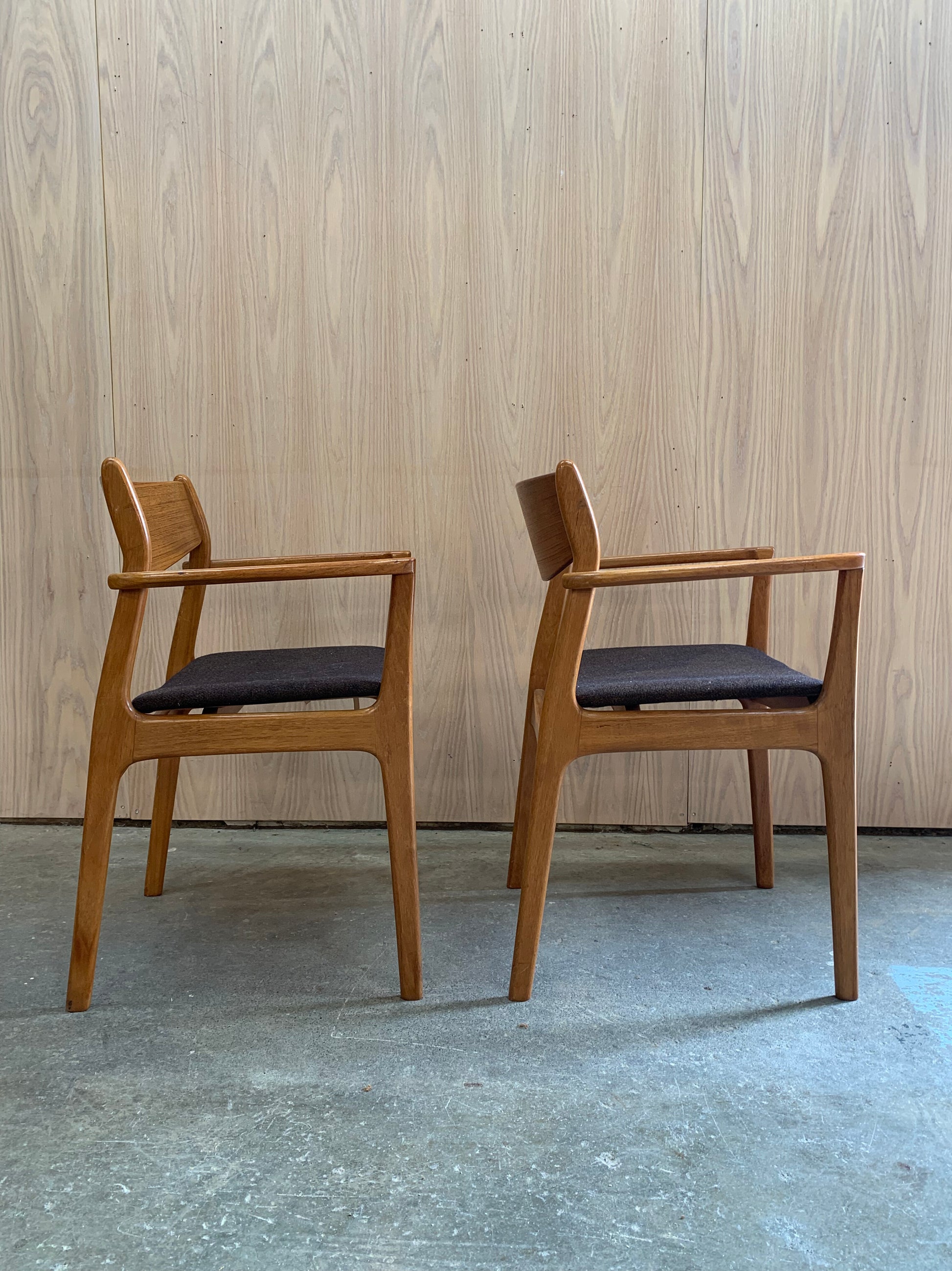 A rare and cohesive set of eight vintage Danish teak dining chairs, including six side chairs and a matching pair of armchairs. The sculptural lines, curved backrests, and solid craftsmanship speak to the timeless elegance of mid-century design. Freshly cleaned and polished, each chair is in excellent condition. Complete original sets like this—especially with armchairs—are increasingly hard to come by. Listing is for the chairs only, but we also have the original solid teak dining table available.
