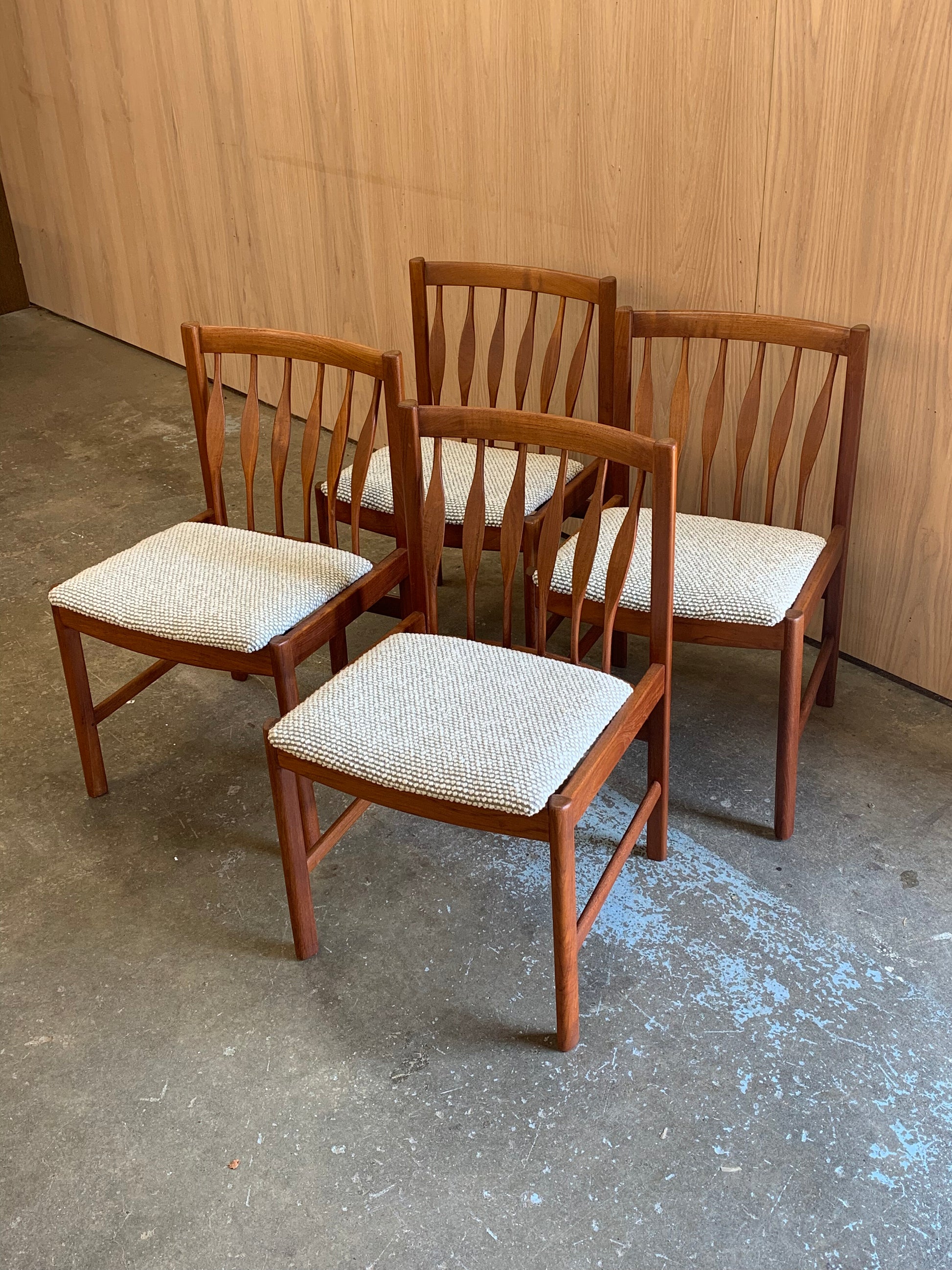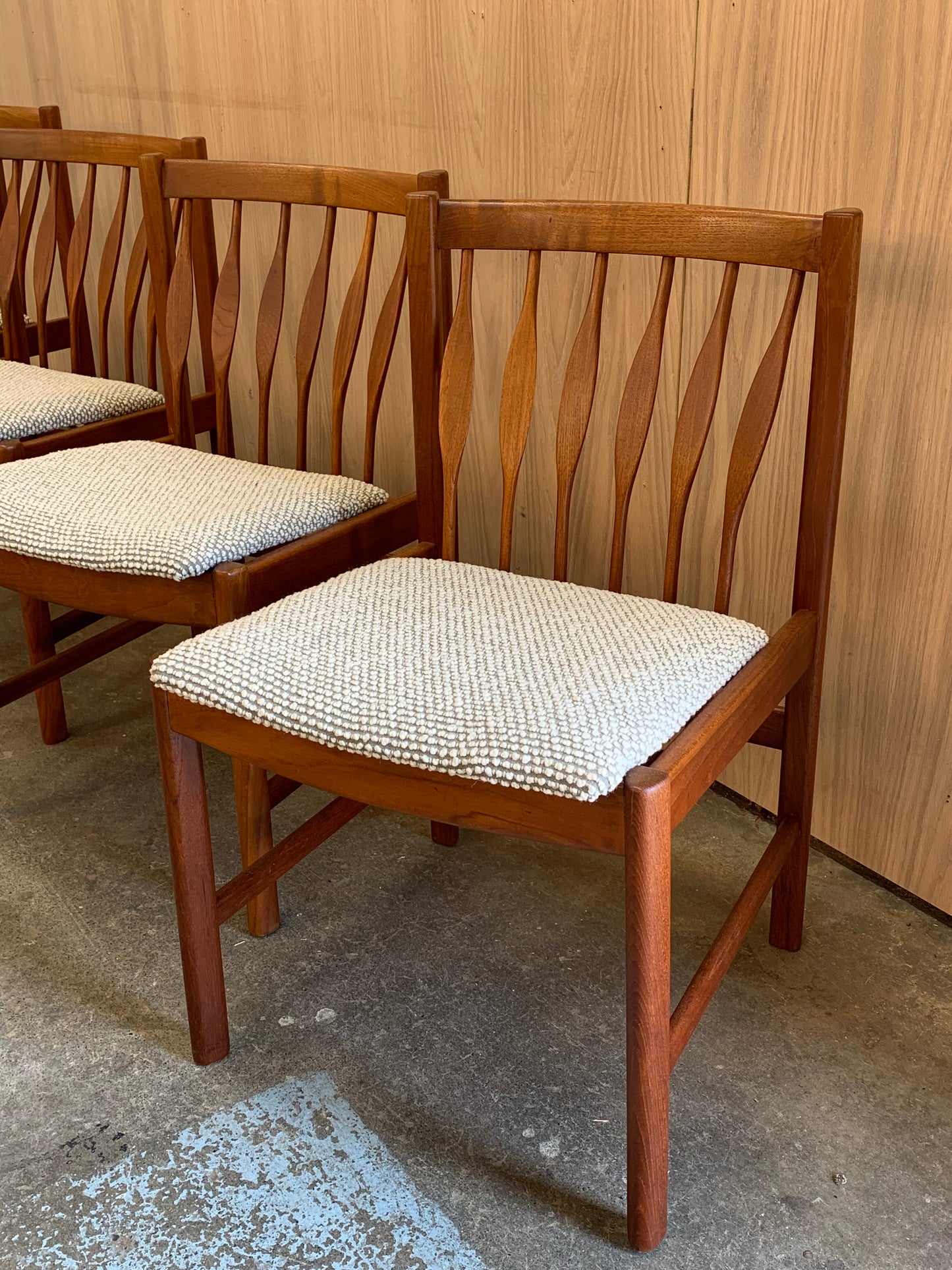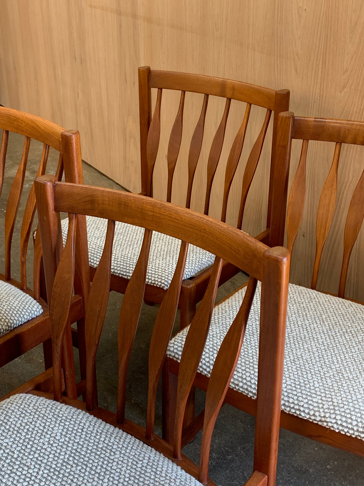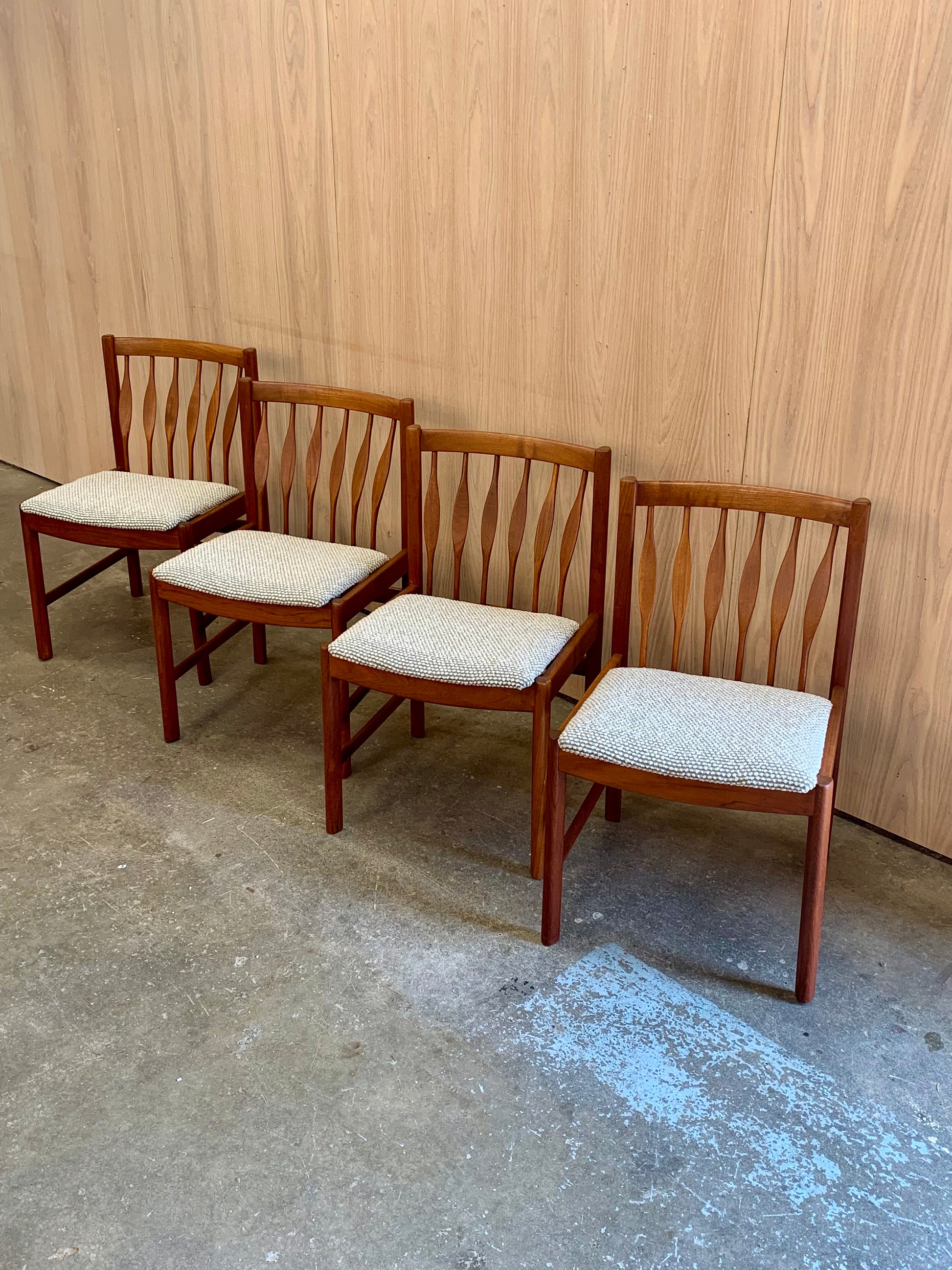 Set of four 1960s teak dining chairs by RS & Associates, crafted in Canada with elegant sculptural lines and signature curved teak slats. The frames have been freshly cleaned and polished by our team to bring out the warmth and grain of the solid teak. Seats are newly upholstered in a premium chunky bouclé fabric, adding rich texture and comfort to their refined silhouette. A timeless blend of craftsmanship and modernist character.