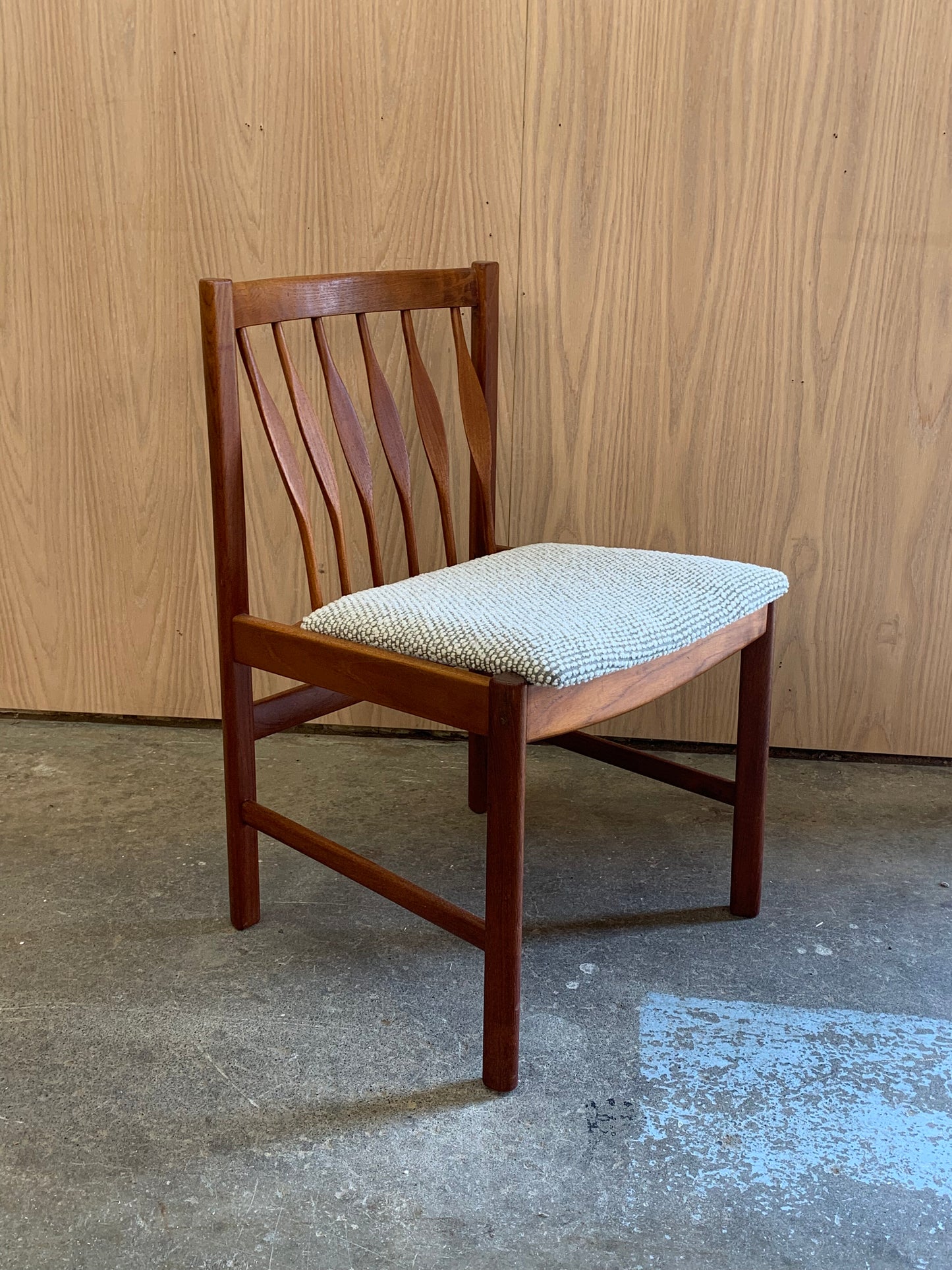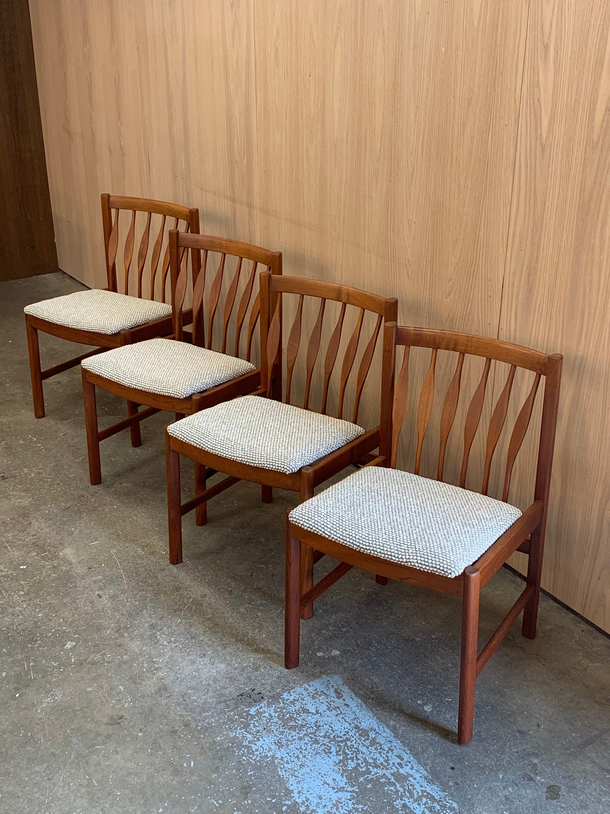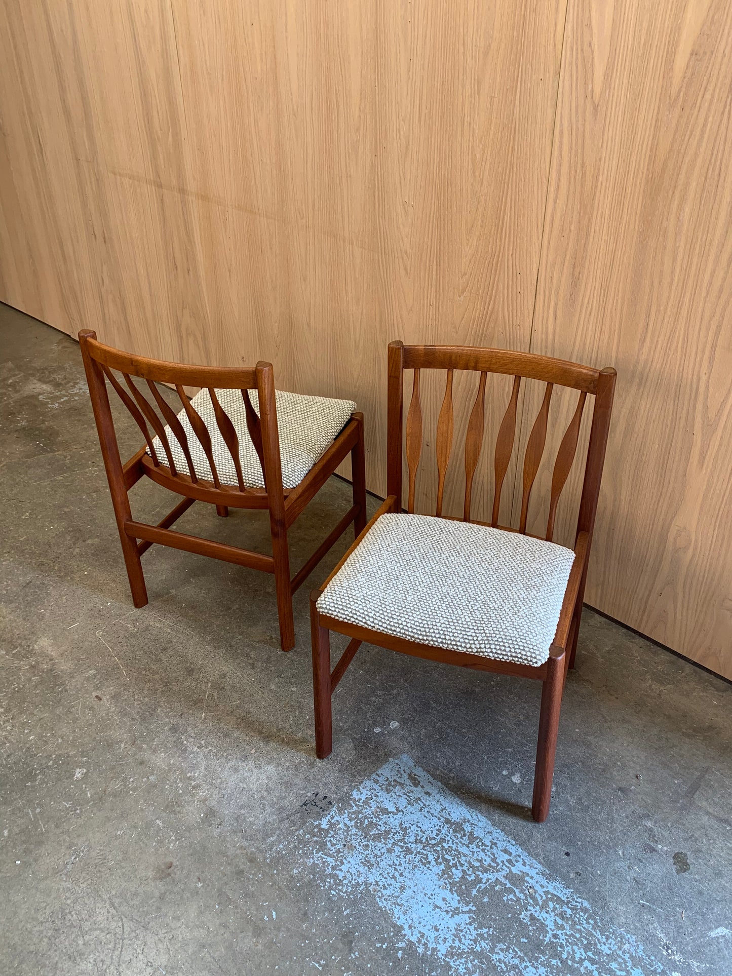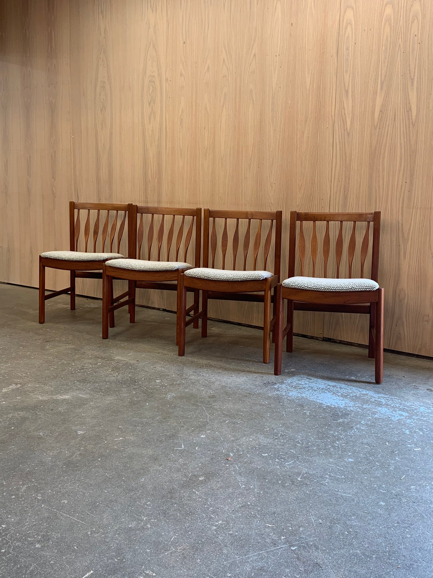 Set of four 1960s teak dining chairs by RS & Associates, crafted in Canada with elegant sculptural lines and signature curved teak slats. The frames have been freshly cleaned and polished by our team to bring out the warmth and grain of the solid teak. Seats are newly upholstered in a premium chunky bouclé fabric, adding rich texture and comfort to their refined silhouette. A timeless blend of craftsmanship and modernist character.