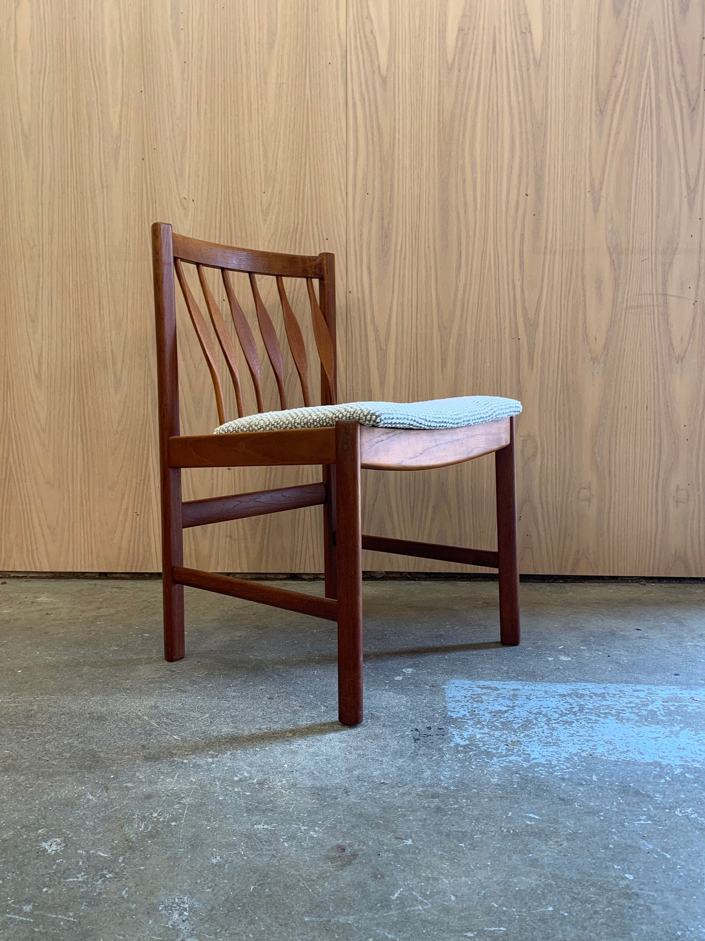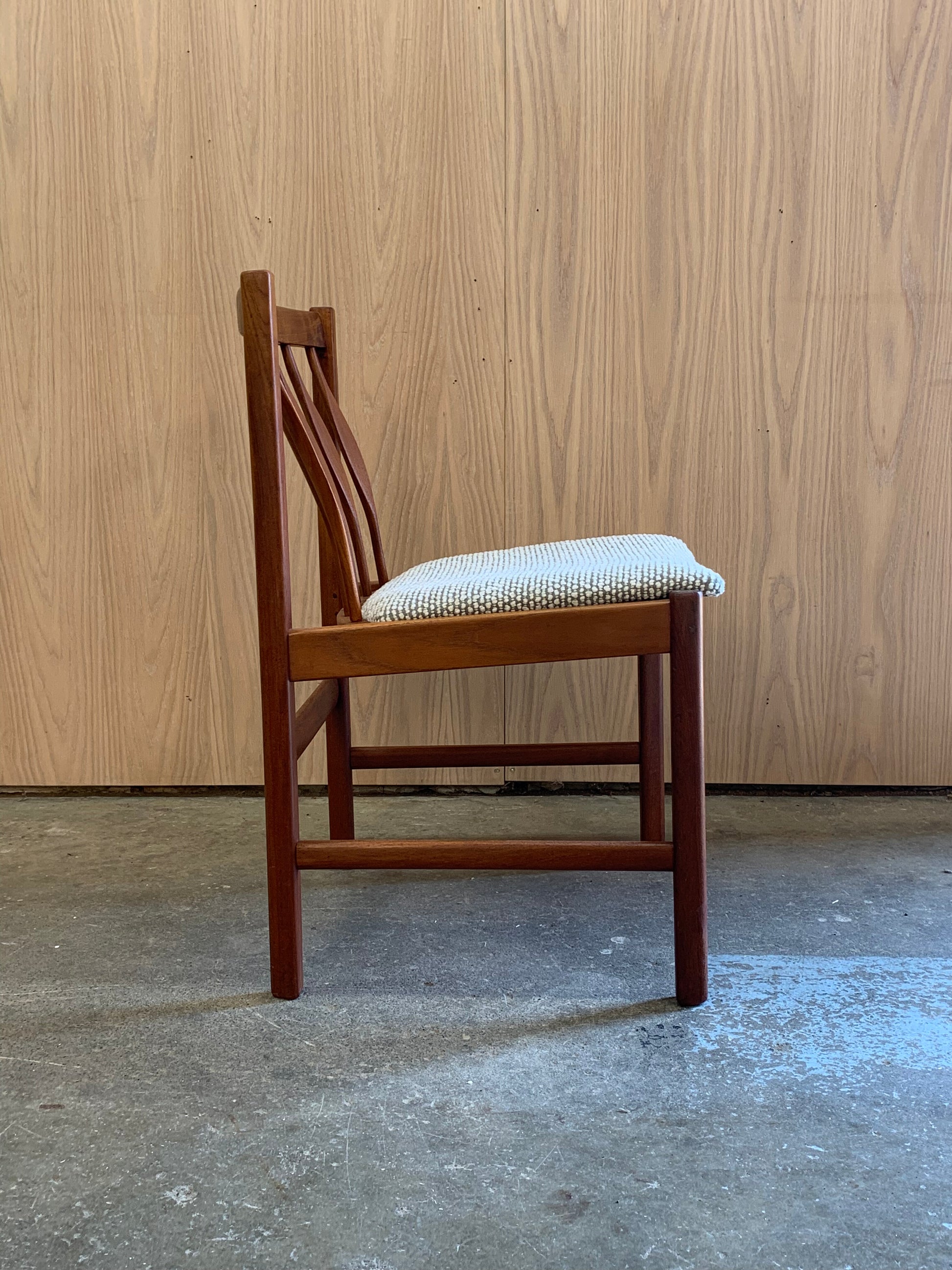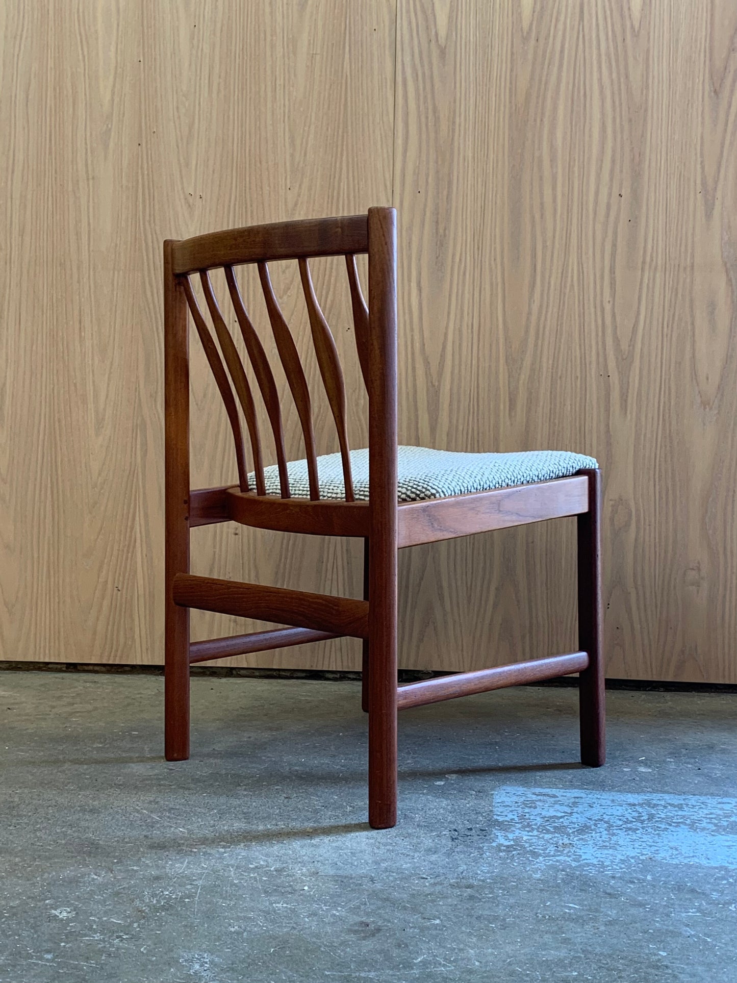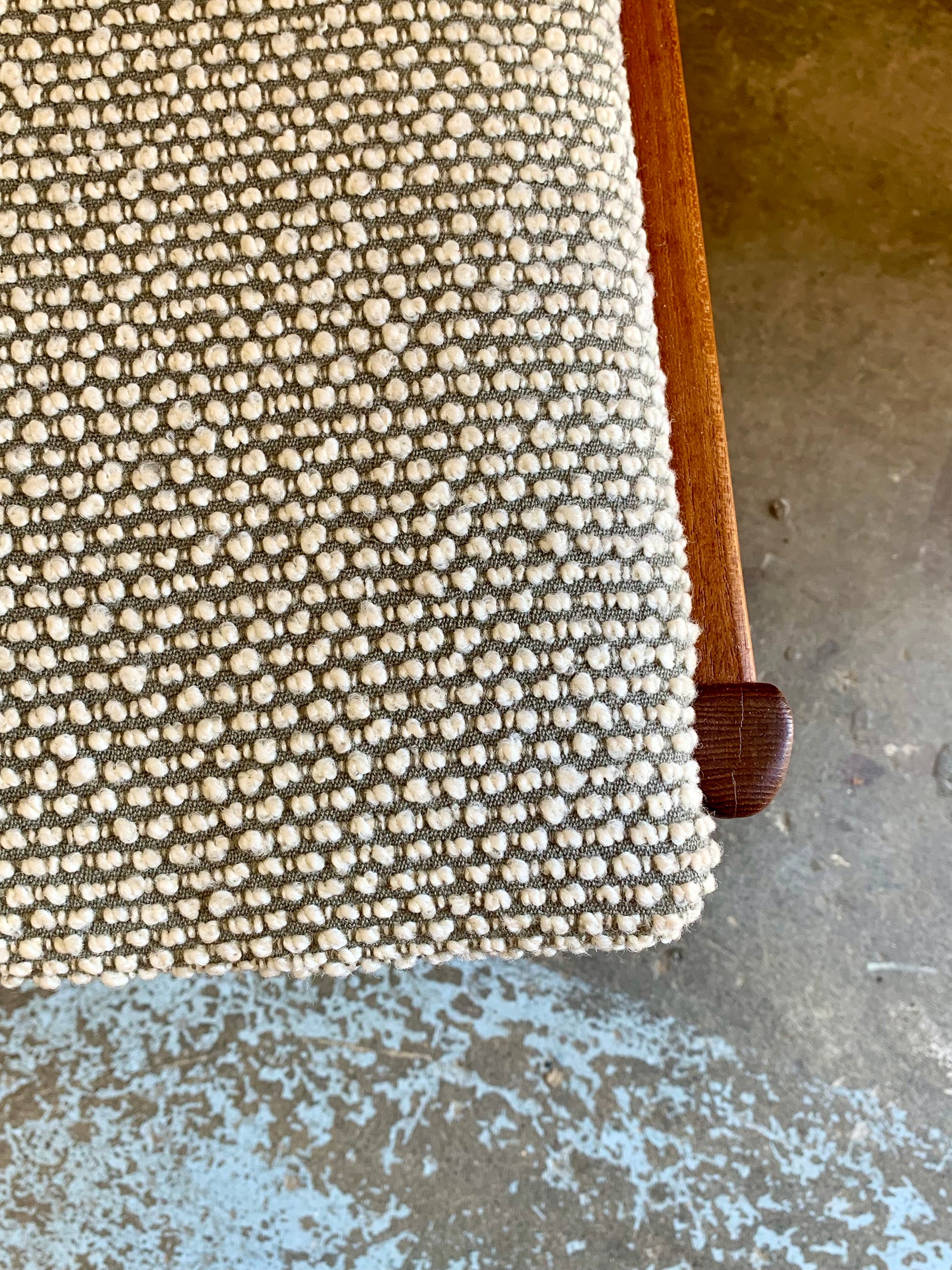 Set of four 1960s teak dining chairs by RS & Associates, crafted in Canada with elegant sculptural lines and signature curved teak slats. The frames have been freshly cleaned and polished by our team to bring out the warmth and grain of the solid teak. Seats are newly upholstered in a premium chunky bouclé fabric, adding rich texture and comfort to their refined silhouette. A timeless blend of craftsmanship and modernist character.