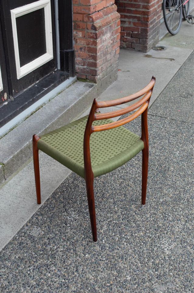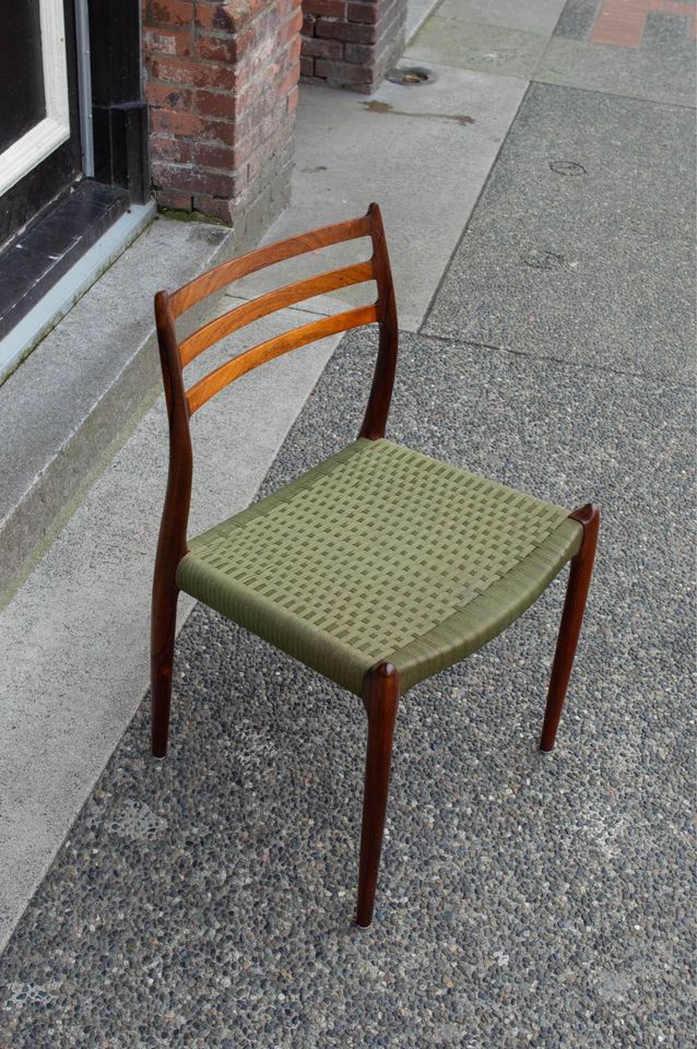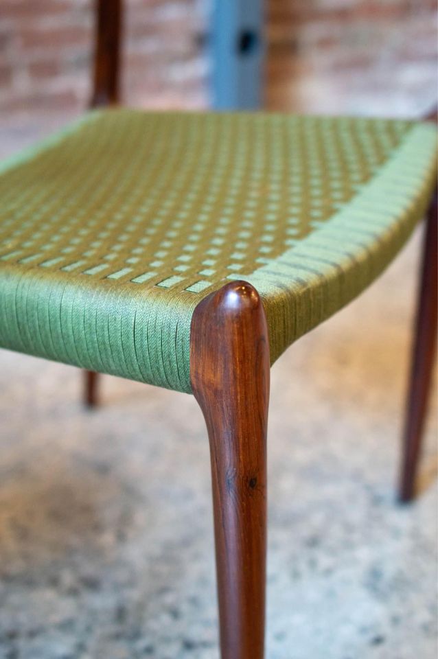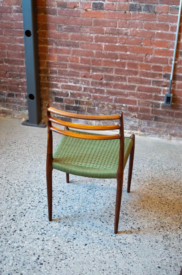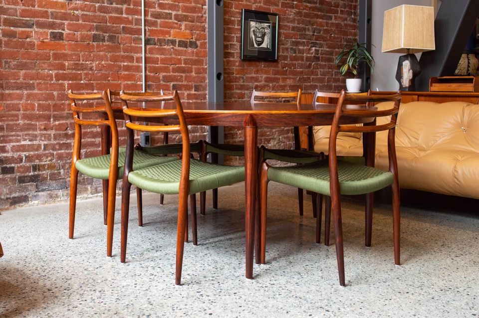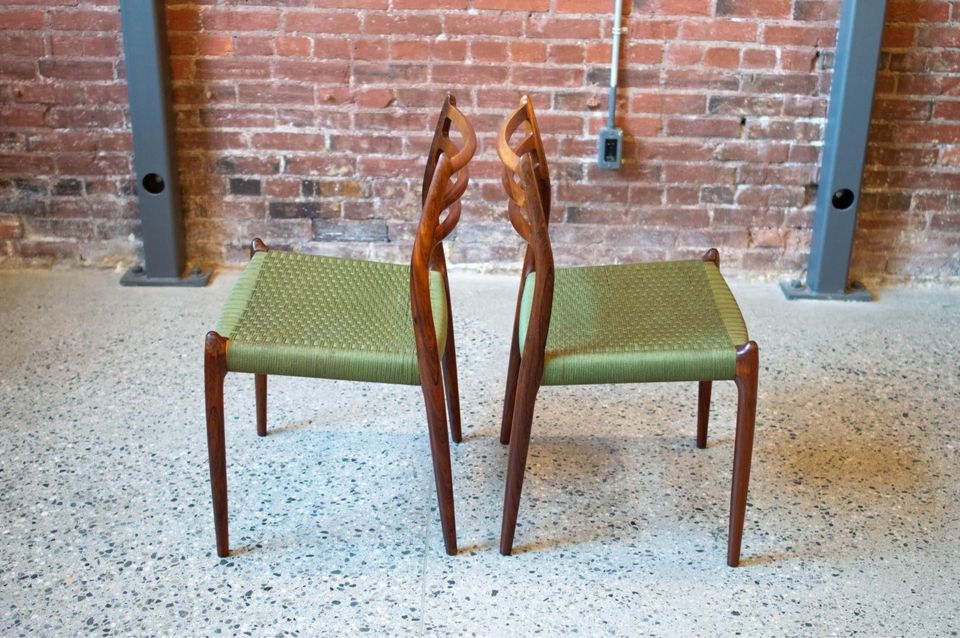 During our career, we've made some remarkable discoveries in dining chairs, but few match the excitement of finding this exquisite set of Model 78 chairs designed by Niels Møller in the 1960s. Fashioned from solid Brazilian rosewood, the rarity of this collection is enhanced by the striking original green cording, making it truly unique—the sole set with this cord available on Earth. Each chair bears the maker's mark, maintains its stunning original finish, and is impeccably preserved, marking a testament to its exceptional condition.