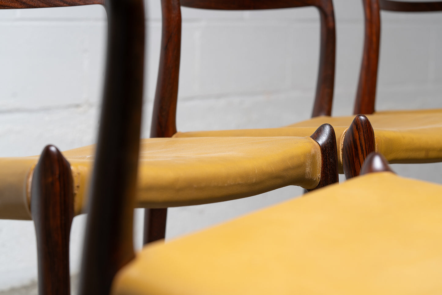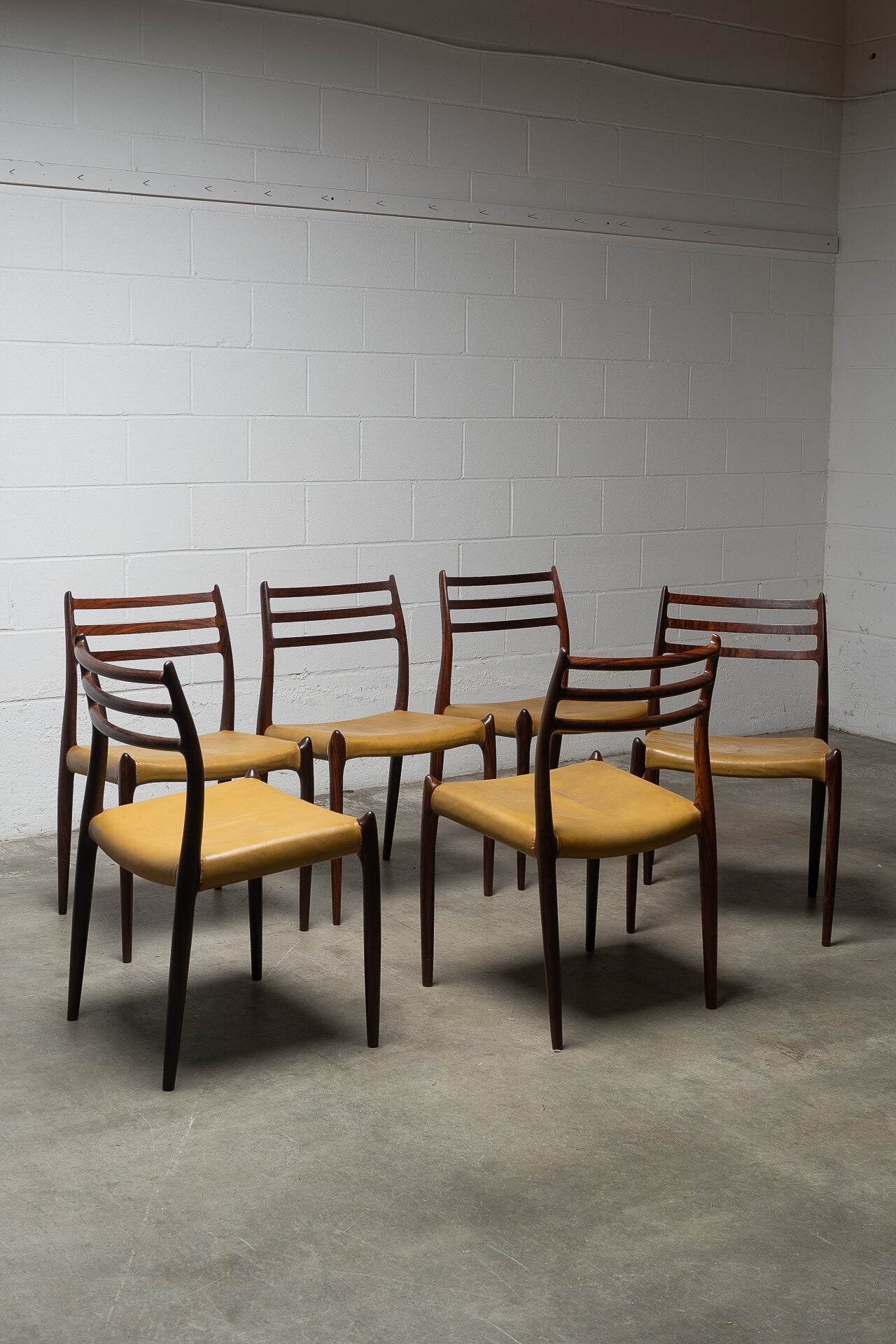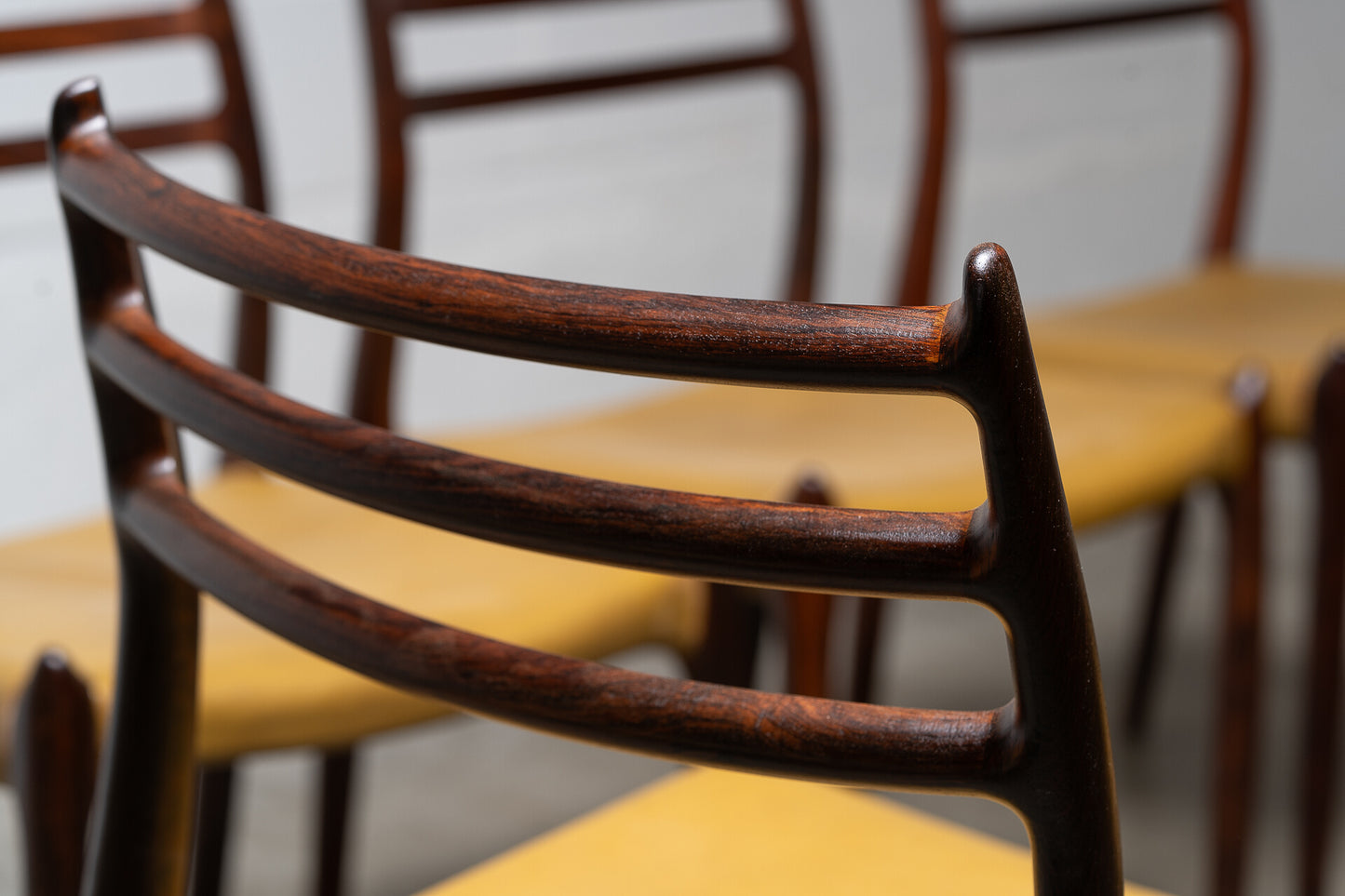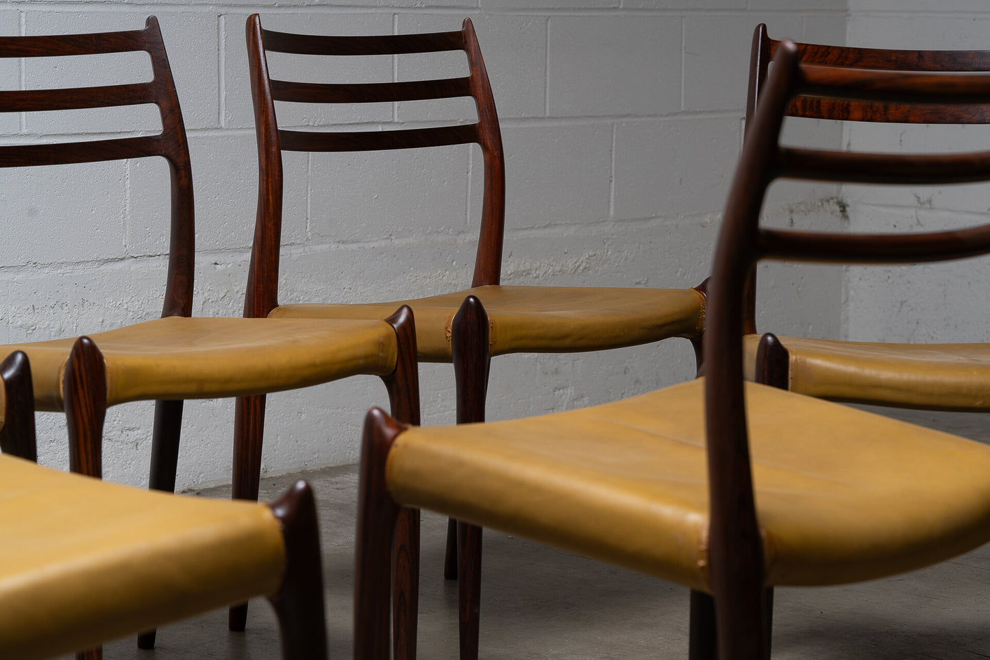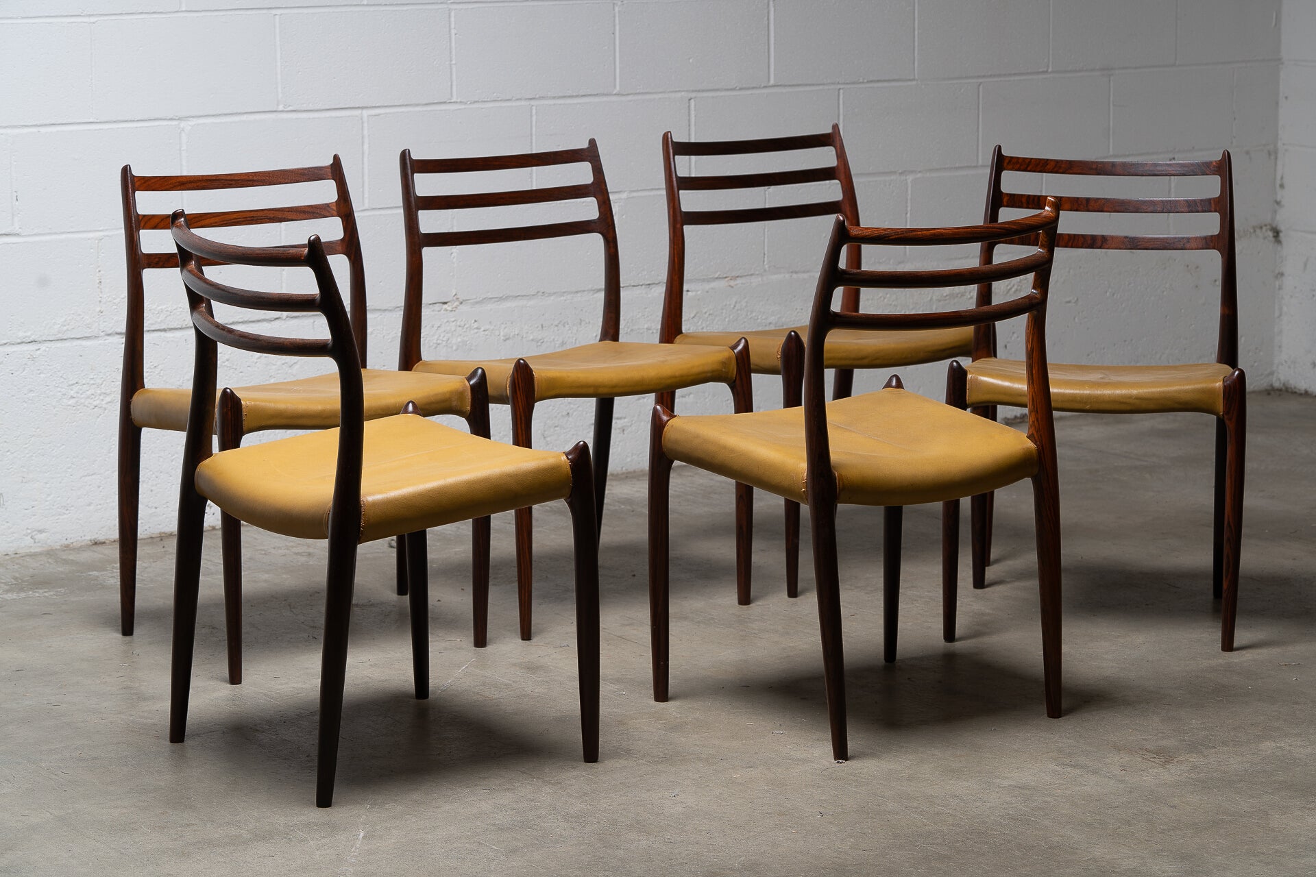 Crafted in the 1960s by Danish master Niels Otto Møller for J.L. Møllers Møbelfabrik, this rare set of six Model 78 side chairs is among the most coveted designs of the Danish modern era. Sculptural, refined, and effortlessly elegant, these chairs are celebrated for their ergonomic form and seamless joinery.
