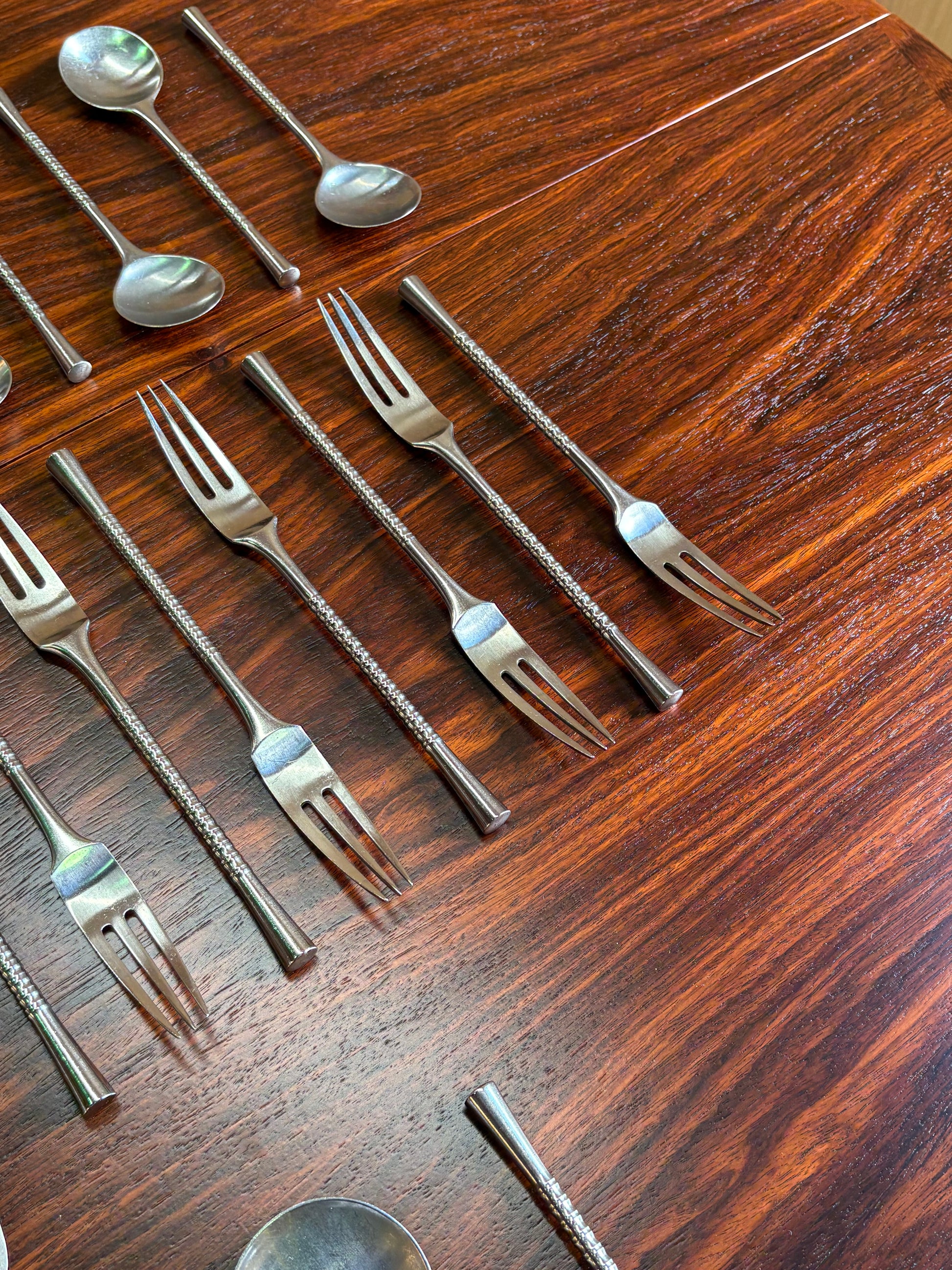 A classic Danish modern flatware set from the Jette series, designed by Jens Quistgaard for Dansk and produced in Finland. Executed in stainless steel, the design is defined by slim, sculptural forms and subtly textured handles that add tactility without excess.